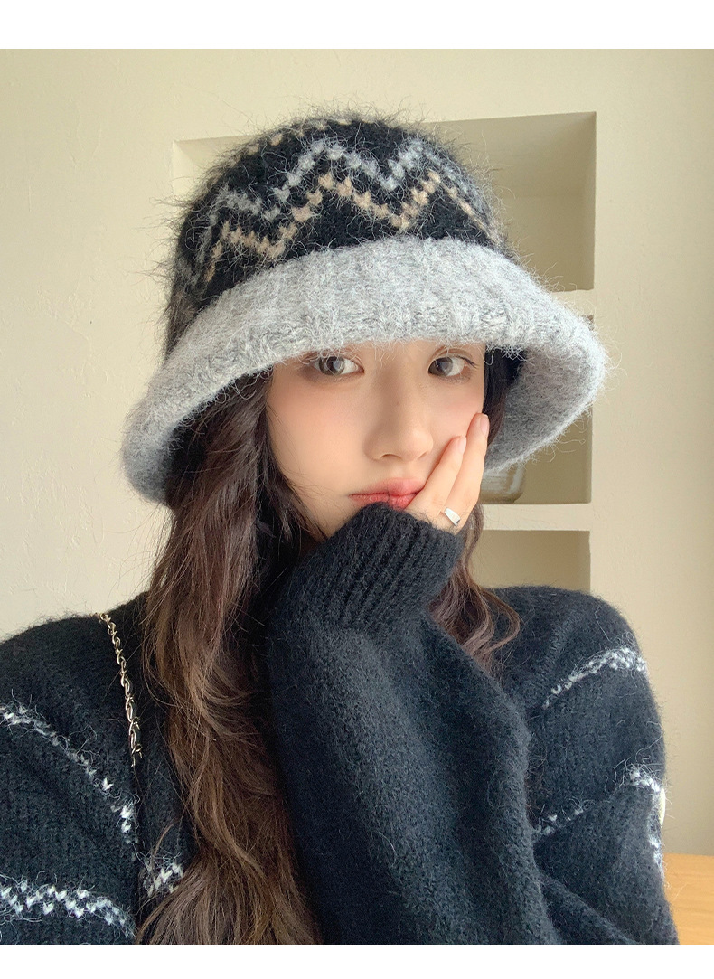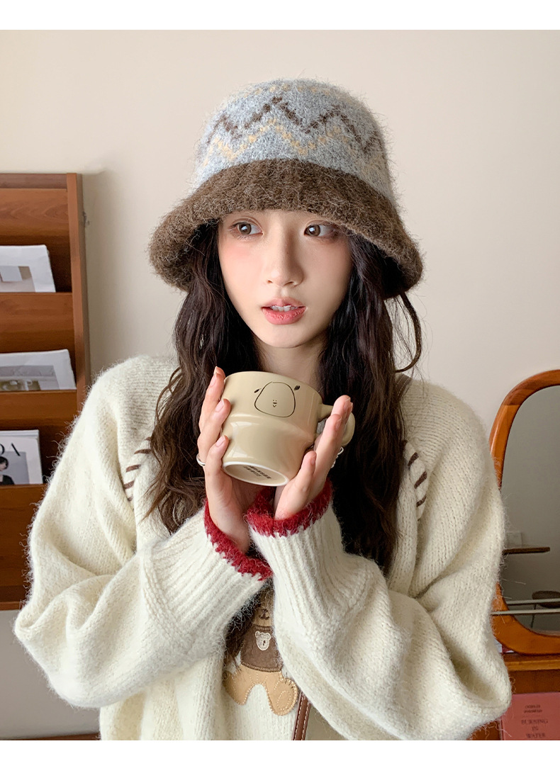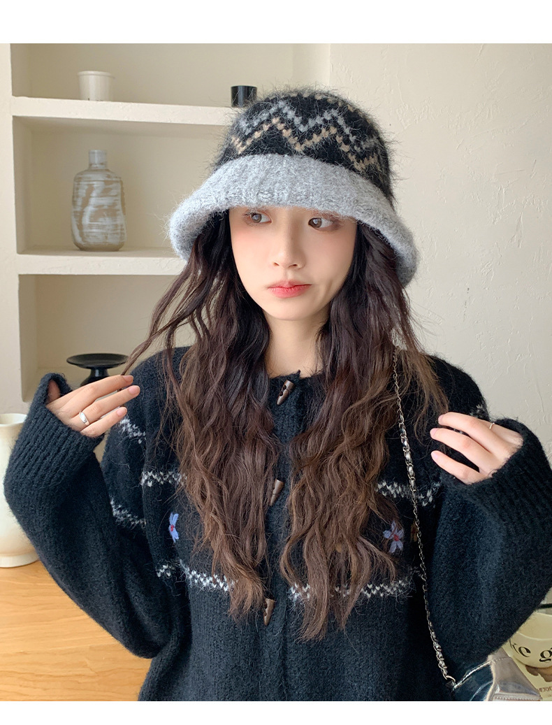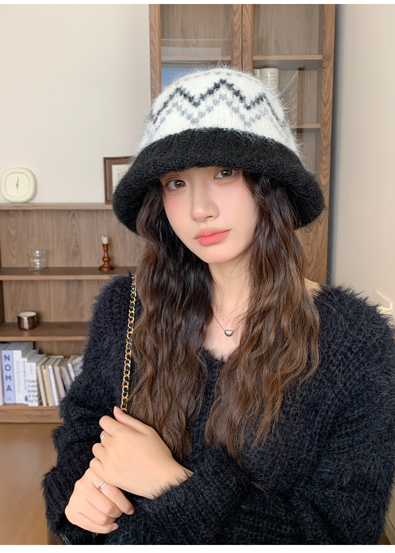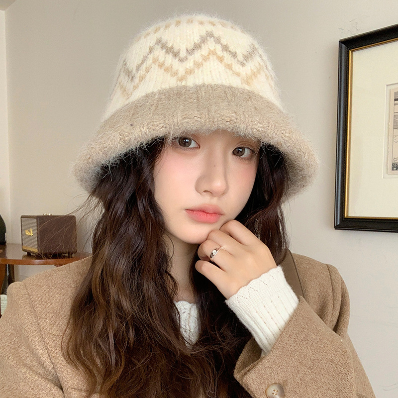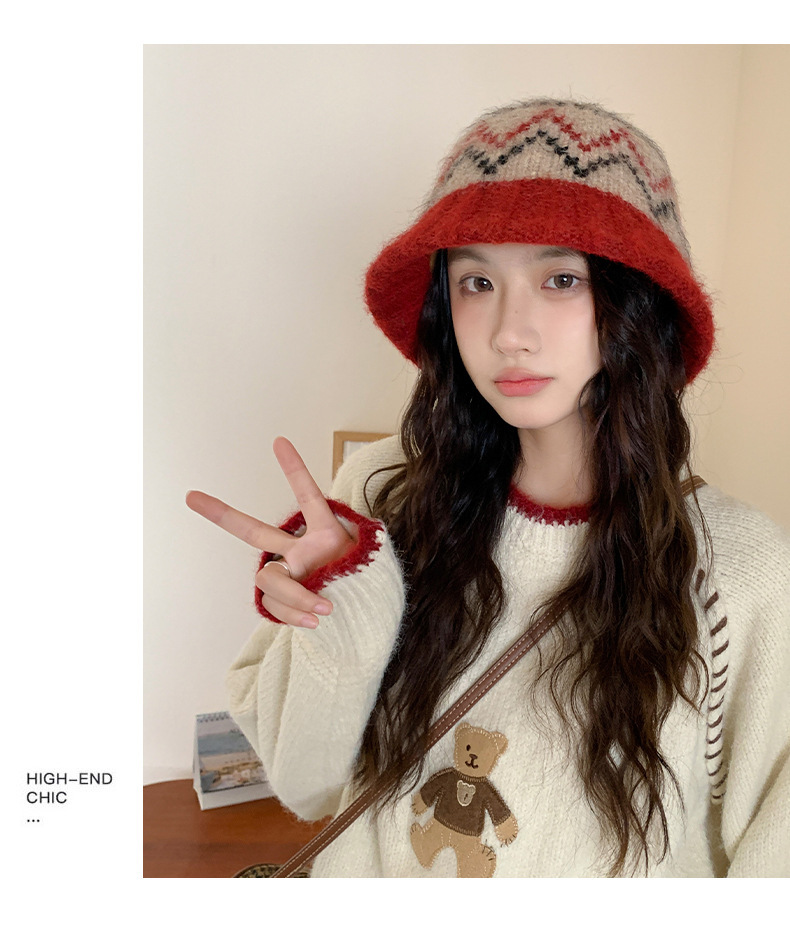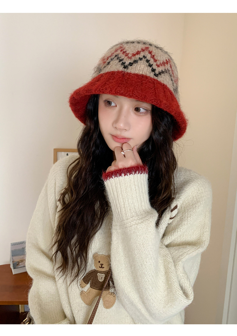 겨울 여성용 페어 아일 컬러 블록 니트 버킷 모자, 복고풍 다용도 따뜻한 분지 모자, 한국식 얼굴이 보이는 작은 모직 모자