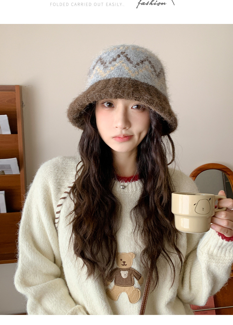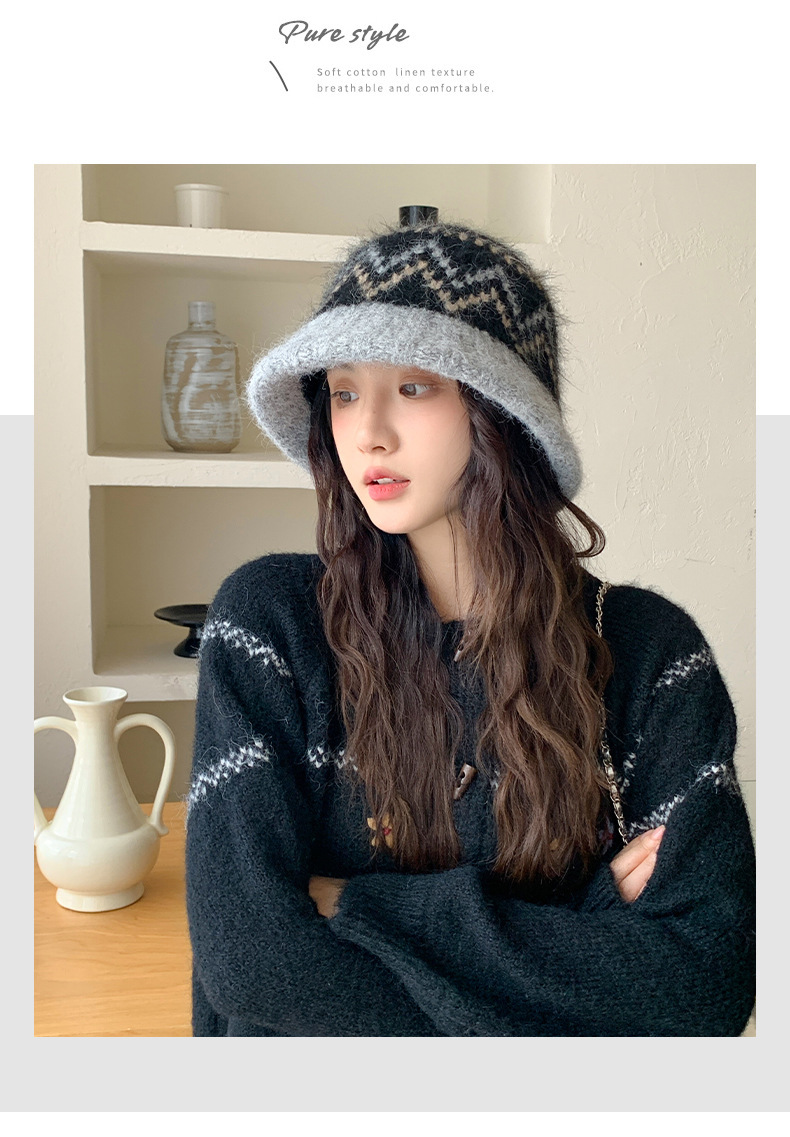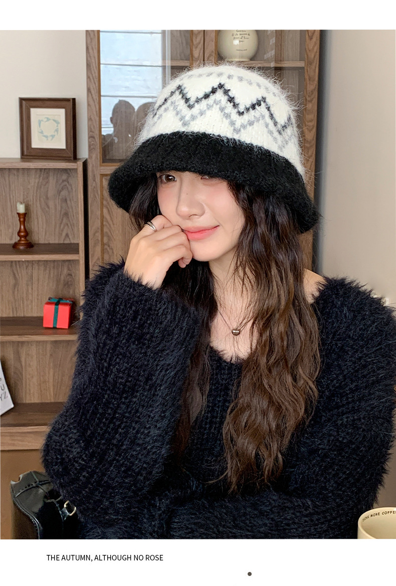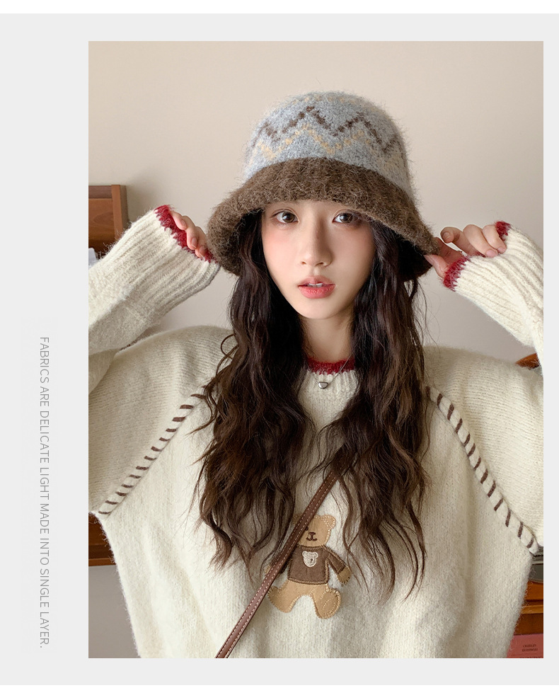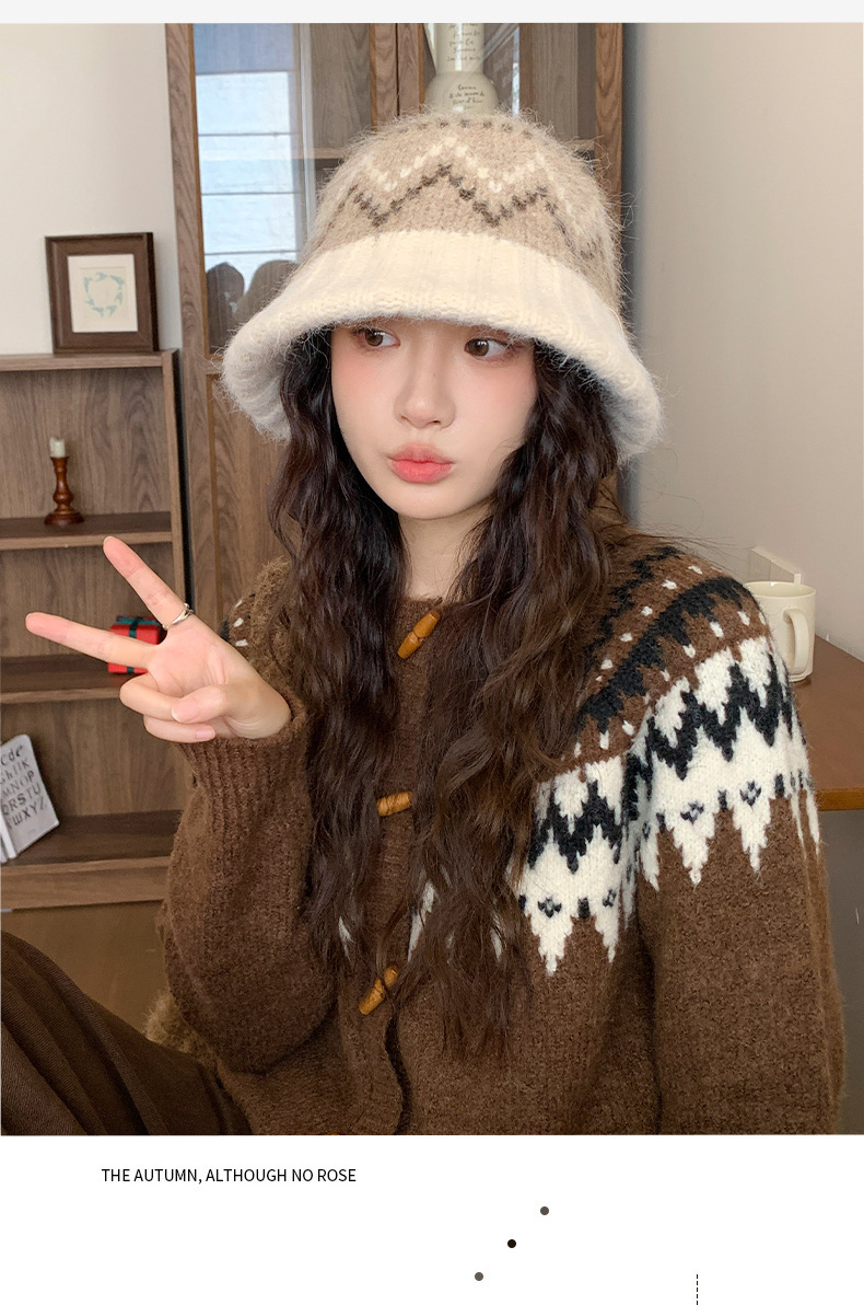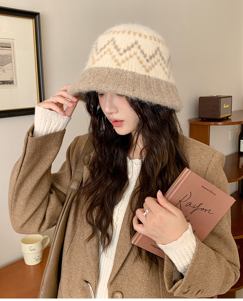 겨울 여성용 페어 아일 컬러 블록 니트 버킷 모자, 복고풍 다용도 따뜻한 분지 모자, 한국식 얼굴이 보이는 작은 모직 모자