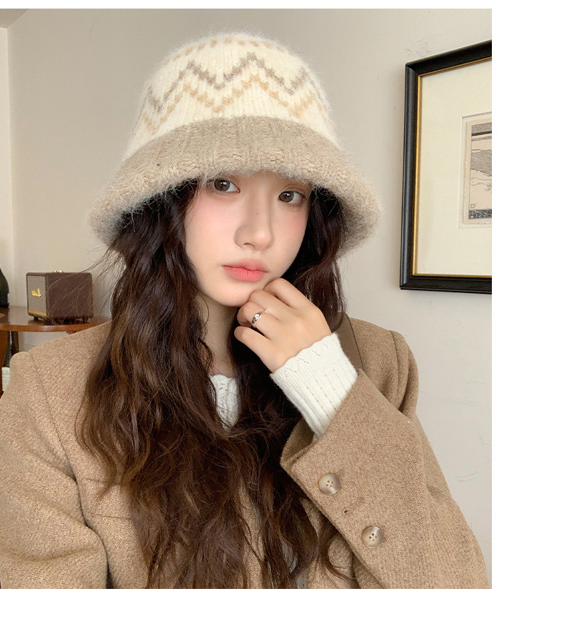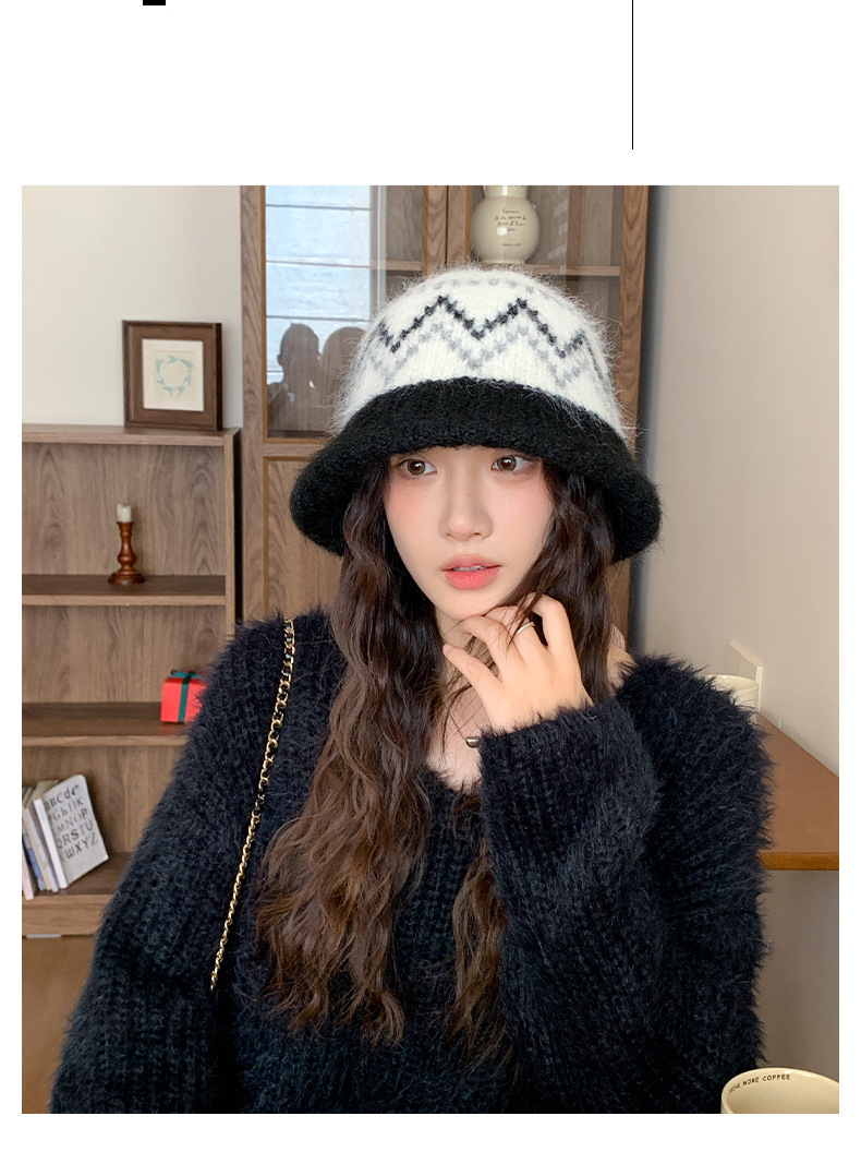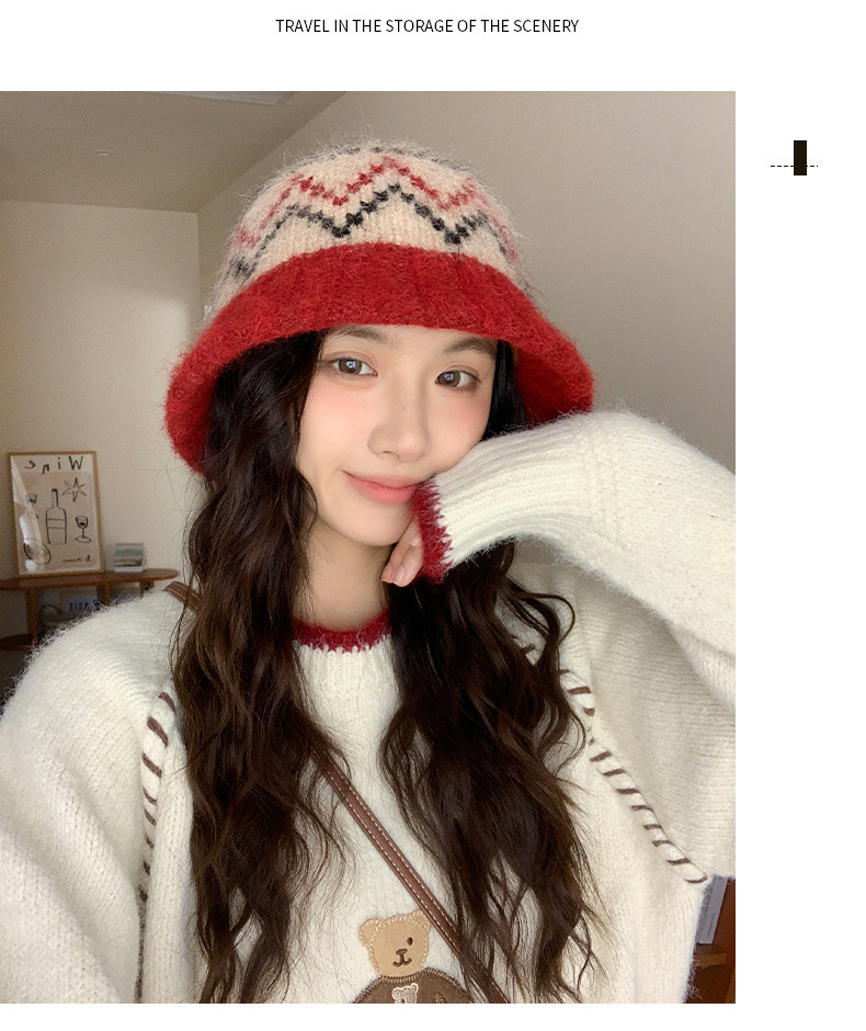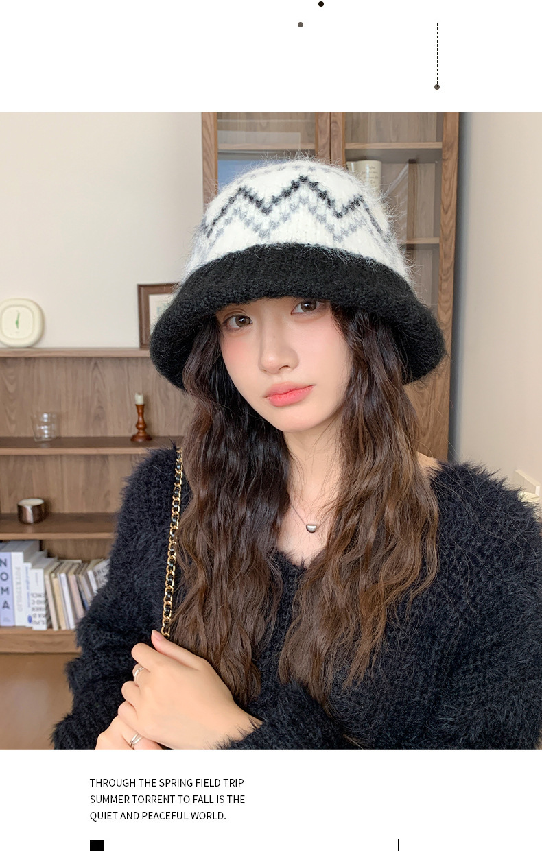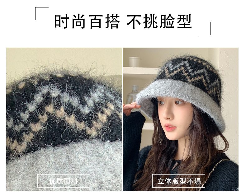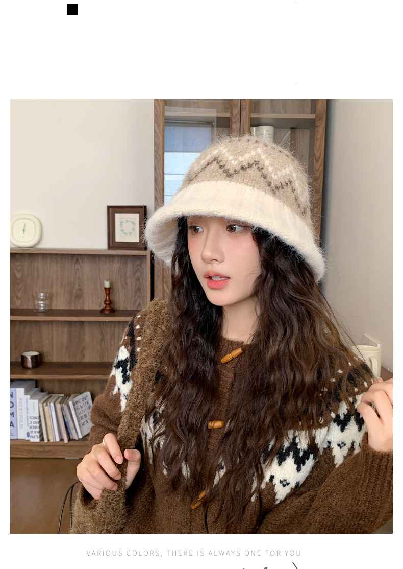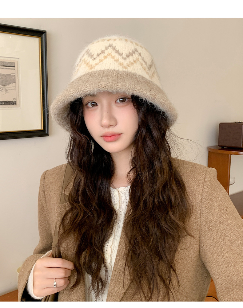 겨울 여성용 페어 아일 컬러 블록 니트 버킷 모자, 복고풍 다용도 따뜻한 분지 모자, 한국식 얼굴이 보이는 작은 모직 모자