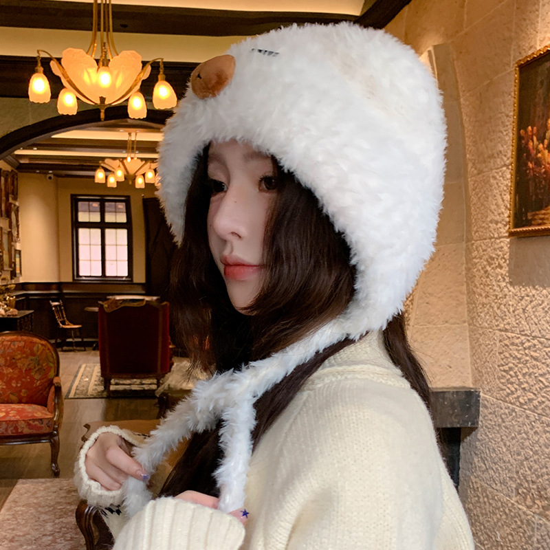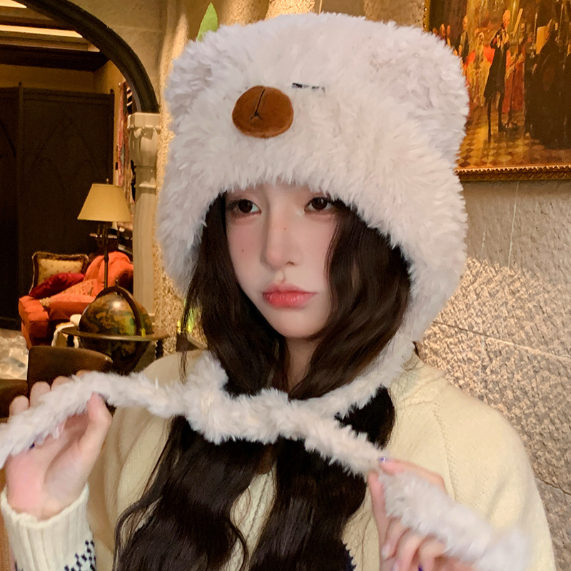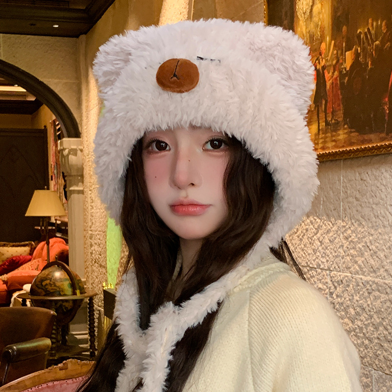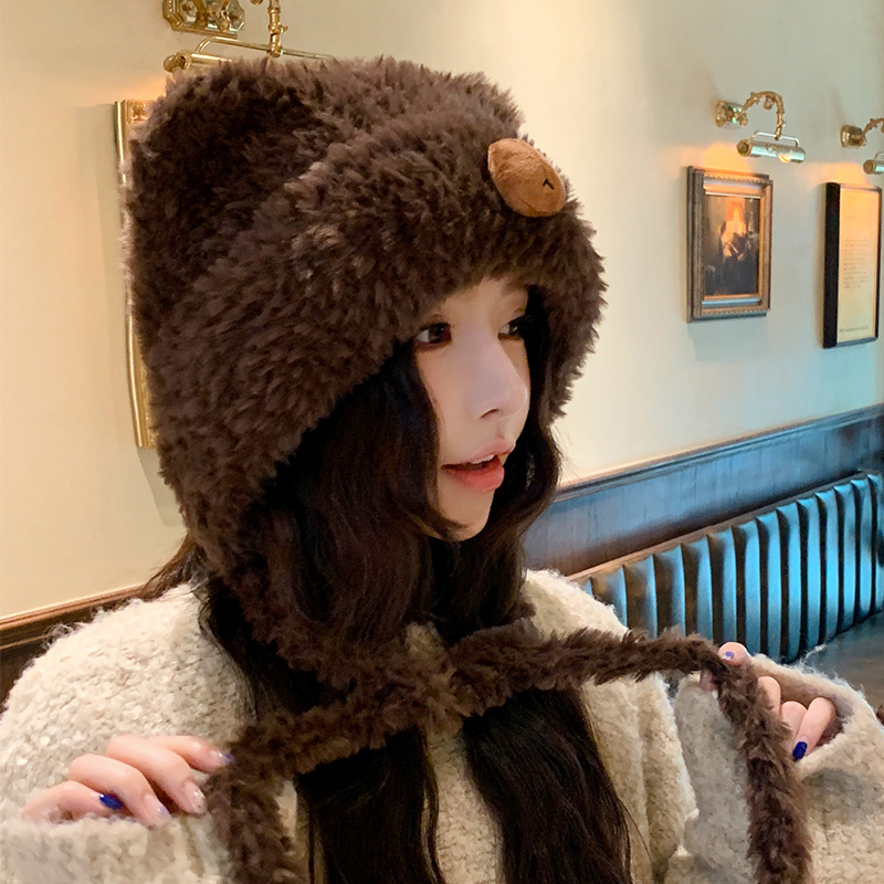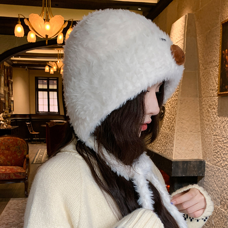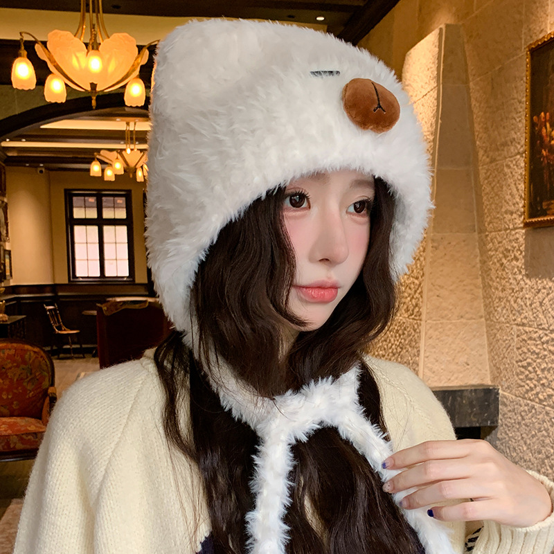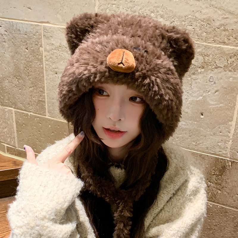 가을 겨울 여성용 카피바라 플러시 모자 일본식 큰 머리 귀 보호 니트 레이펑 모자 사이클링 방한 모자
