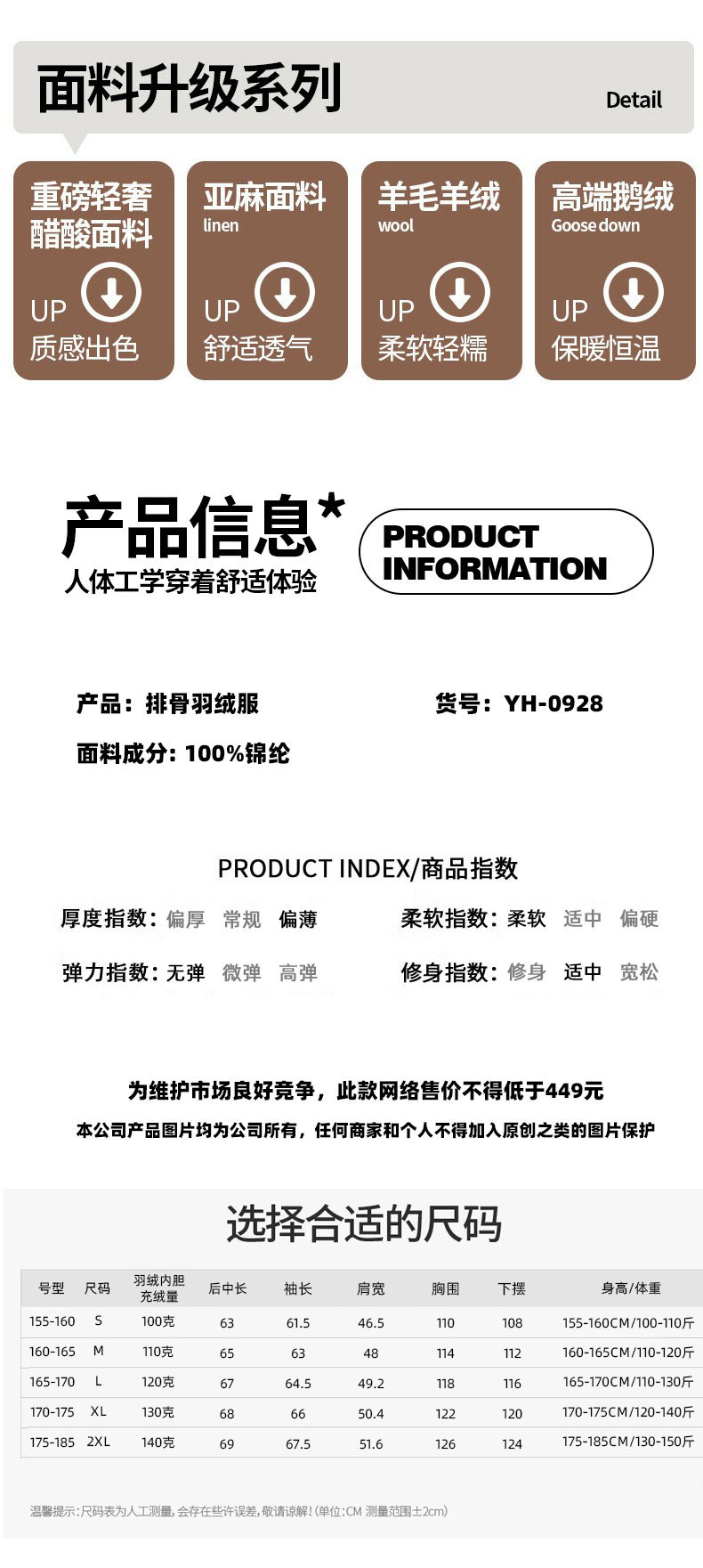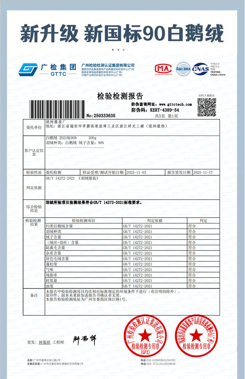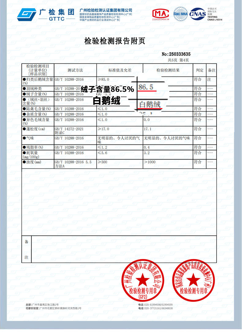 | 填充物 | 白鹅绒 | 含绒量 | 86%~90% |
