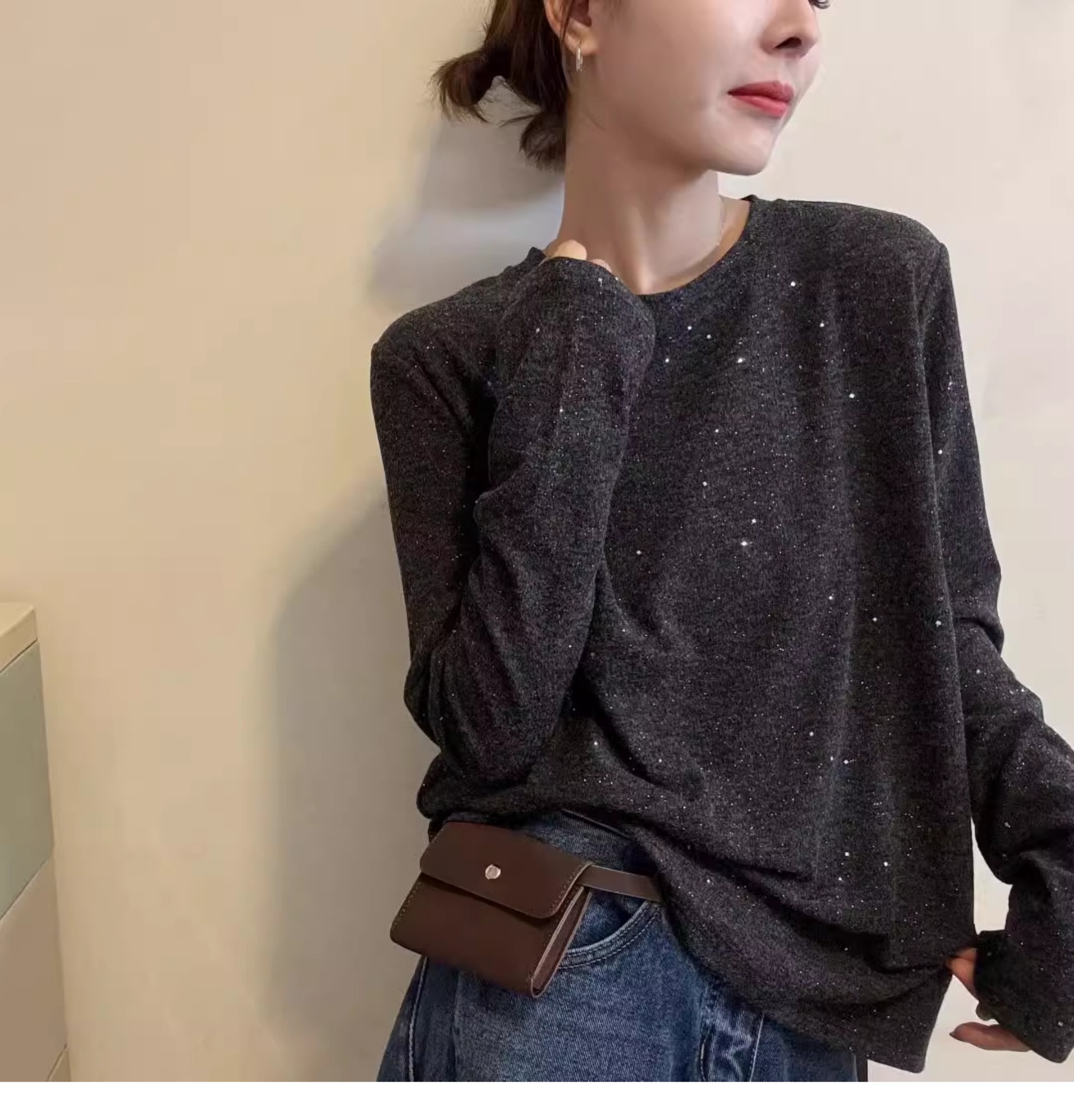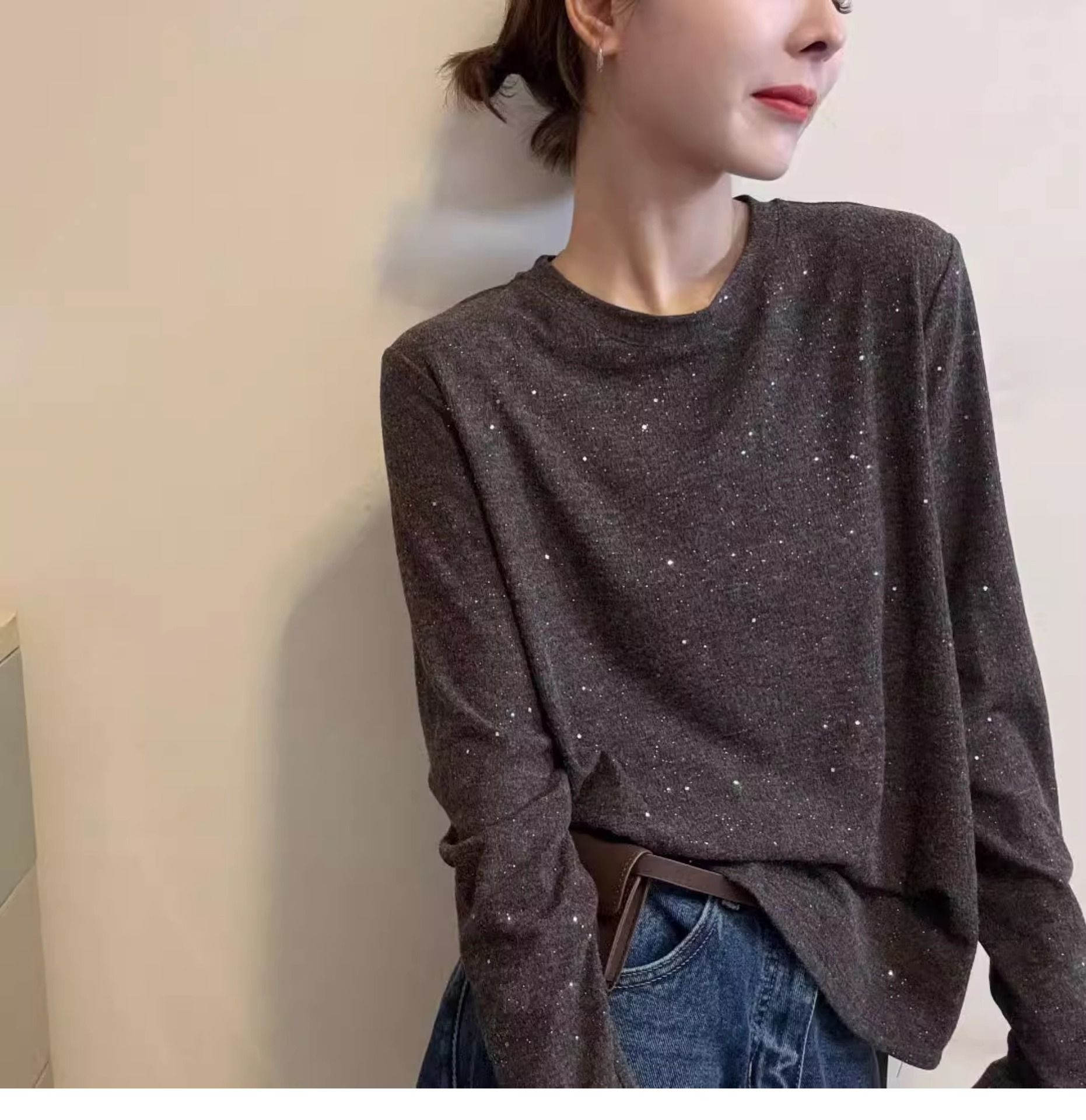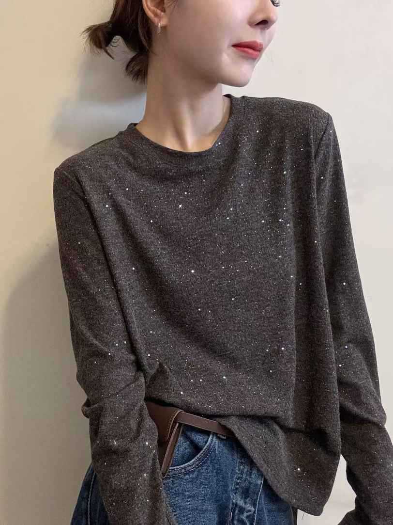여성을위한 미국 복고풍 라운드 넥 긴팔 티셔츠 2025 봄, 가을 새로운 스타일 느슨한 슬리밍 서양식 연령 감소 바닥 셔츠 탑