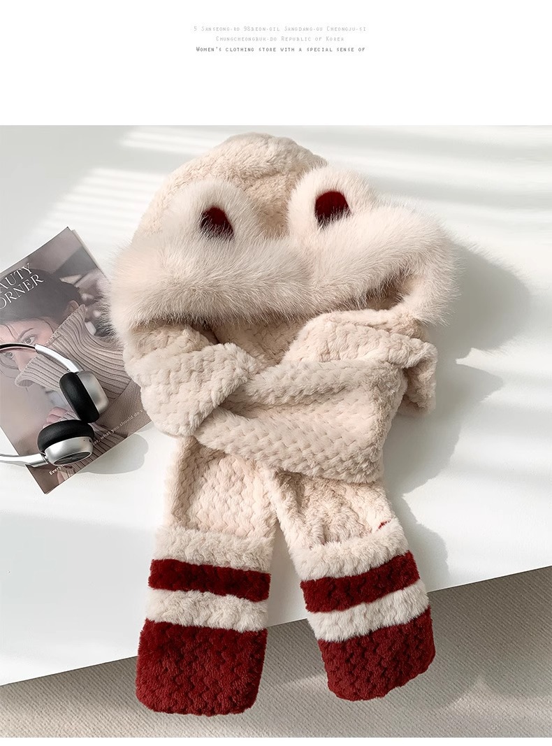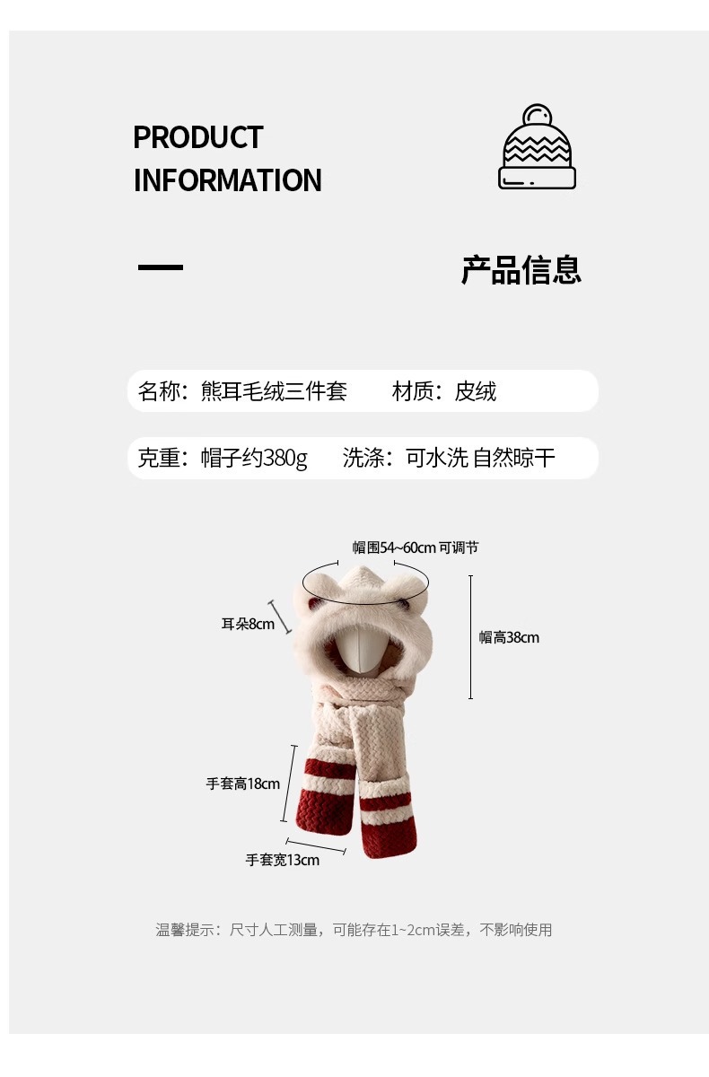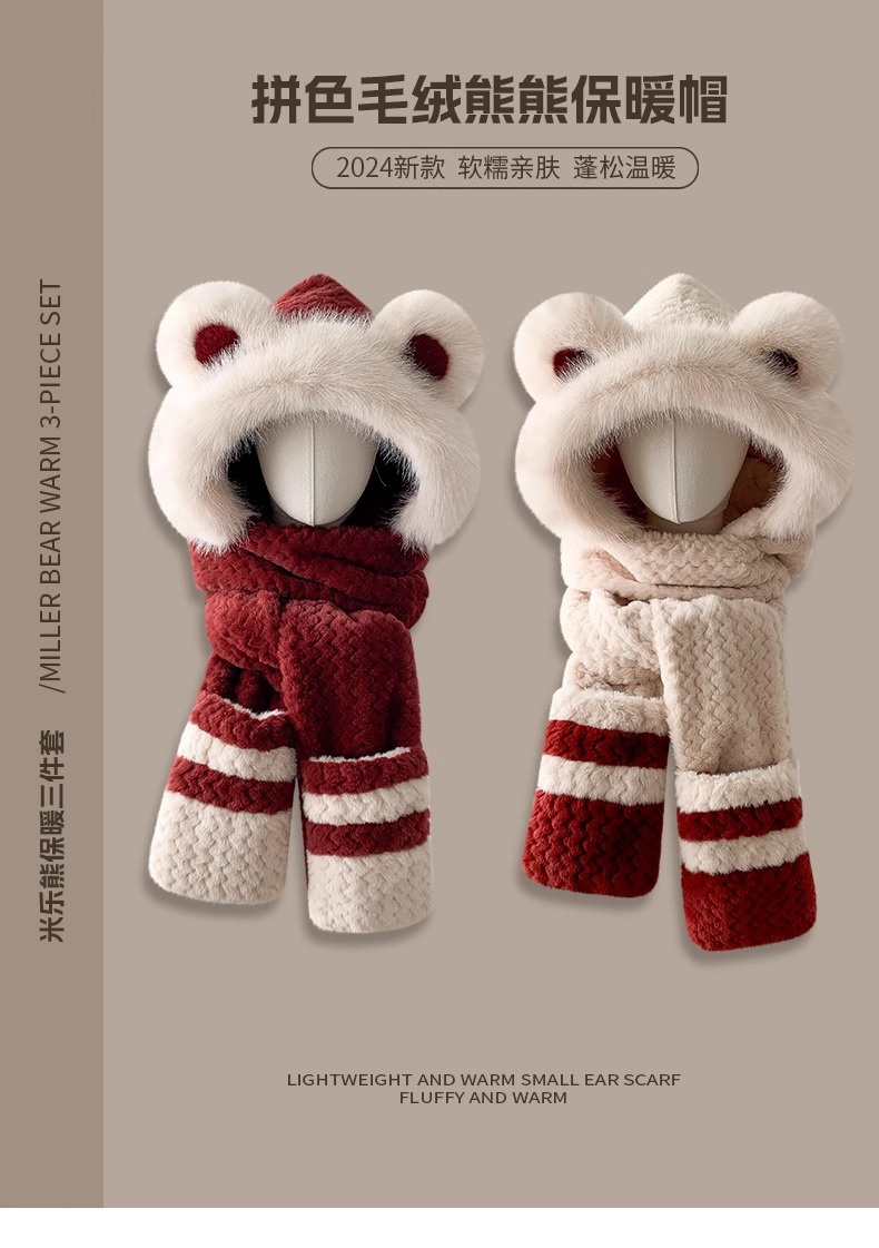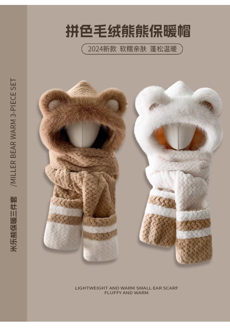 | 颜色 | 卡其色【小熊毛绒帽子围巾手套一体】, 米色【小熊毛绒帽子围巾手套一体】, 白色【小熊毛绒帽子围巾手套一体】, 安哥拉红【小熊毛绒帽子围巾手套一体】 | 适合季节 | 冬季 |
