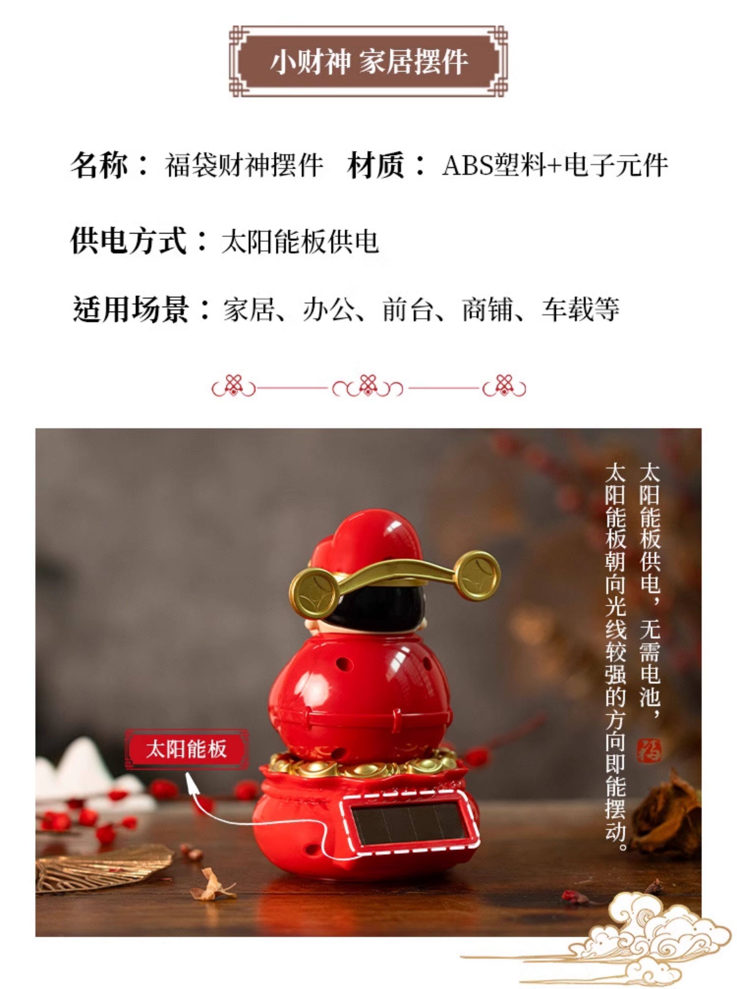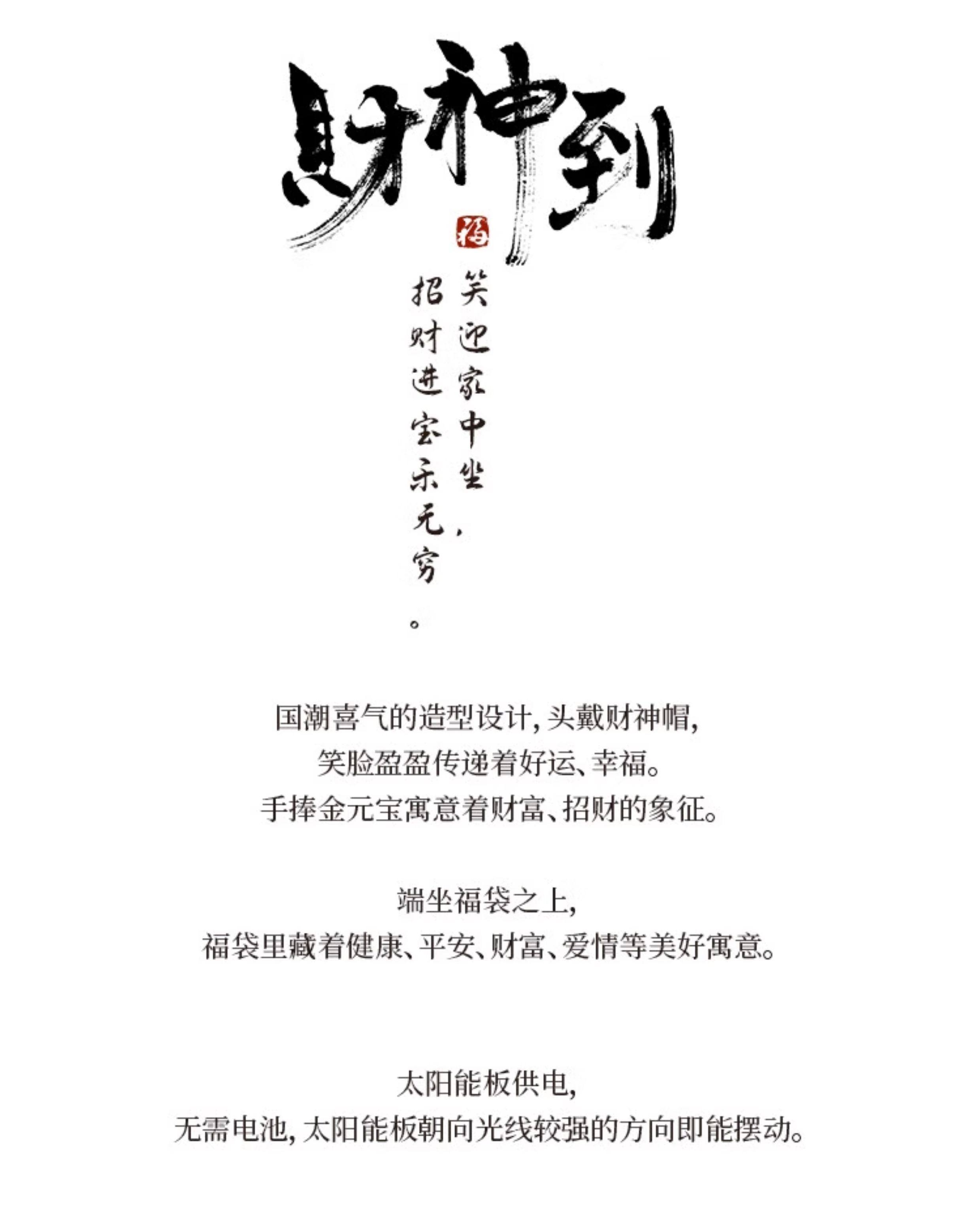 | 功能 | 摇摆 | 颜色分类 | 6653Q版财神, 招财进宝童子, 招财进宝白色, 幸福柴犬招手, 招财柴犬招手, 锦鲤财神红色, 锦鲤财神金色, 状元招财财神, 财神元宝点头, 白色马到成功, 红色马上发财, 黑色你我皆黑马, BY8899批发, 混色批发招财, 佛系招财法斗, 招财招财法斗, 幸福招财法斗, 福气招财法斗, 平安招财法斗, 好运招财法斗, 淡定招财法斗, 喜乐招财法斗, 混色批发法斗 |