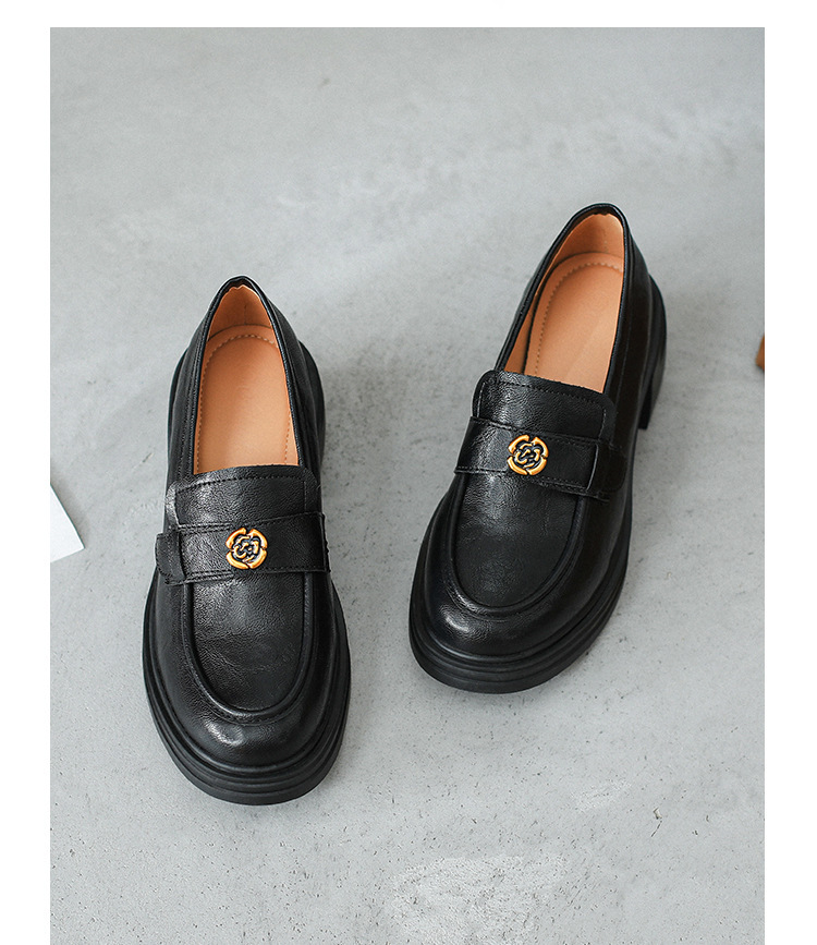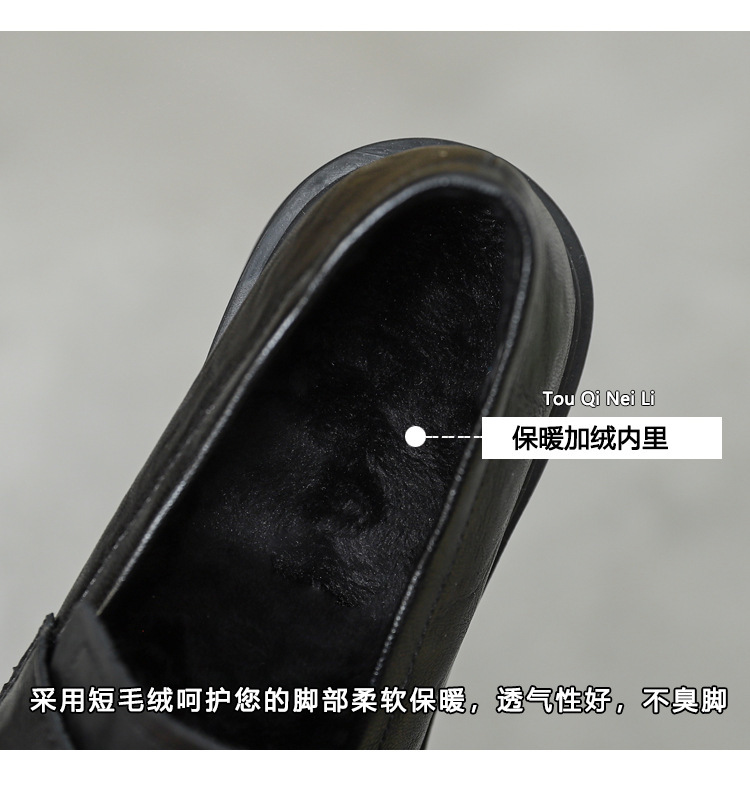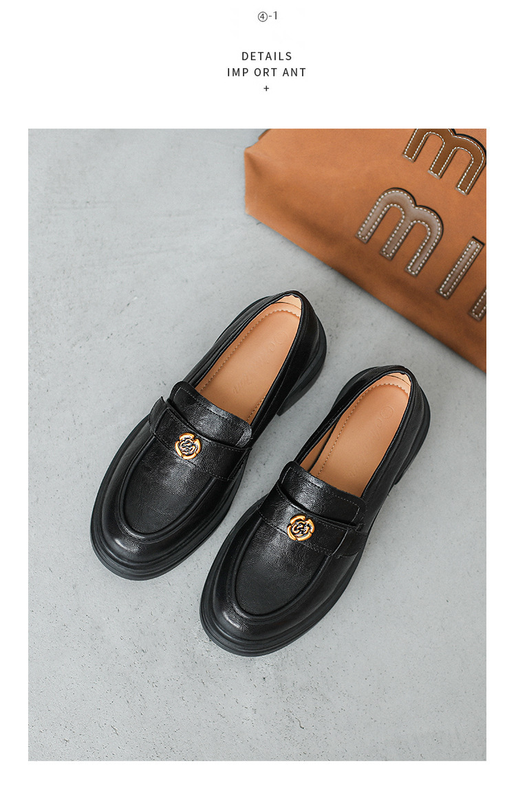 소가죽 영국풍 두꺼운 굽 라운드 토 플리스 안감 로퍼 2025 가을 겨울 신상 동백꽃 가죽 신발 다용도