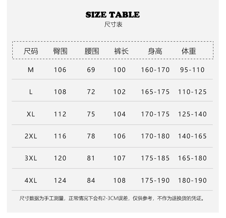 | 尺码 | M(95-110)斤, L(110-125)斤, XL(125-140)斤, 2XL(140-165)斤, 3XL(165-180)斤, 4XL(180-190)斤 | 是否跨境出口专供货源 | 否 |
