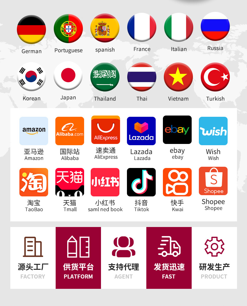 | 是否跨境出口专供货源 | 是 | 主要下游平台 | 淘宝, 京东, ebay, 亚马逊, wish, 快手, SHEIN, 速卖通, 天猫, 独立站, LAZADA, 拼多多, shopee, 抖音, 其他 |