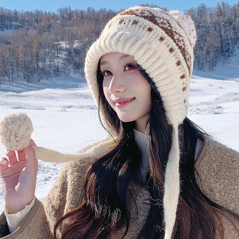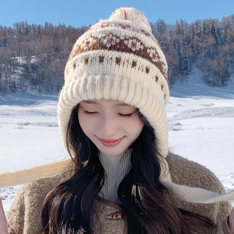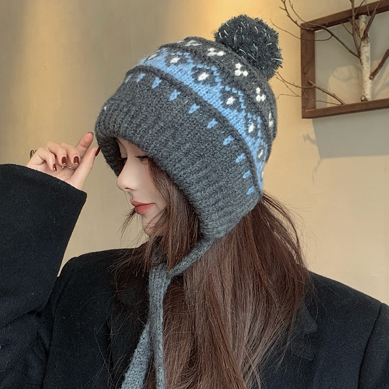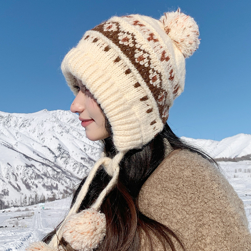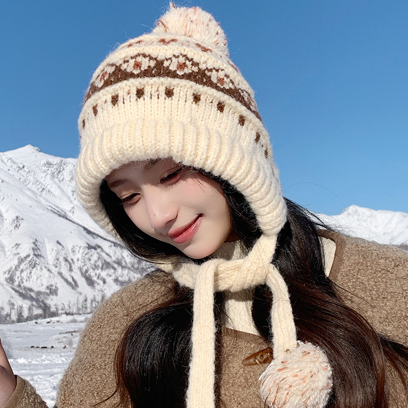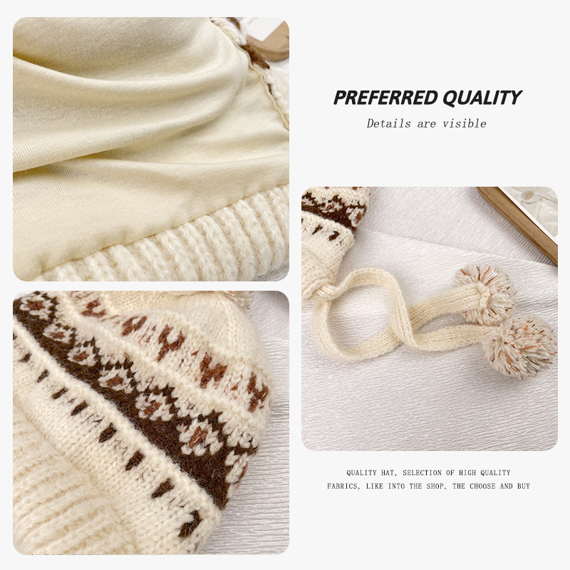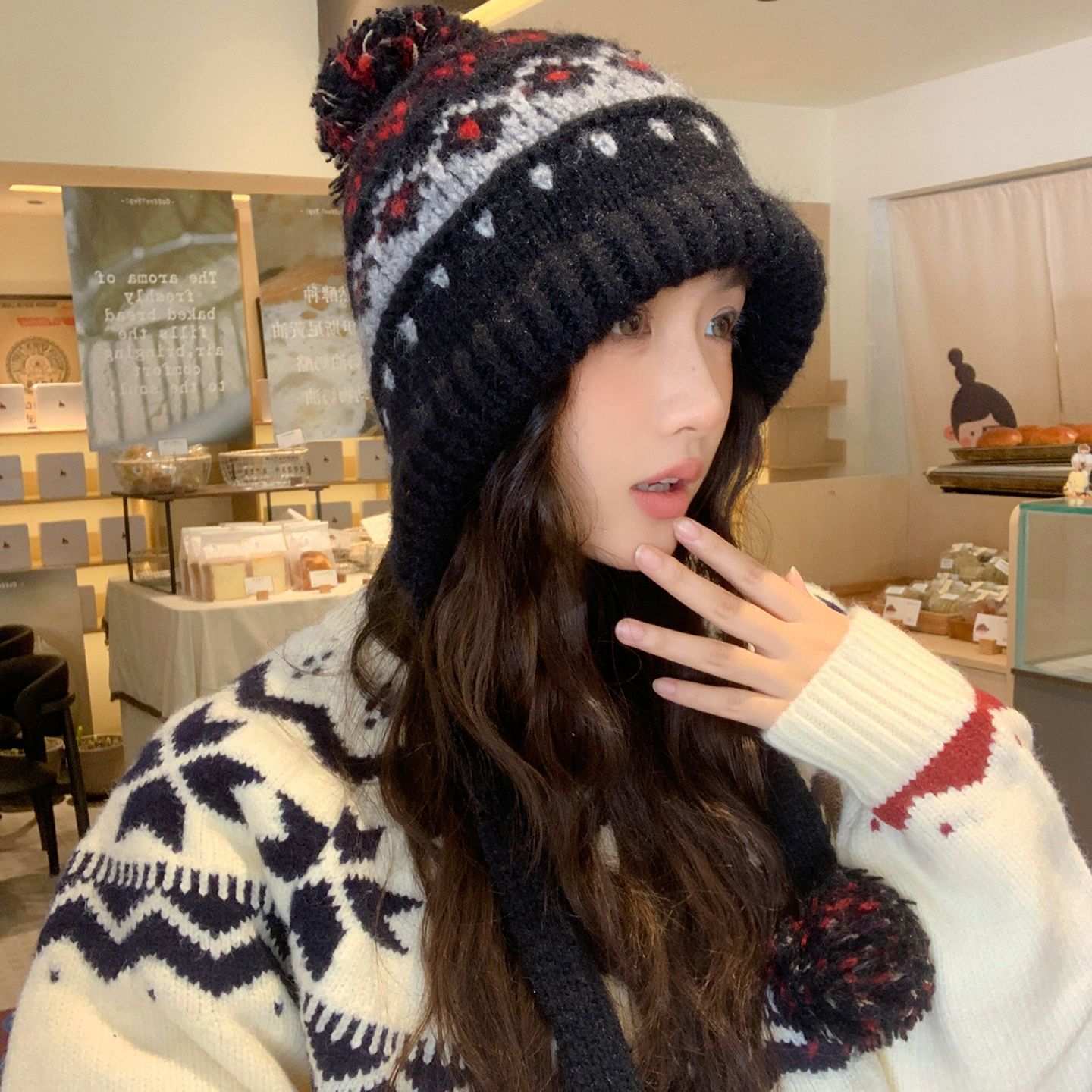 가을 겨울 여성용 페어 아일 스타일 니트 발가락 모자, 귀 보호 및 따뜻한 레이펑 모자, 큰 머리 둘레, 얼굴이 보이는 작은 방한 모자