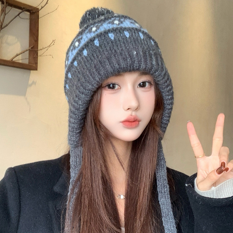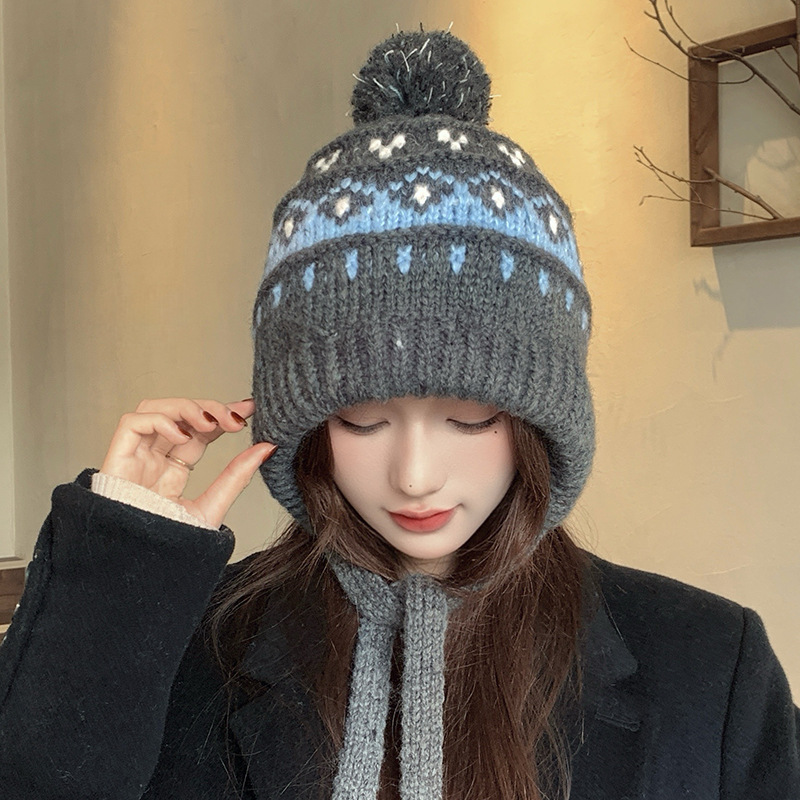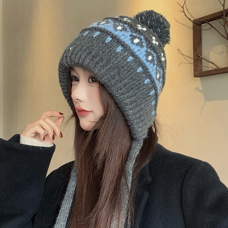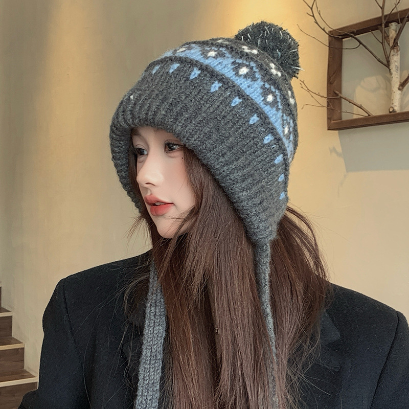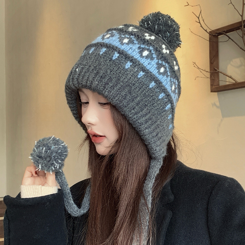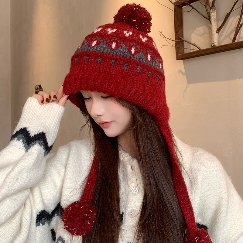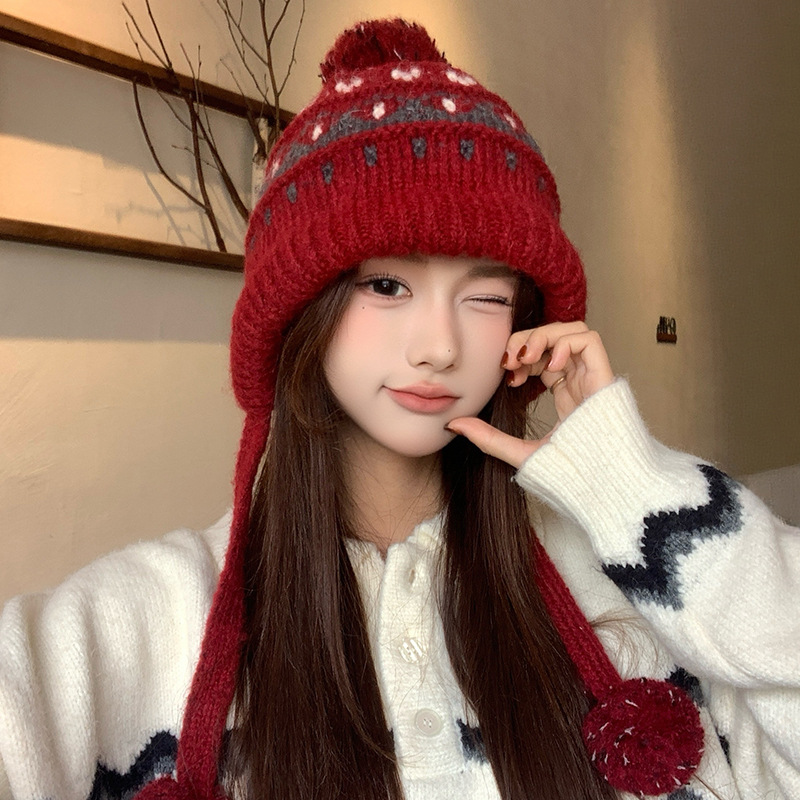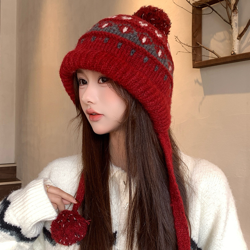 가을 겨울 여성용 페어 아일 스타일 니트 발가락 모자, 귀 보호 및 따뜻한 레이펑 모자, 큰 머리 둘레, 얼굴이 보이는 작은 방한 모자