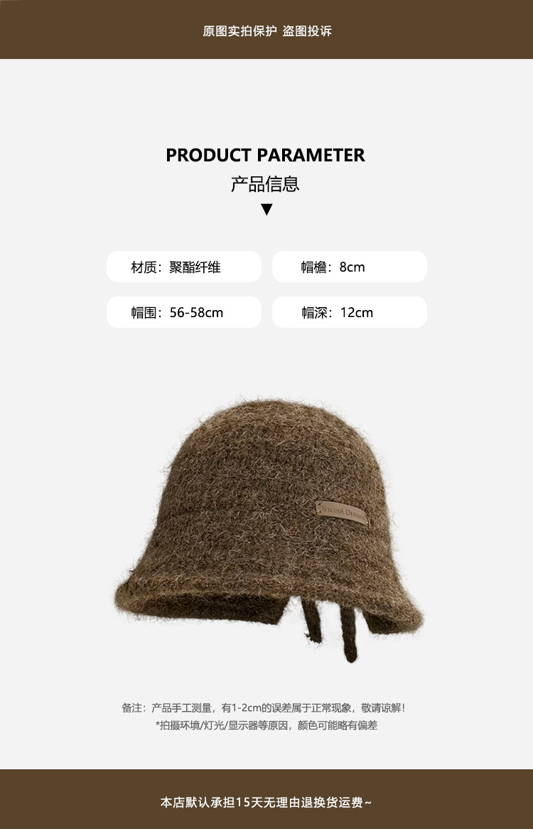 | 帽檐款式 | 短檐 | 颜色 | 咖色, 米白色, 米黄色, 灰色, 卡其色, 黑色 |