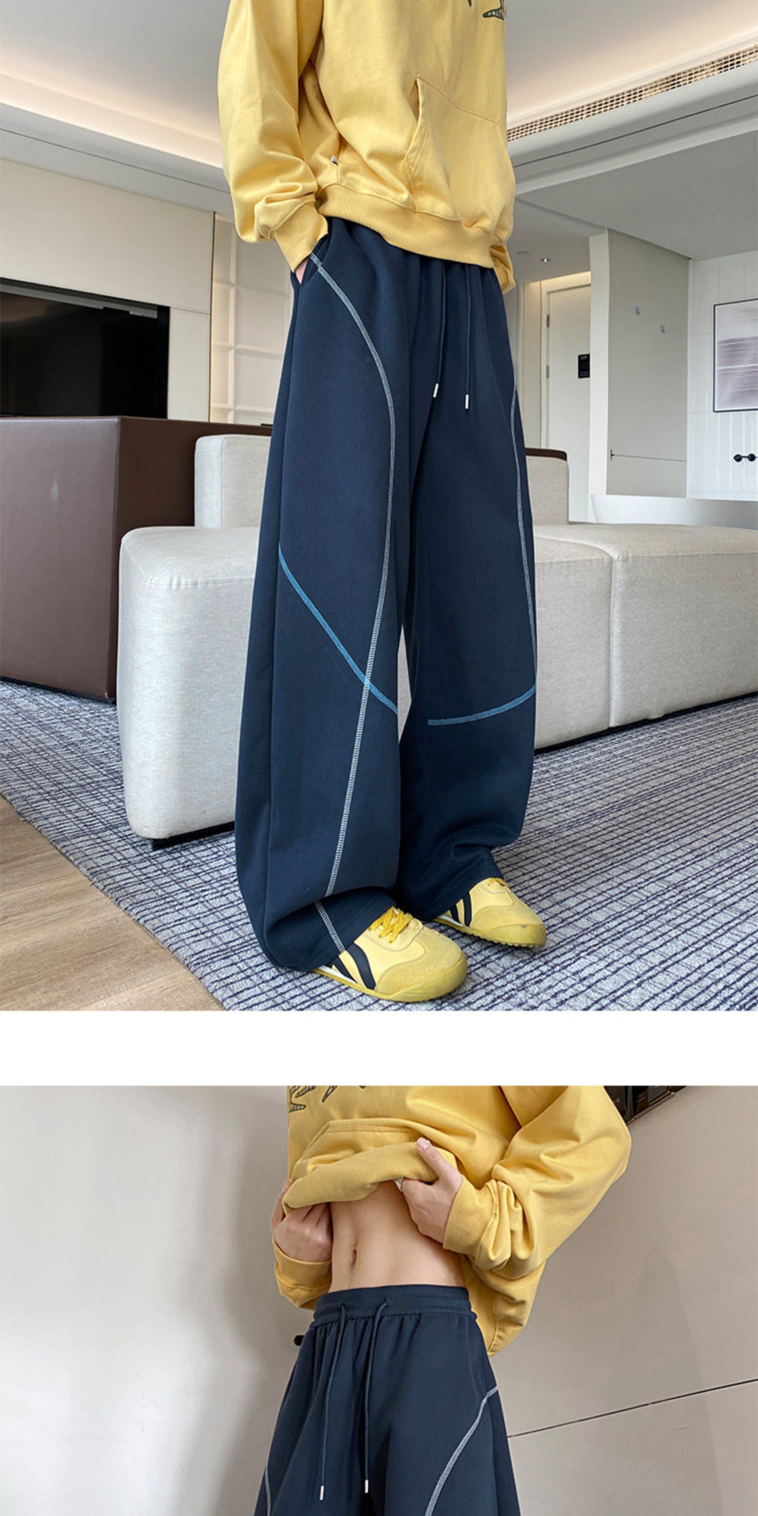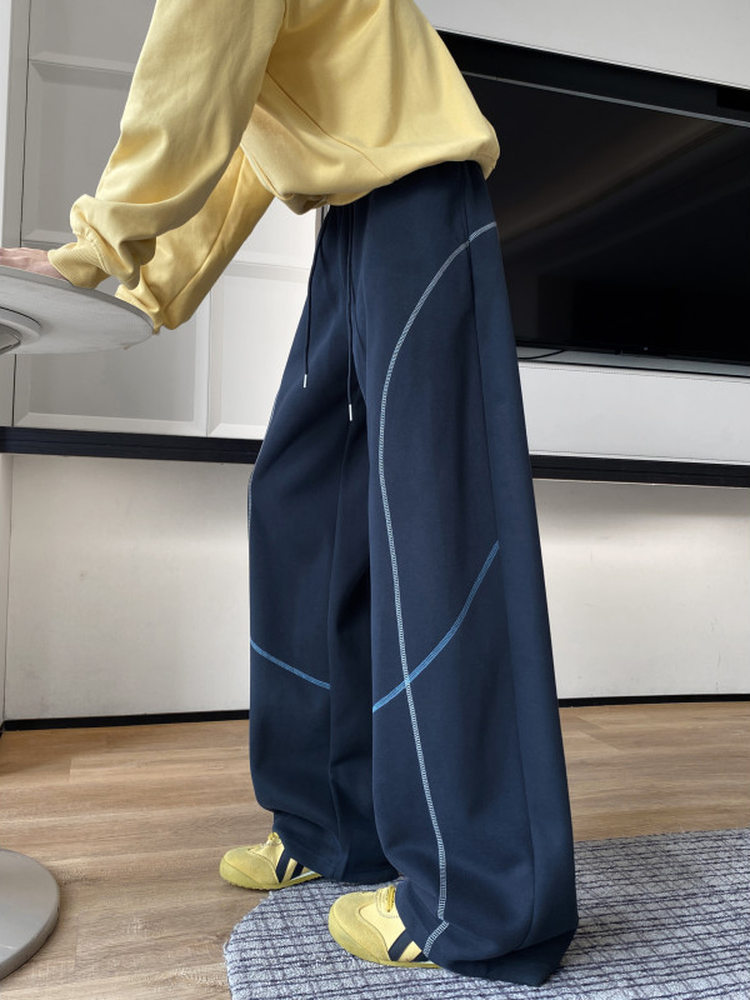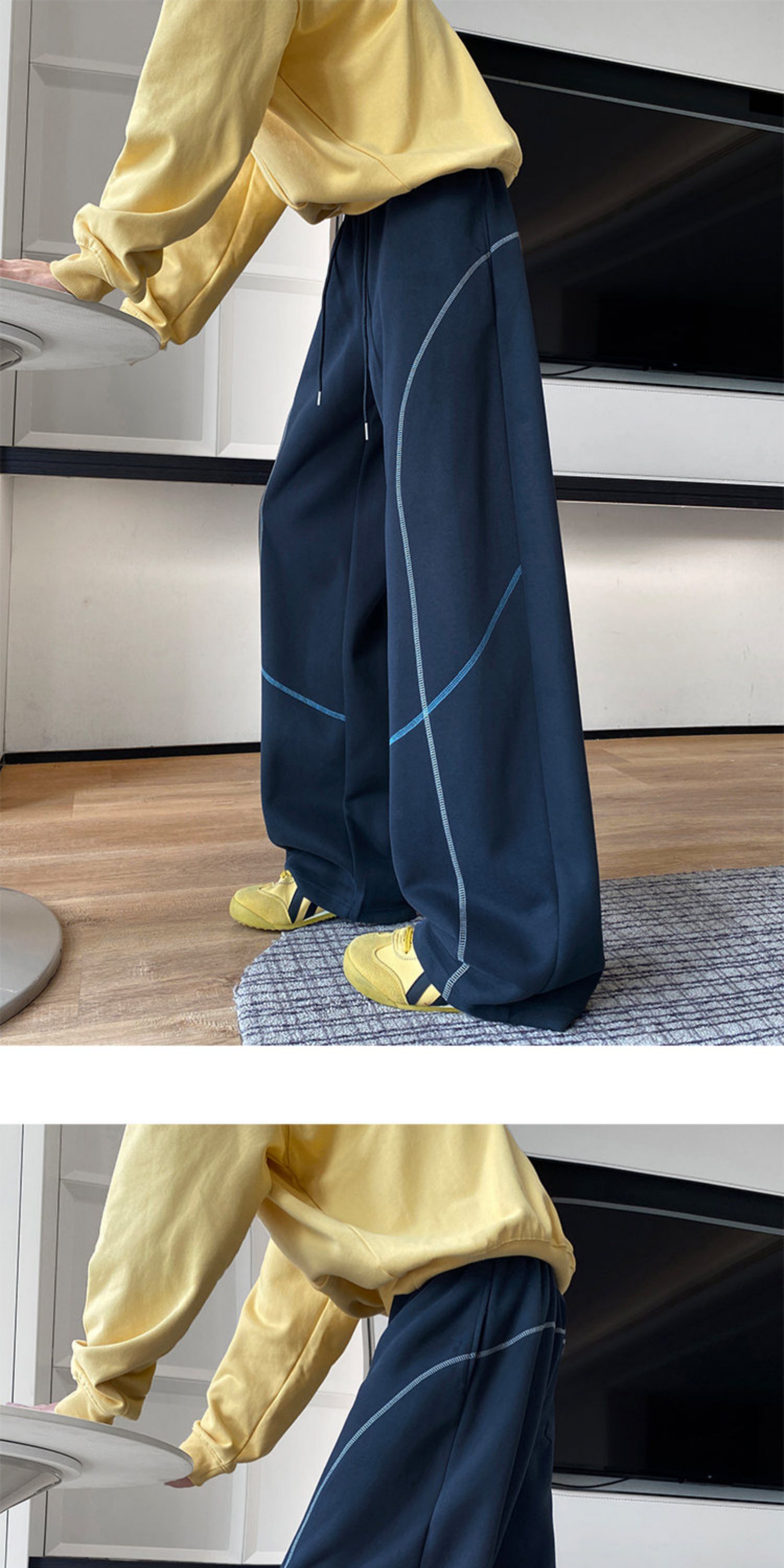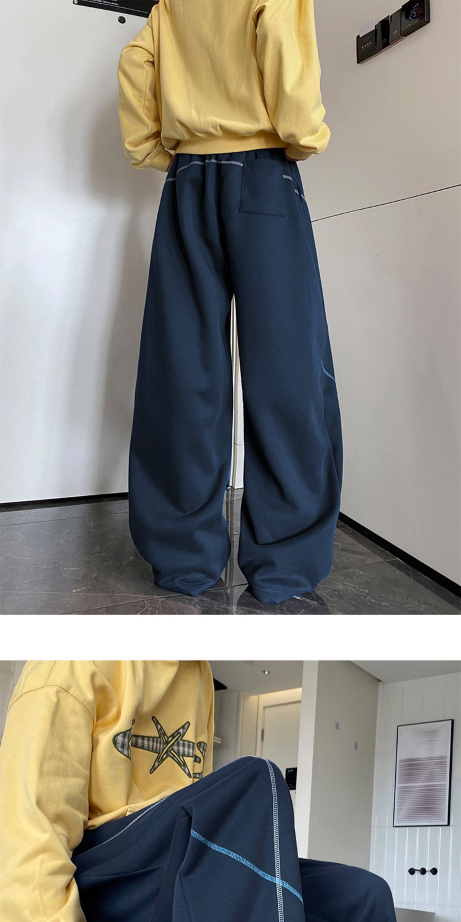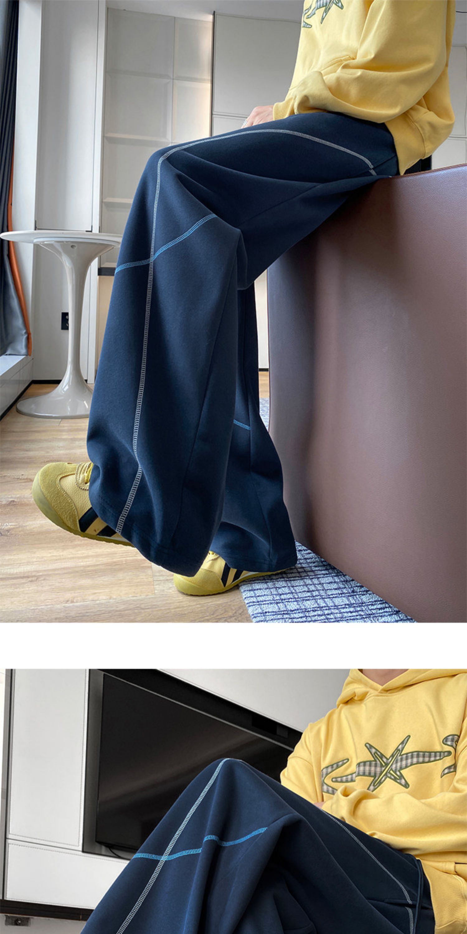 가을 남녀공용 아메리칸 네이비 블루 탑스티치 세이버 스웨트팬츠, 편안하고 키가 큰 캐주얼 팬츠, 루즈한 스포츠 와이드 팬츠