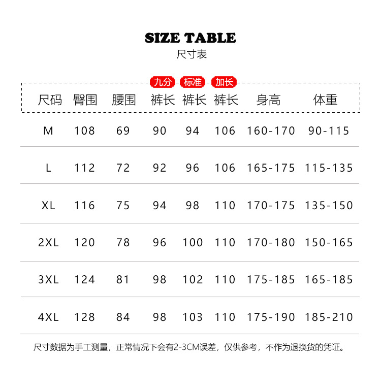 | 颜色 | ----------缩口款----------, 灰色九分【羊羔绒//适合160-170cm】, 灰色标准【羊羔绒//适合170-185cm】, 灰色加长【羊羔绒//适合-185cm以上】, 黑色九分【羊羔绒//适合160-170cm】, 黑色标准【羊羔绒//适合170-185cm】, 黑色加长【羊羔绒//适合-185cm以上】, --------直筒款----------, 直筒款-灰色九分【羊羔绒//适合160-170cm】, 直筒款-灰色标准【羊羔绒//适合170-185cm】, 直筒款-灰色加长【羊羔绒//适合-185cm以上】, 直筒款-黑色九分【羊羔绒//适合160-170cm】, 直筒款-黑色标准【羊羔绒//适合170-185cm】, 直筒款-黑色加长【羊羔绒//适合-185cm以上】, ----------束脚款----------, 束脚款-灰色九分【羊羔绒//适合160-170cm】, 束脚款-灰色标准【羊羔绒//适合170-185cm】, 束脚款-灰色加长【羊羔绒//适合-185cm以上】, 束脚款-黑色九分【羊羔绒//适合160-170cm】, 束脚款-黑色标准【羊羔绒//适合170-185cm】, 束脚款-黑色加长【羊羔绒//适合-185cm以上】 | 裤尺寸 | M(90-115)斤, L(115-135)斤, XL(135-150)斤, 2XL(150-165)斤, 3XL(165-185)斤, 4XL(185-210)斤 |