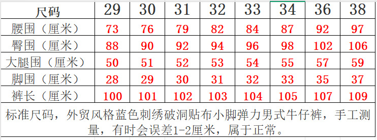| 颜色 | 蓝色 | 尺码 | 28, 29, 30, 31, 32, 33, 34, 36, 38 |