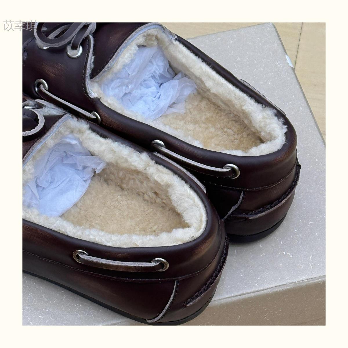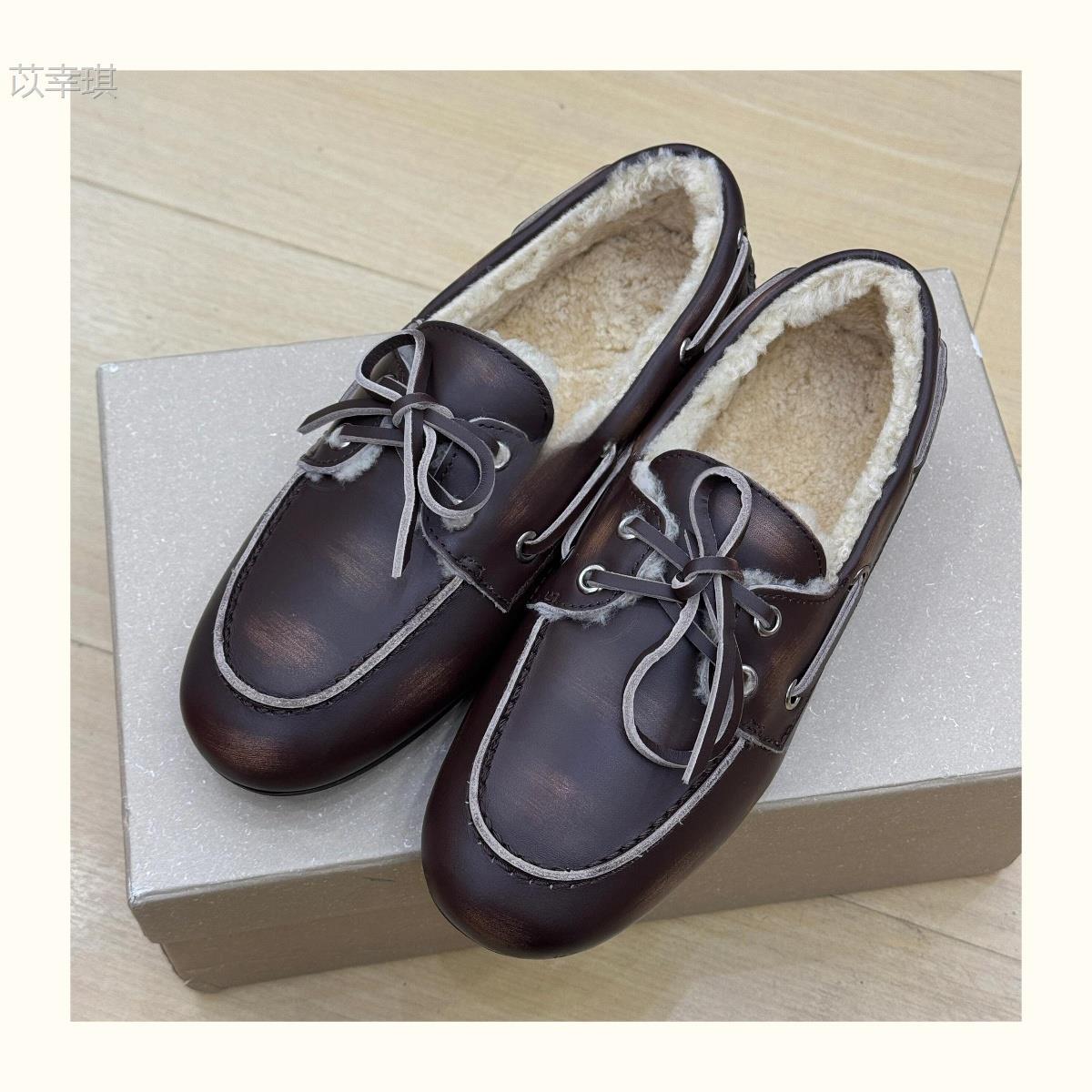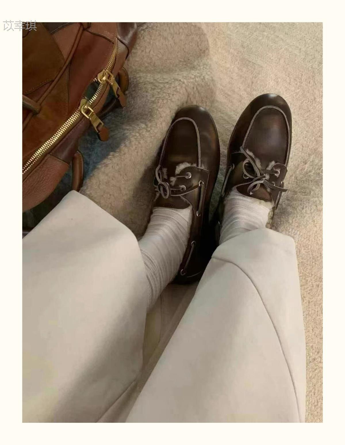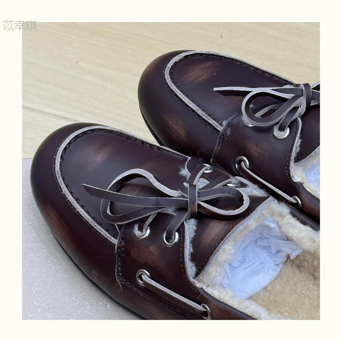 소가죽 버전 ~ 레트로 브리티시 스타일 올드 컬러 워밍 플러스 벨벳 로퍼 여성용 천연가죽 라운드 투 레이스업 스몰 가죽 슈즈