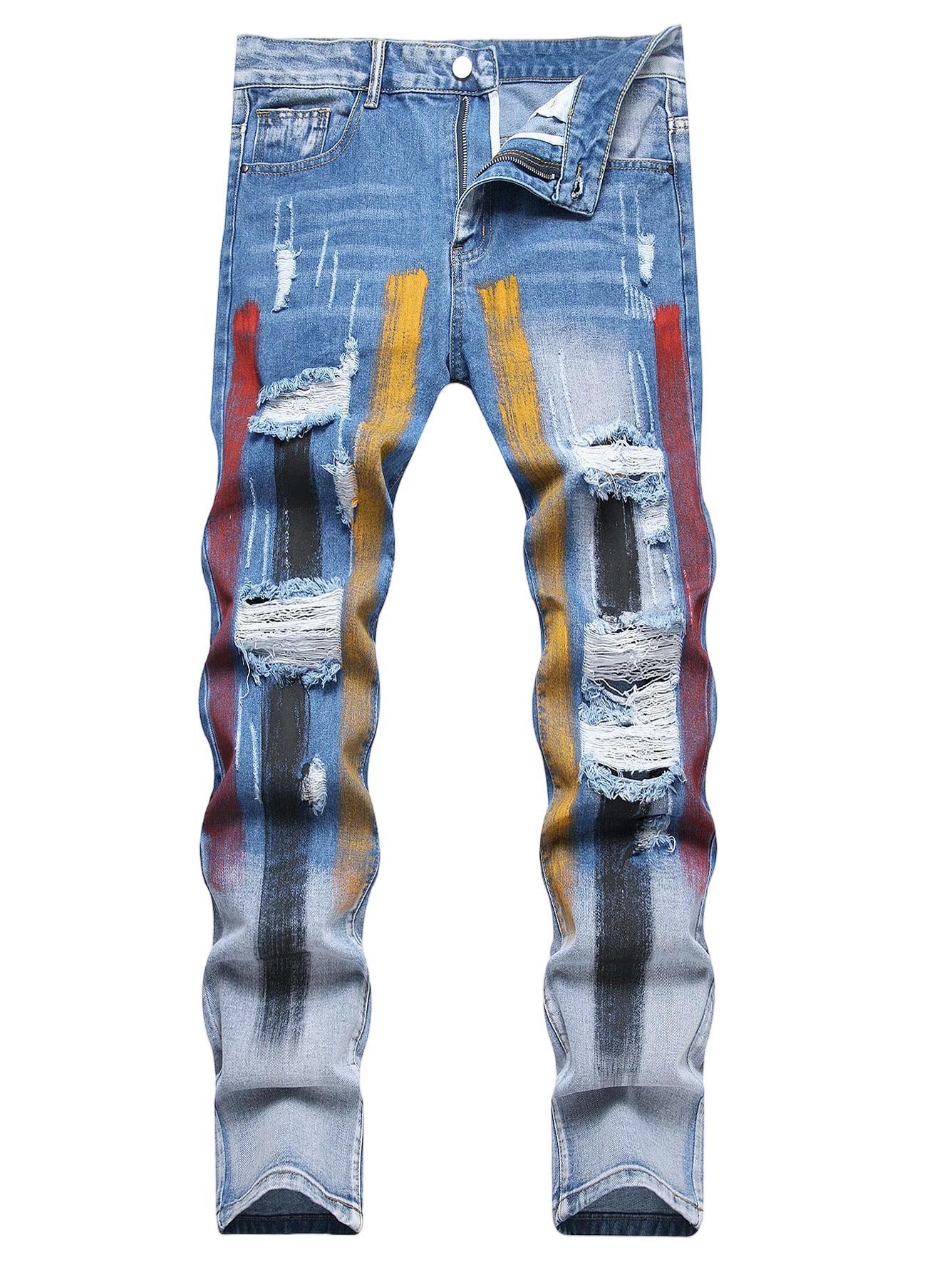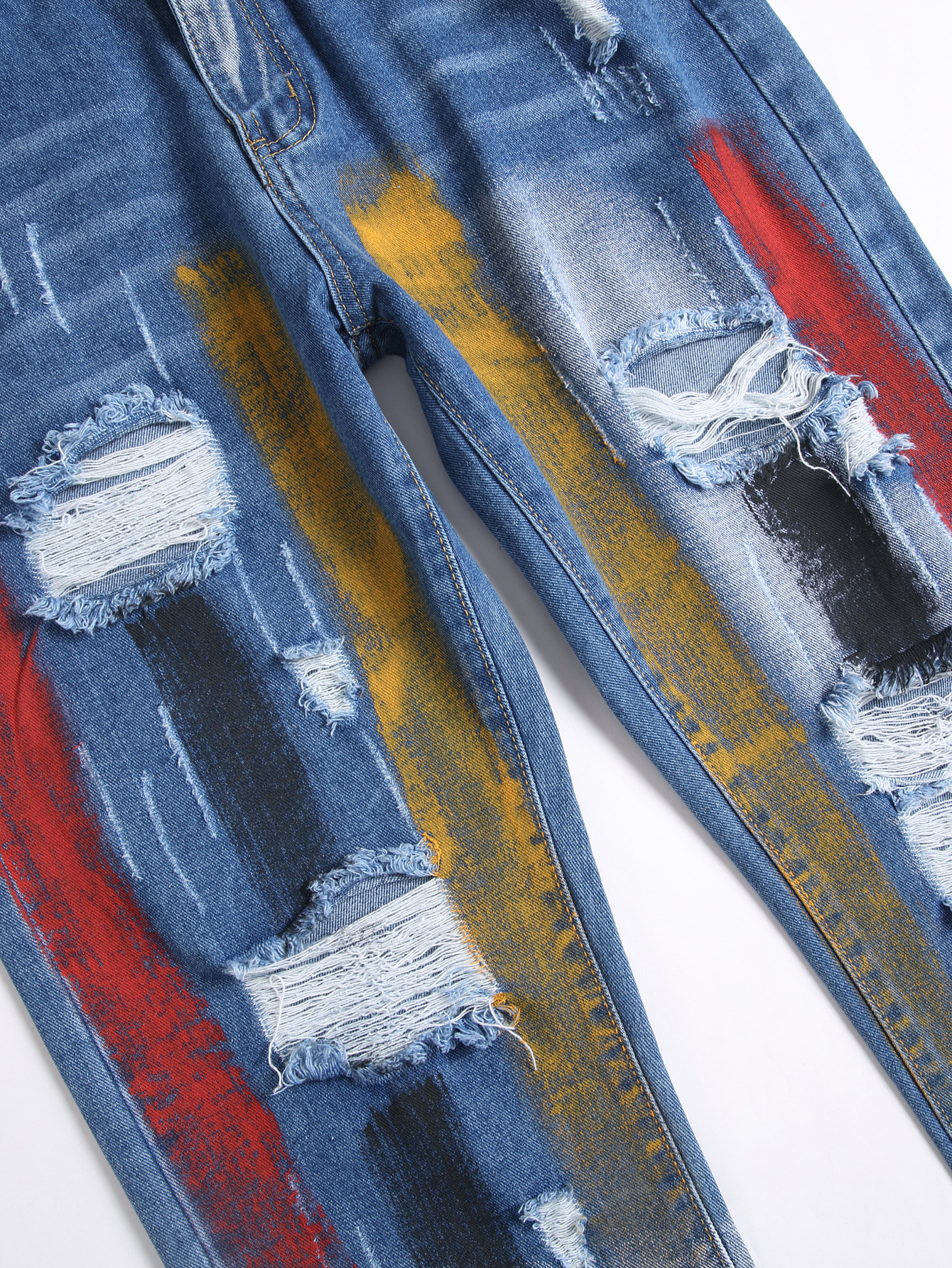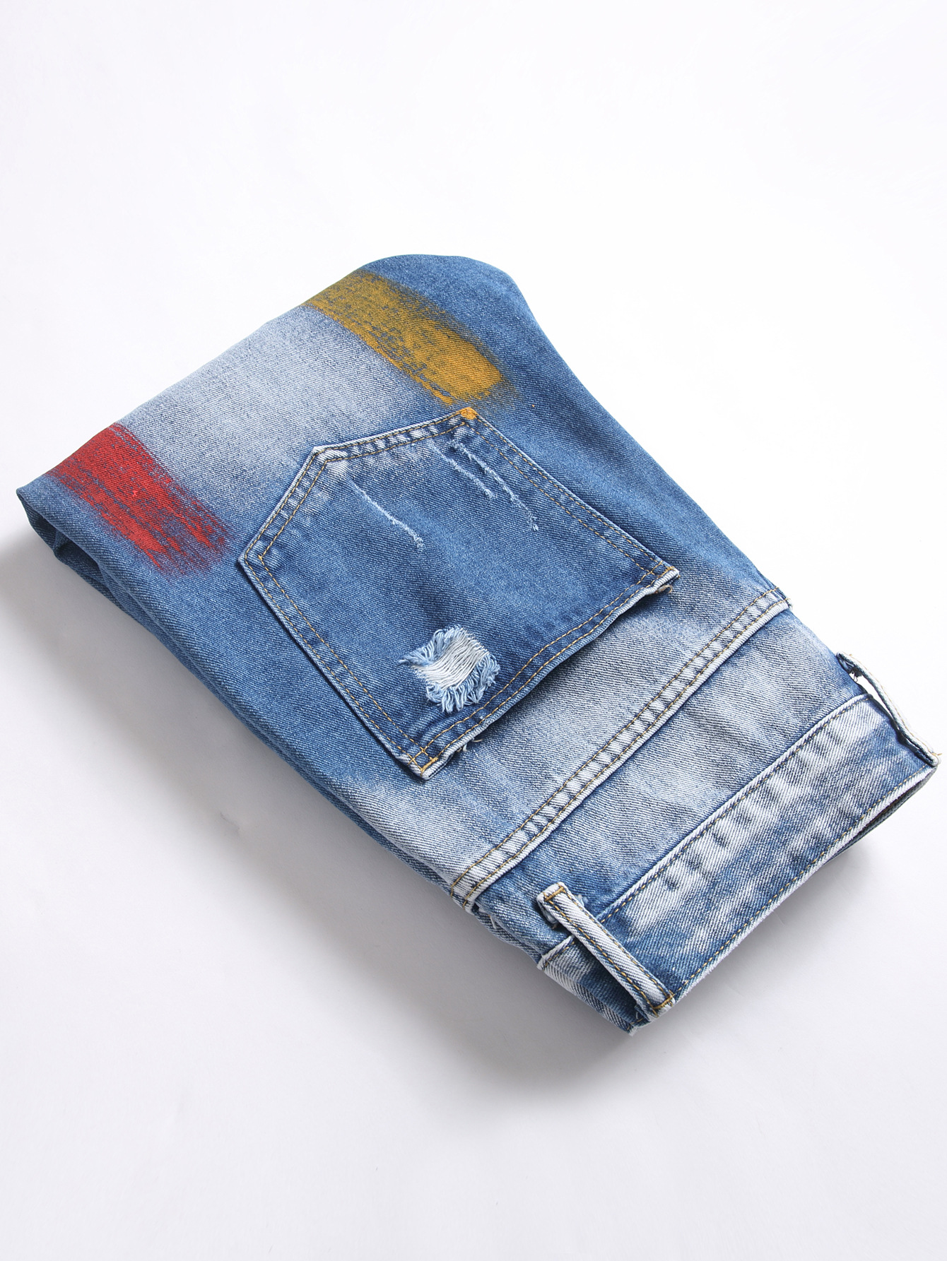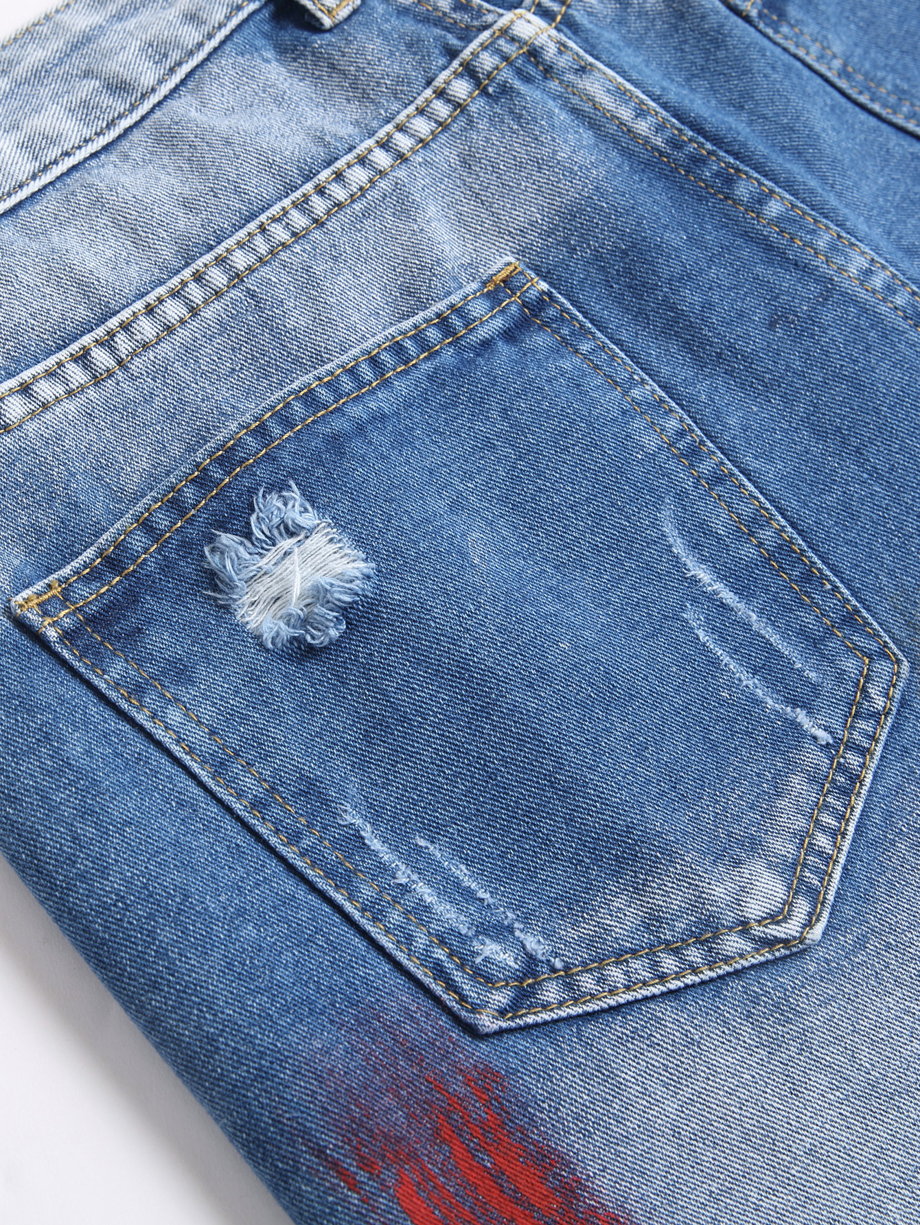 크로스보더 무역 연청색 바지 데미지 페인트 바지 고급 슬림핏 무탄성 바지 슬림핏 남성용 청바지