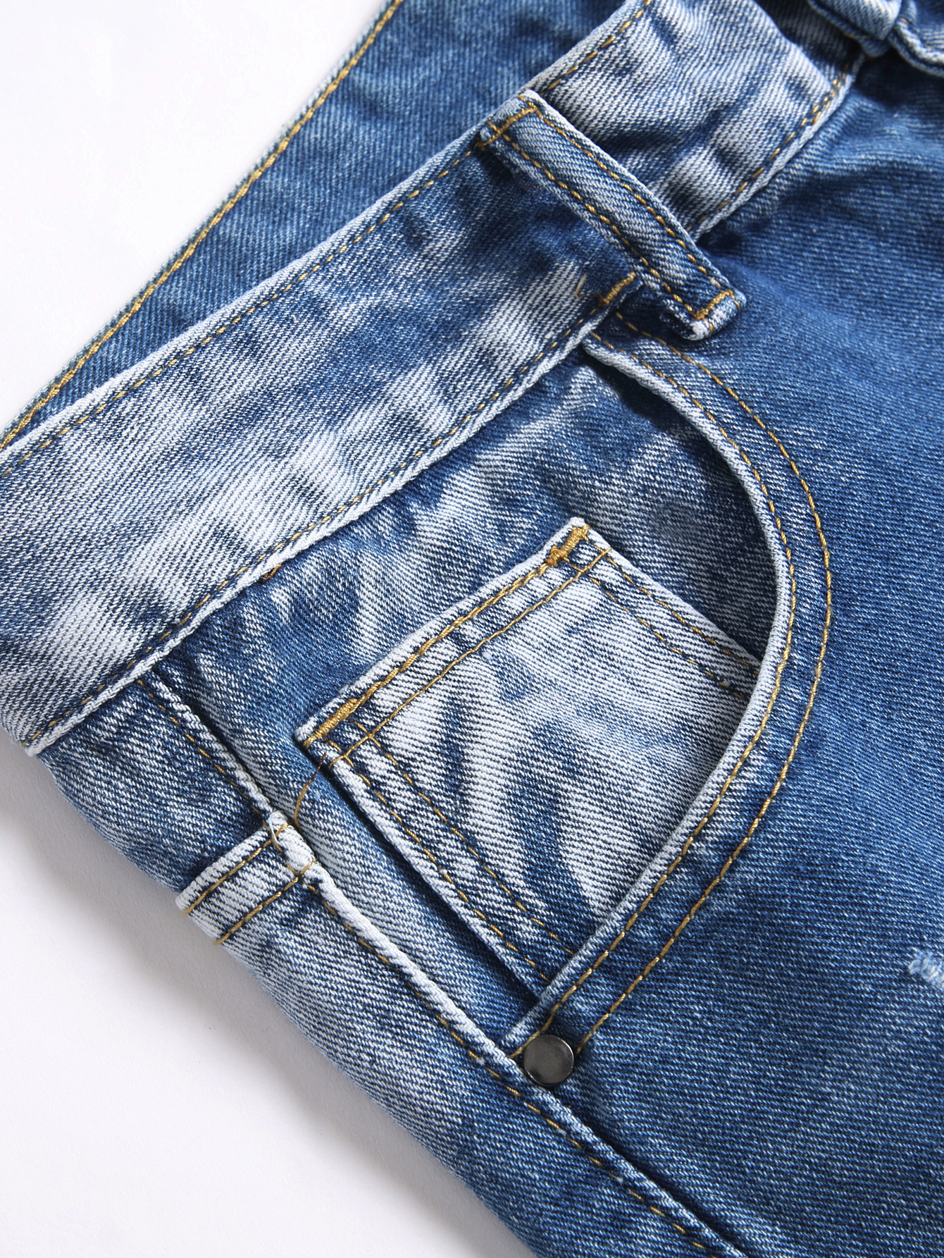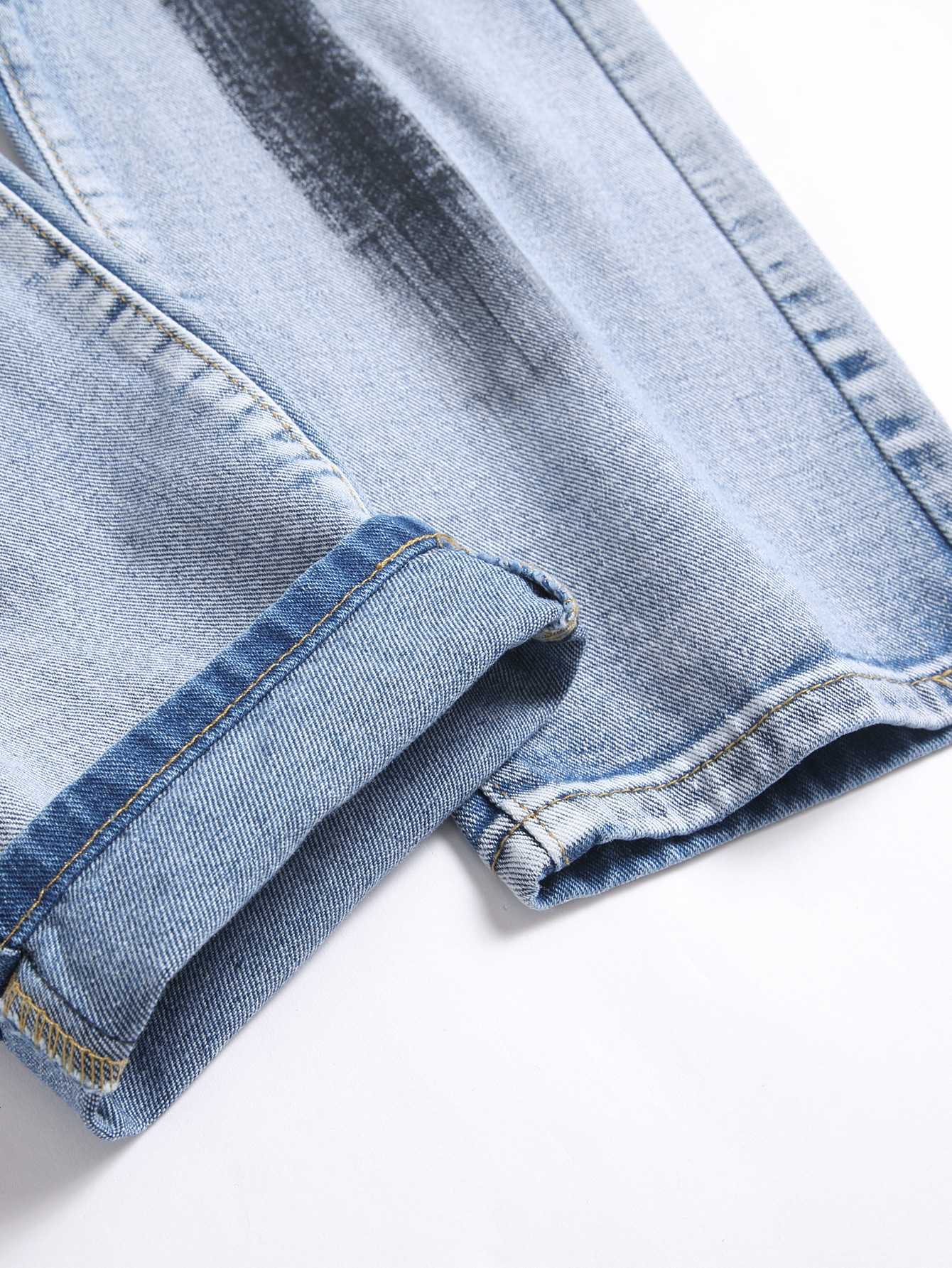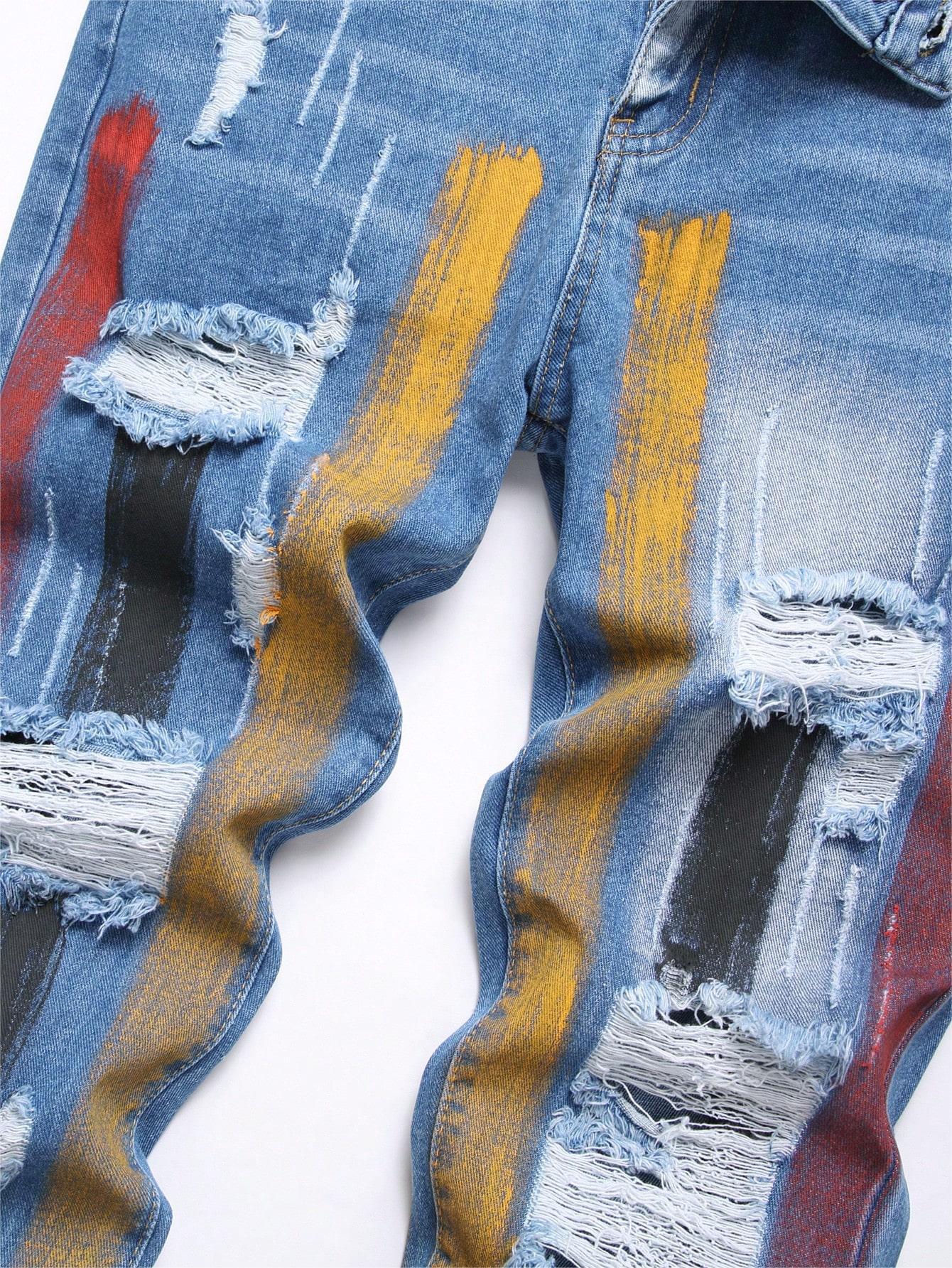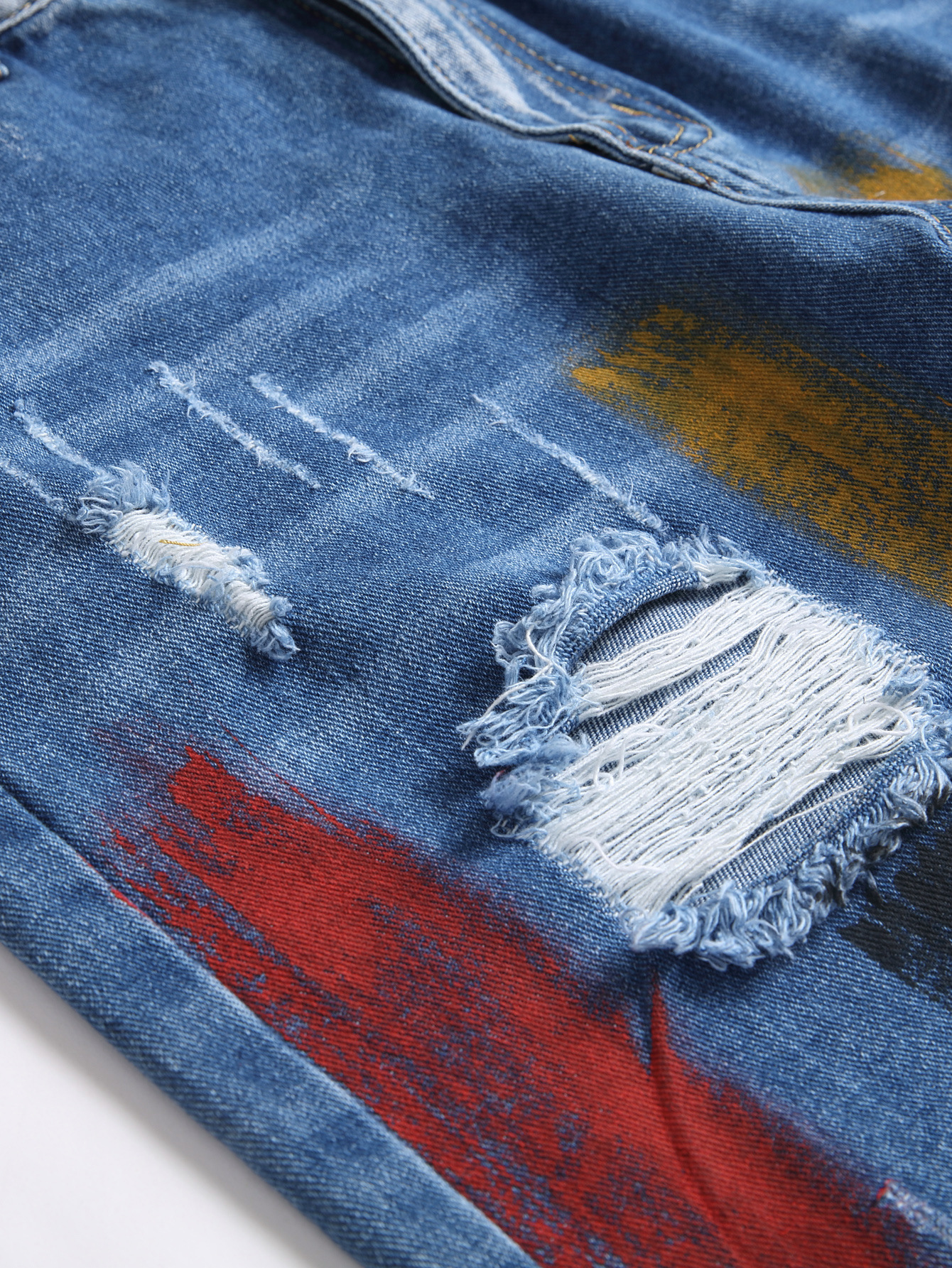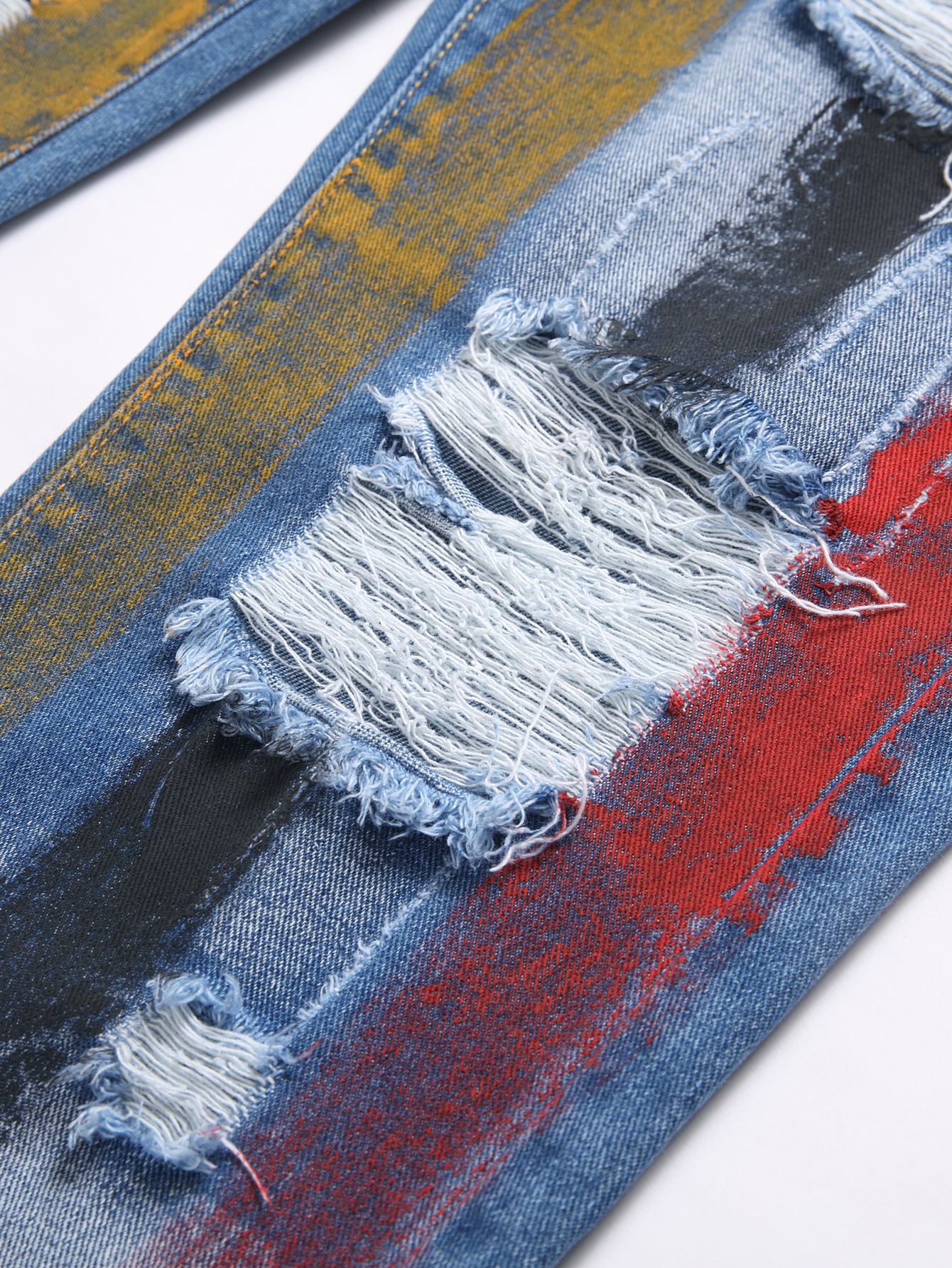 크로스보더 무역 연청색 바지 데미지 페인트 바지 고급 슬림핏 무탄성 바지 슬림핏 남성용 청바지