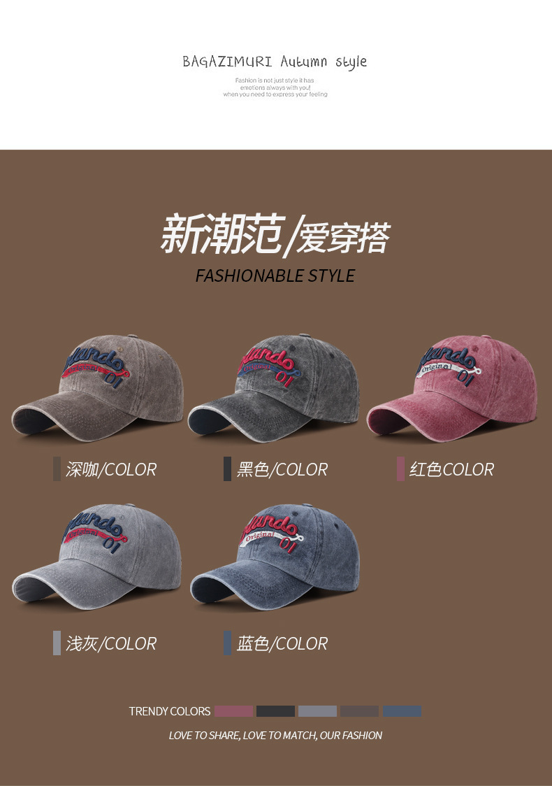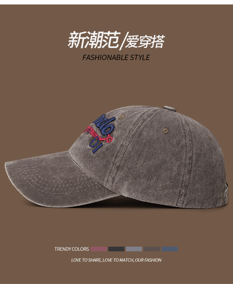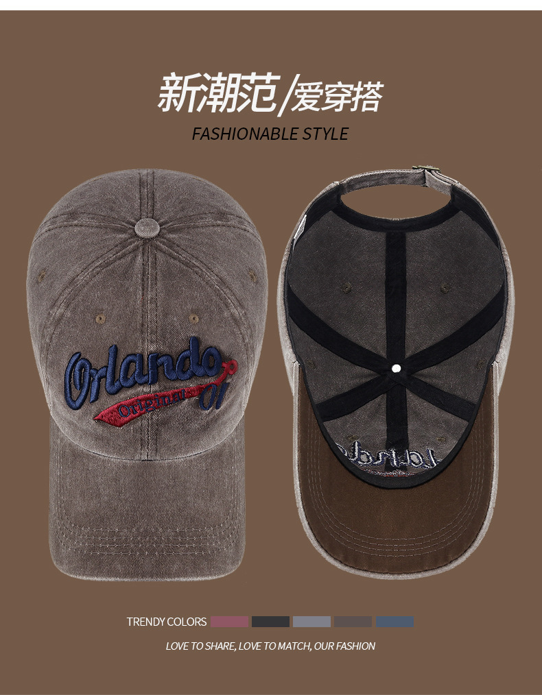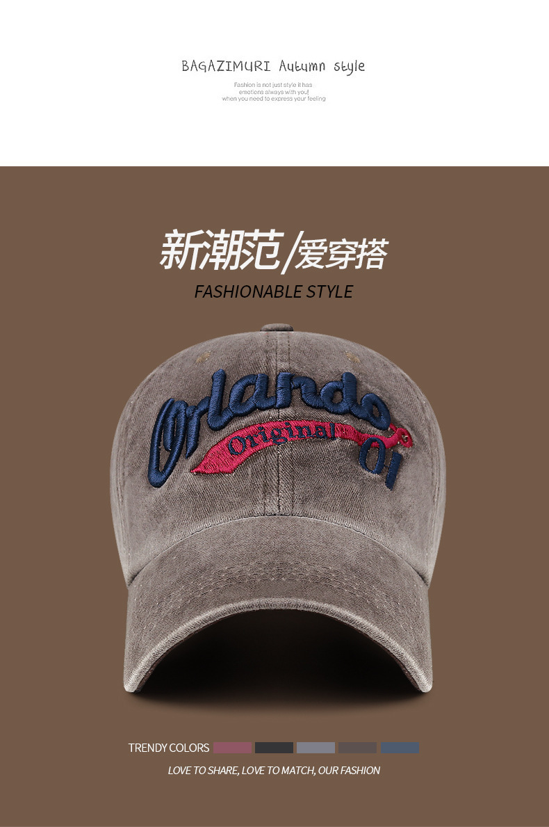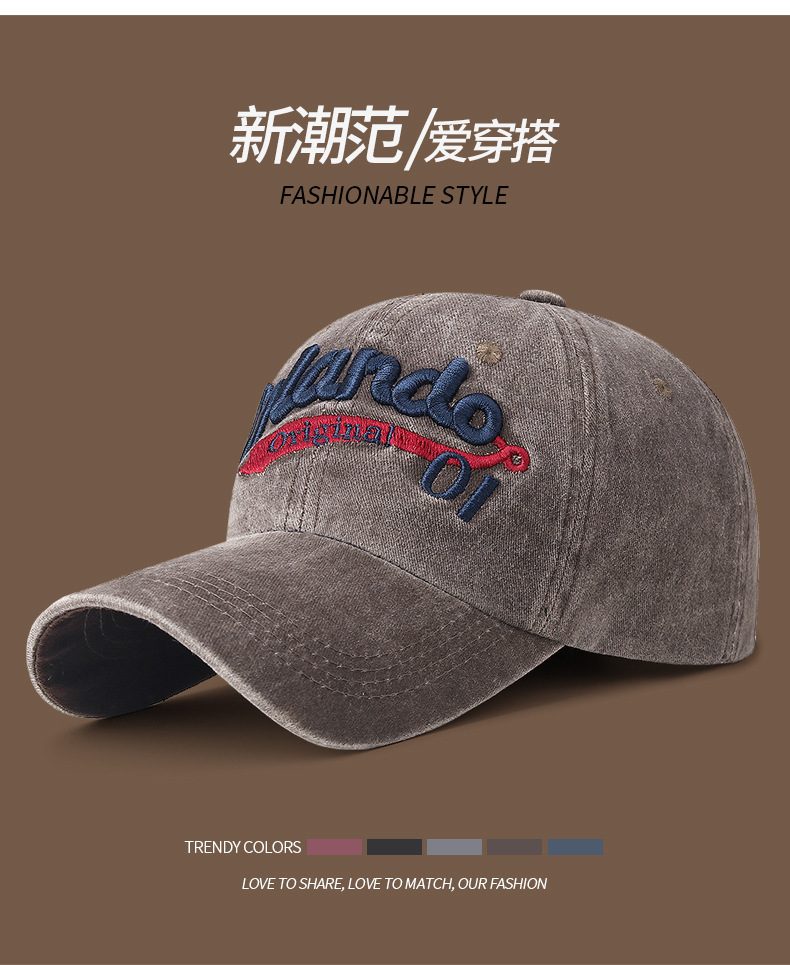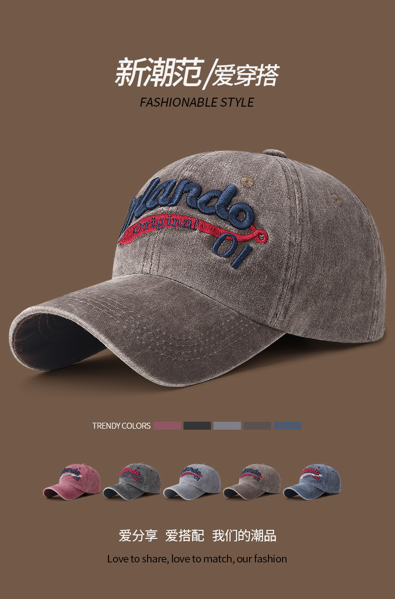 남성과 여성을 위한 크로스보더 워싱 입체 문자 자수 야구 모자, 캐주얼 자외선 차단 곡선 챙 피크 캡, 다용도 커플 모자