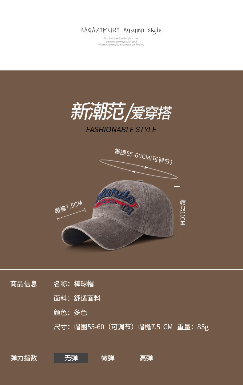 | 帽檐款式 | 弯檐 | 颜色 | 藏青色, 黑色, 灰色, 酒红色, 咖啡色 |