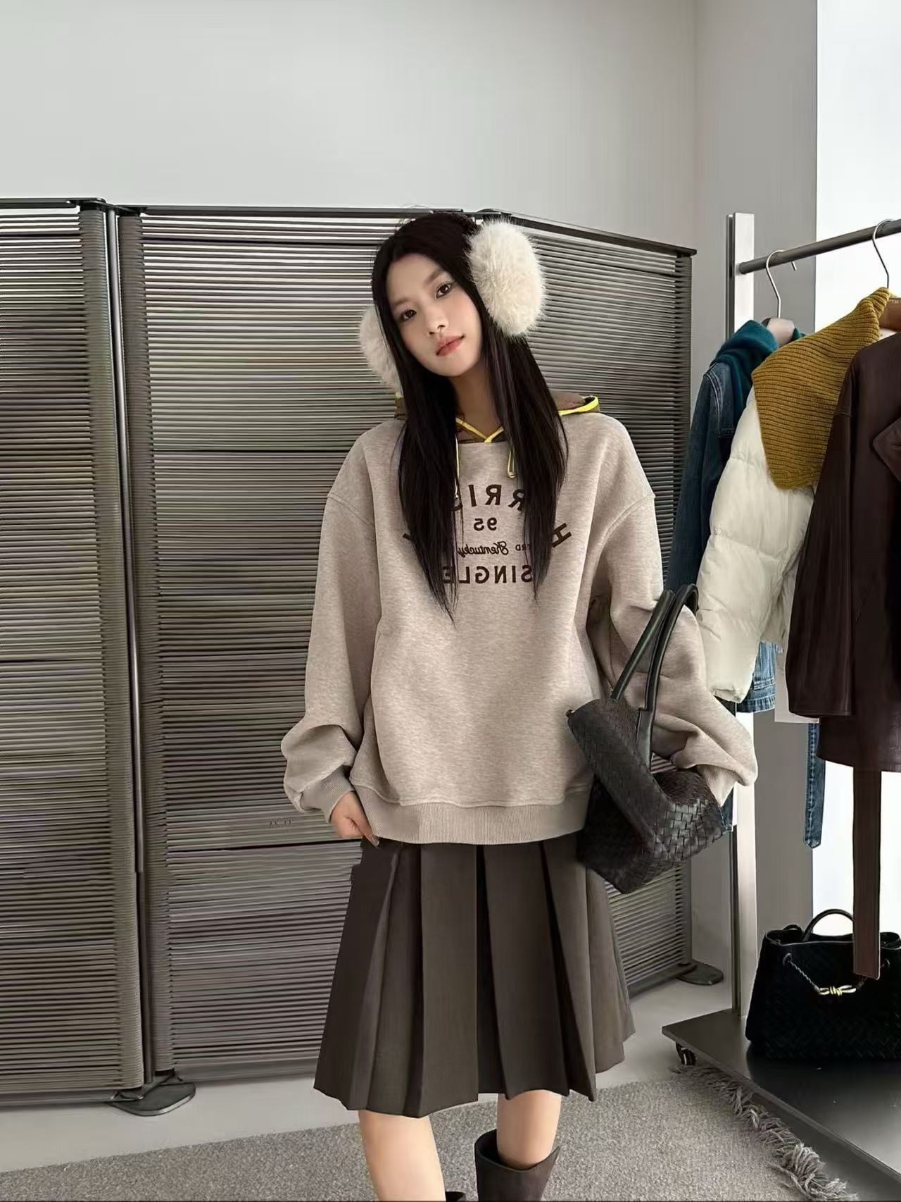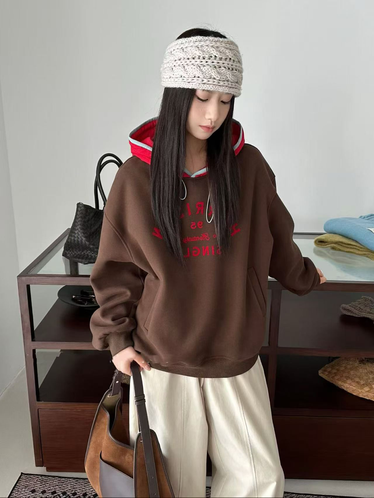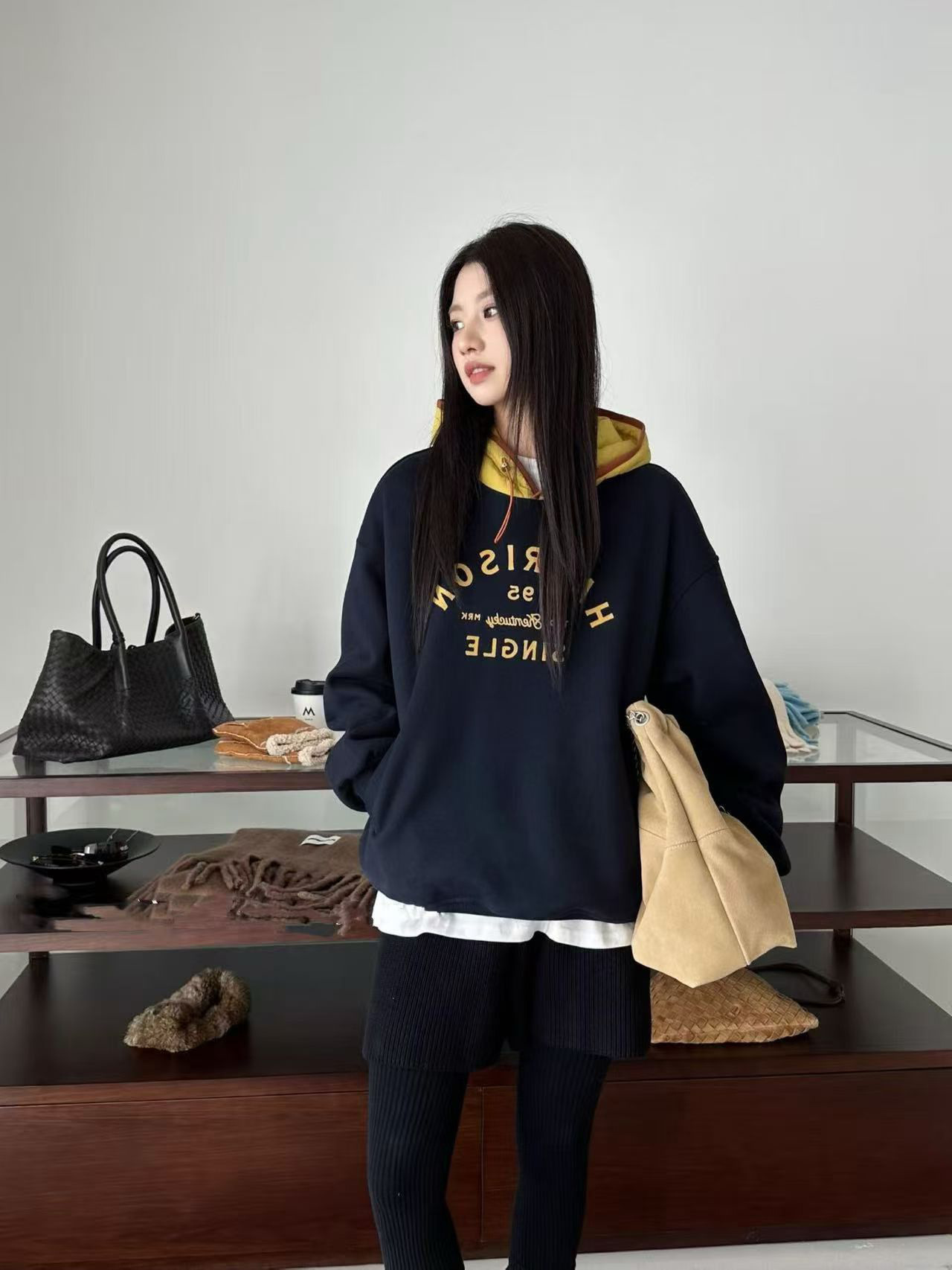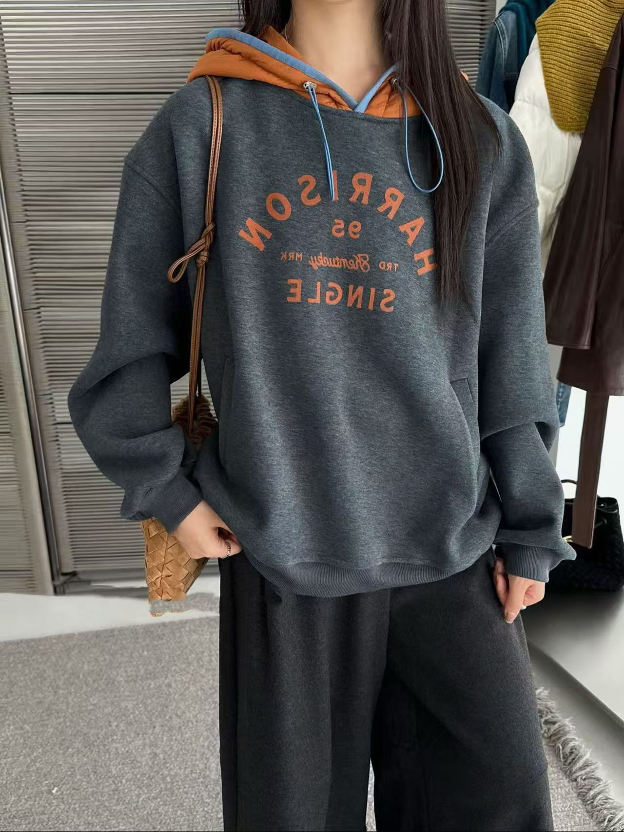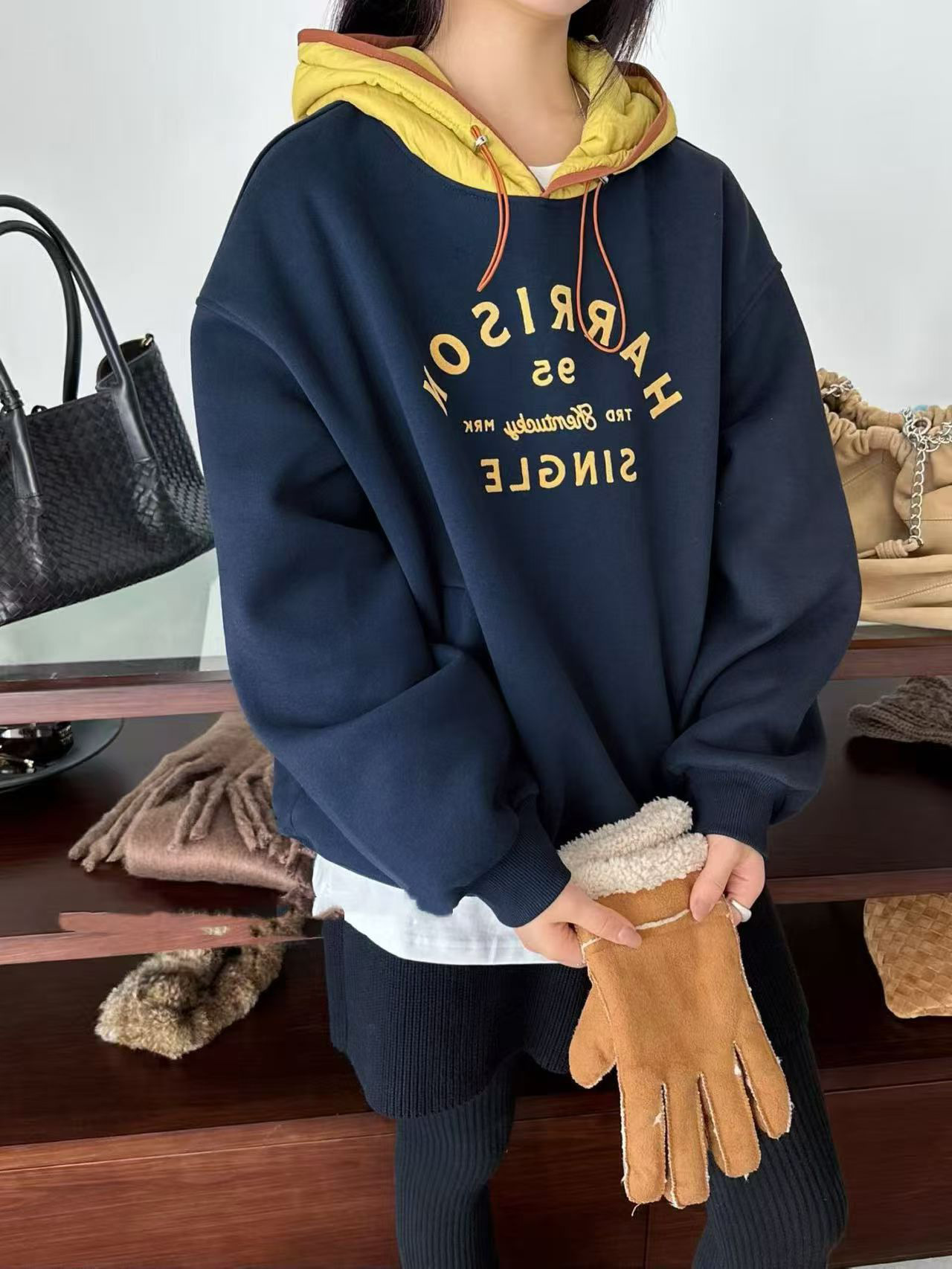 유럽 역 2025 가을 겨울 새로운 유럽 제품 후드 대비 색상 느슨한 캐주얼 게으른 스타일 플러스 벨벳 스웨트 여성 후드
