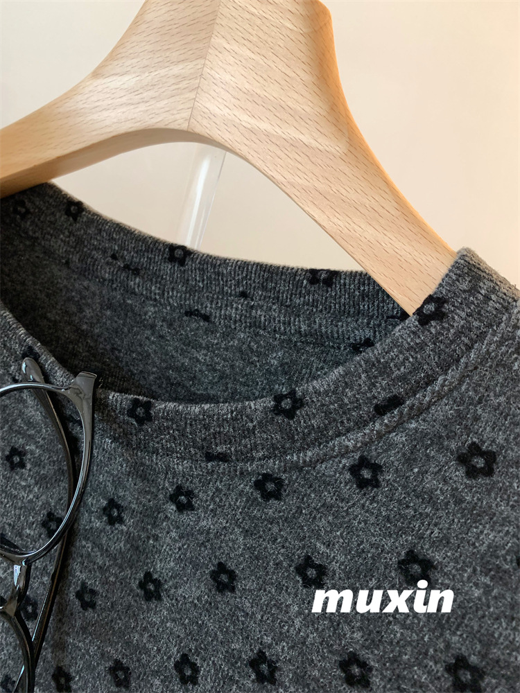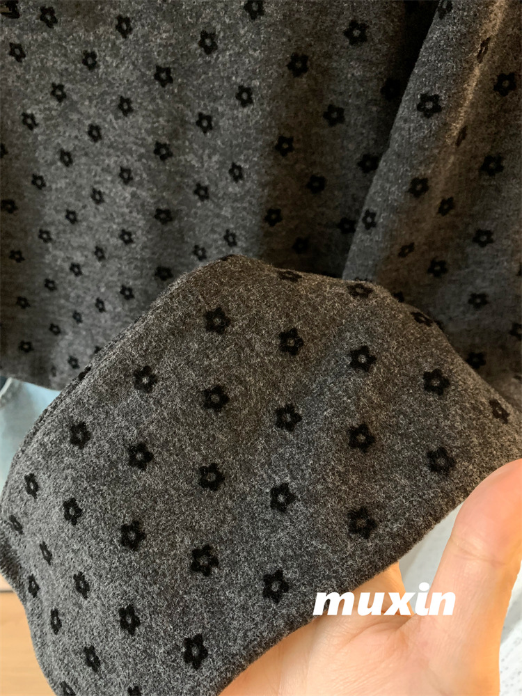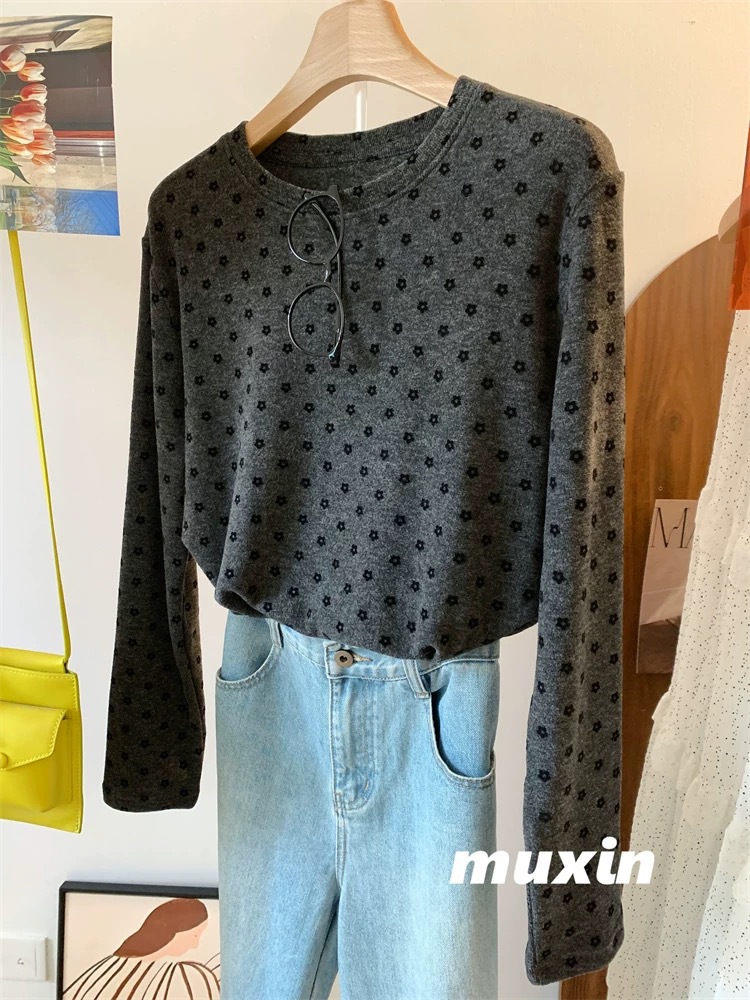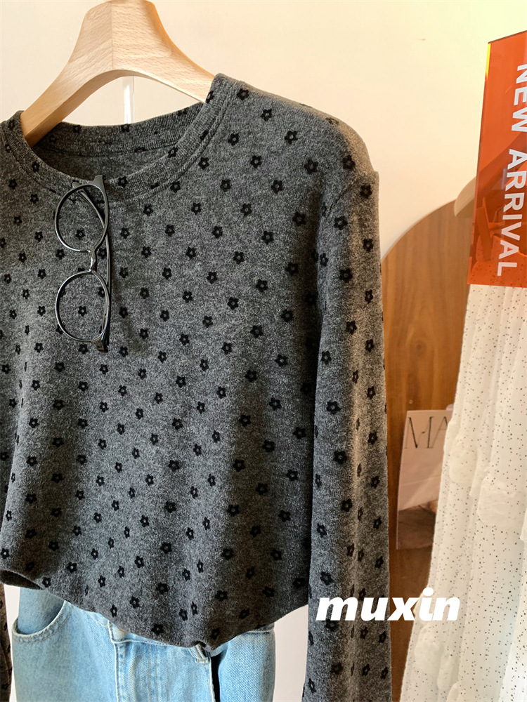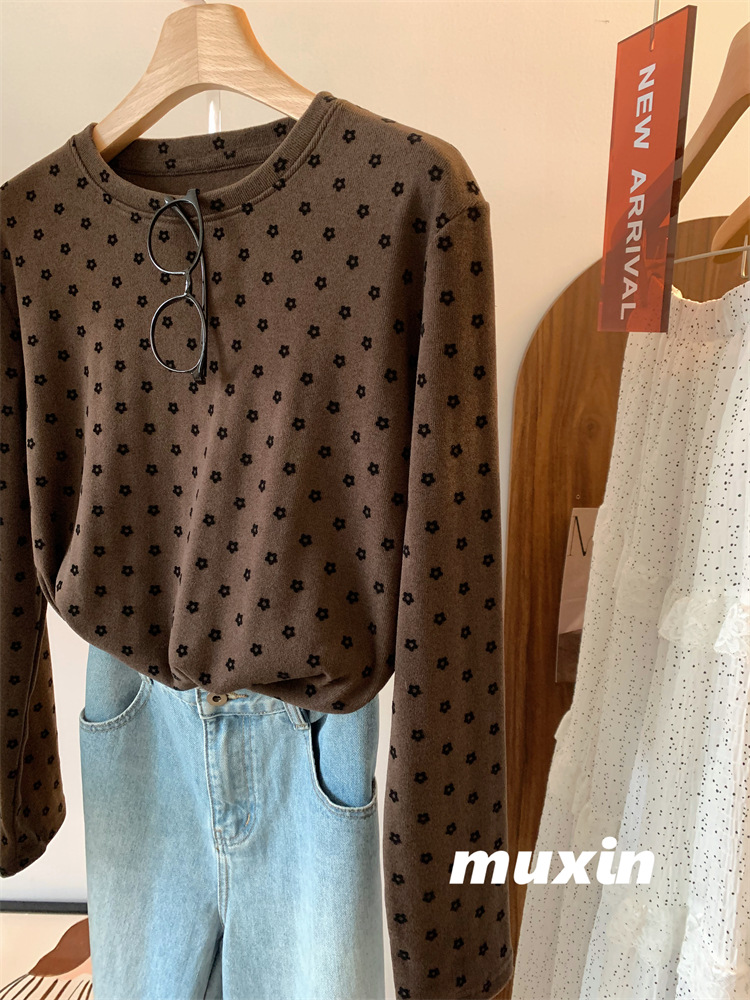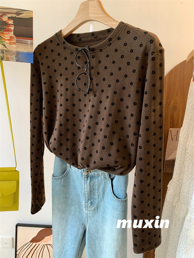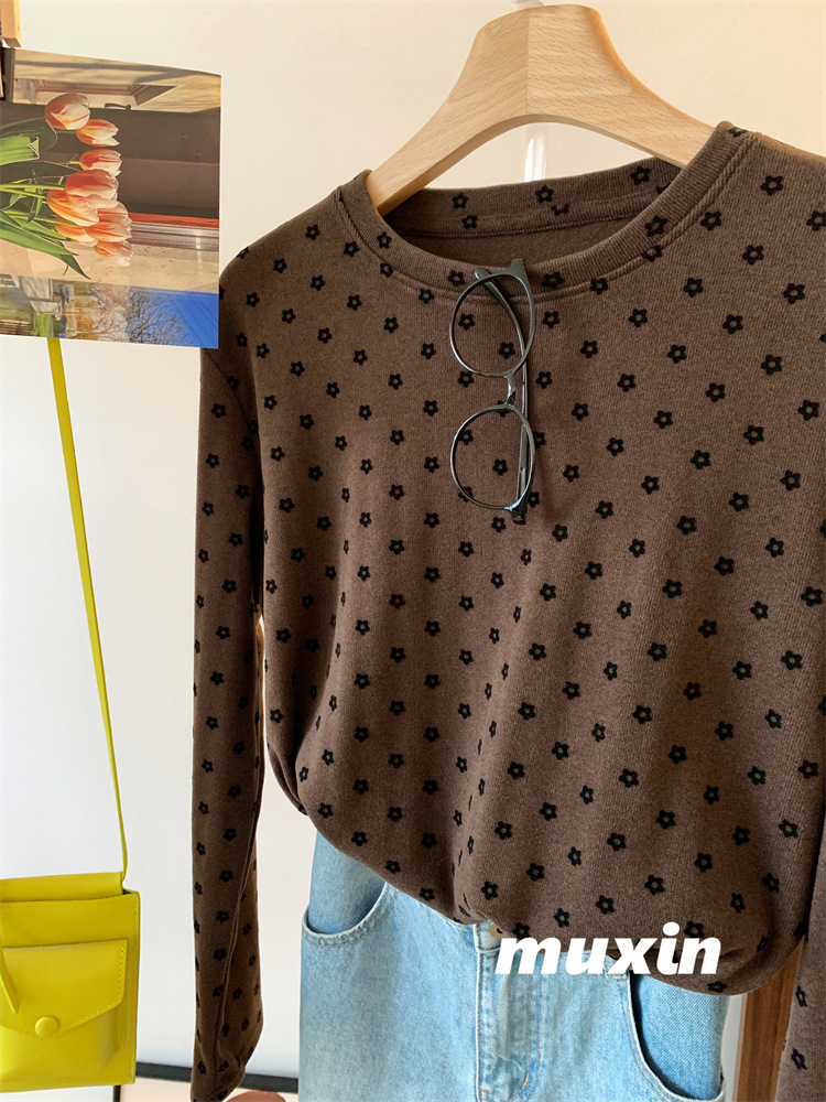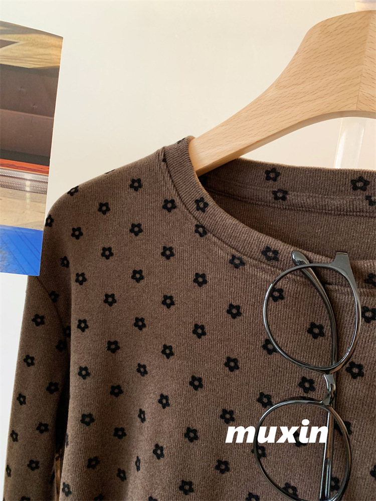 [데롱] 플러스사이즈 100kg 스몰플라워 기모 루즈하고 활용도 높은 탑 한국 패션 가을 겨울 긴팔 티셔츠
