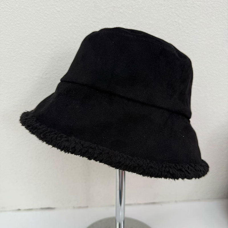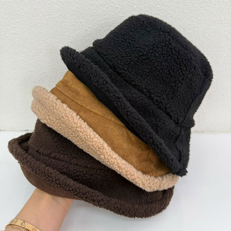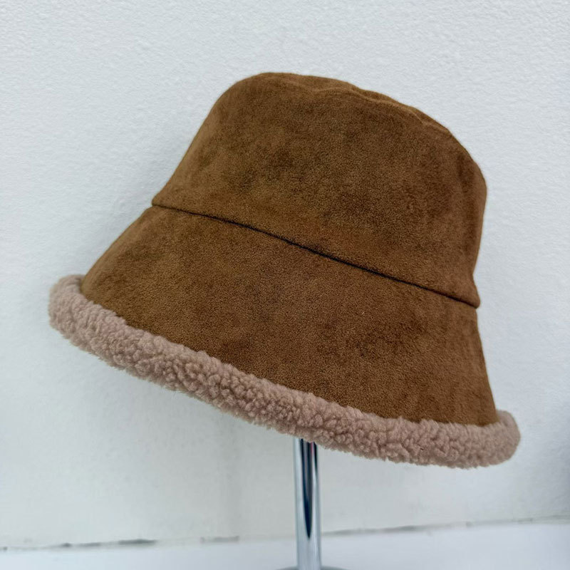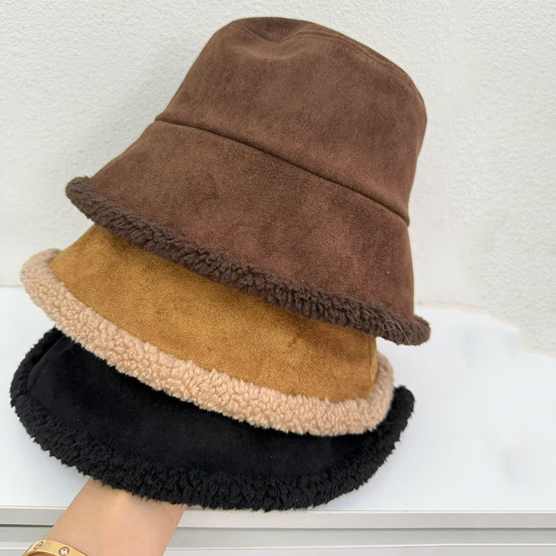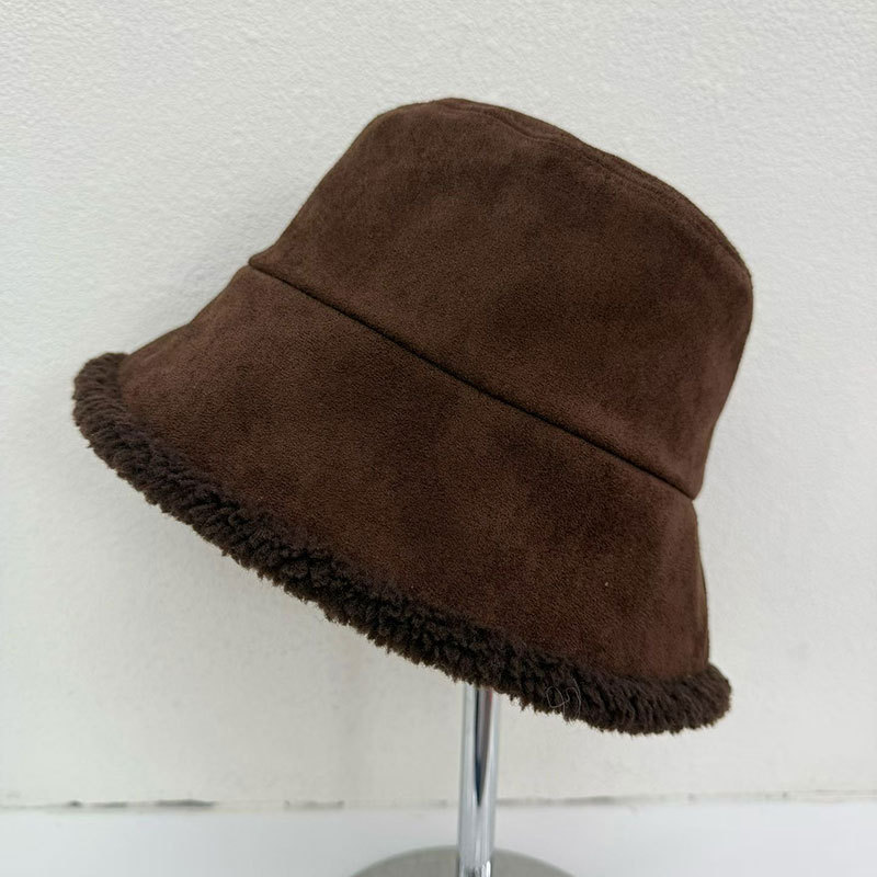 가을 겨울 여성용 스웨이드 버킷 모자 한국식 트렌디하고 다재다능한 두꺼운 따뜻한 램스울 버킷 모자 양면 착용 가능