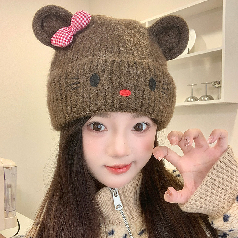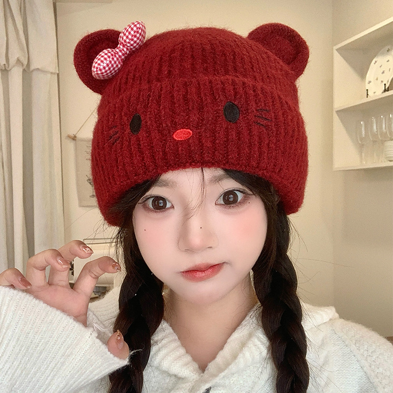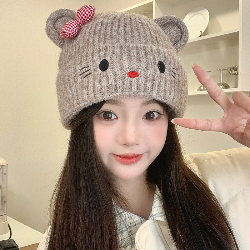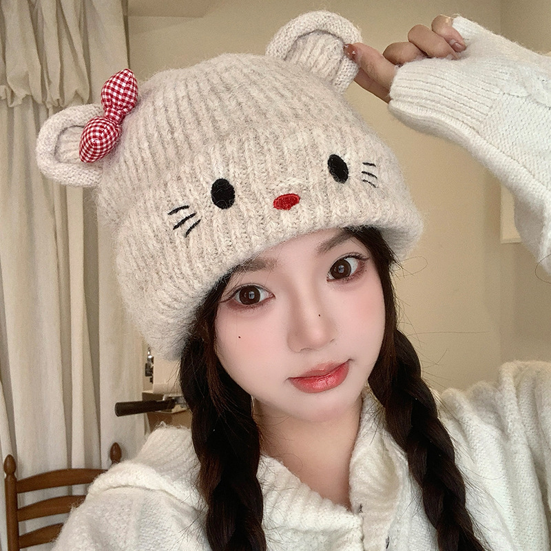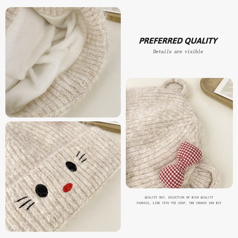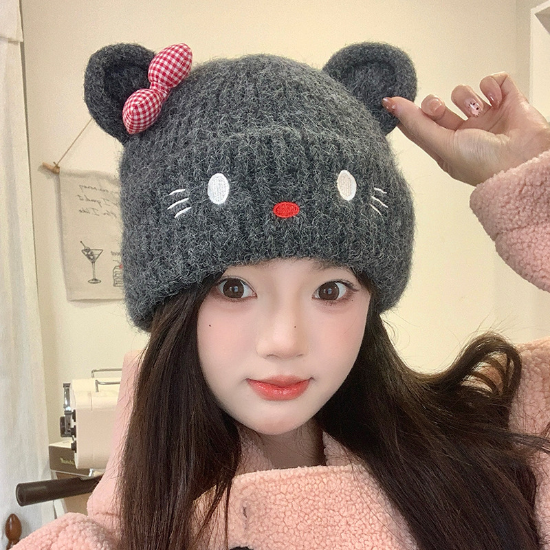 가을 겨울 여성용 귀여운 고양이 귀 모직 모자 일본식 따뜻한 귀 보호 니트 모자 큰 머리 둘레 다용도 방한 모자