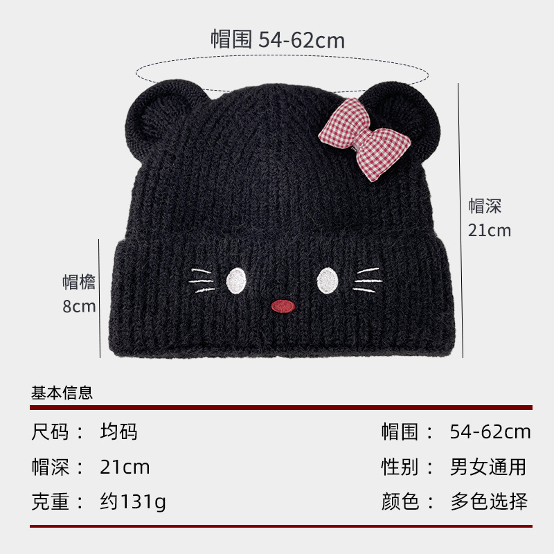 | 颜色 | A-706米色猫咪蝴蝶针织帽, A-706卡其色猫咪蝴蝶针织帽, A-706红色猫咪蝴蝶针织帽, A-706深灰色猫咪蝴蝶针织帽, A-706咖啡色猫咪蝴蝶针织帽, A-706黑色猫咪蝴蝶针织帽 | 尺码 | 56-60CM(大头围) |