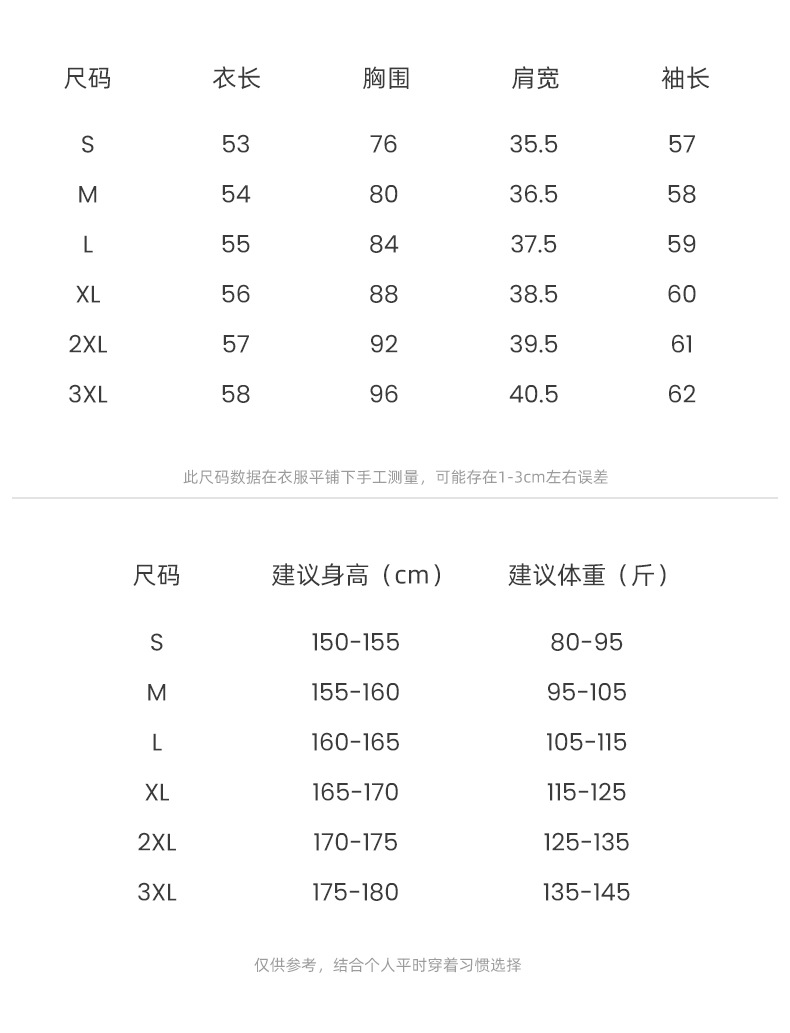| 尺码 | S(80-95斤), M(95-105斤), L(105-115斤), XL(115-125斤), 2XL(125-135斤), 3XL(135-145斤) | 风格类型 | 日韩休闲 |