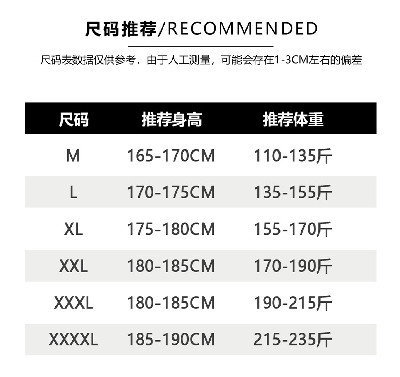 | 颜色 | 黑色, 白灰色, 中灰 | 尺码 | M, L, XL, XXL, XXXL, XXXXL |