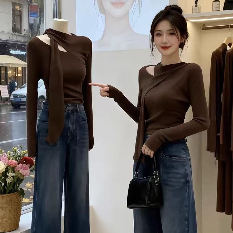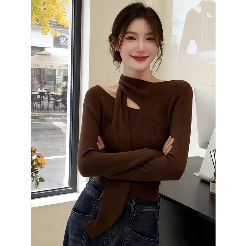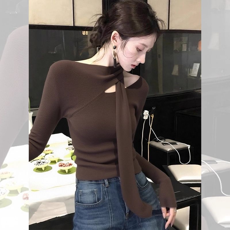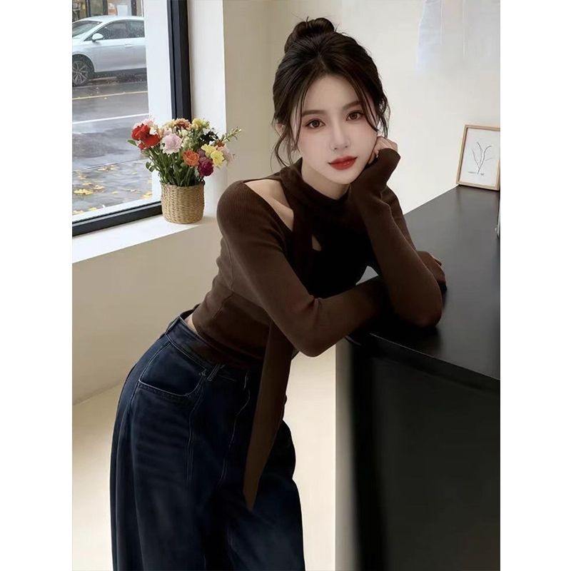 가을 겨울 독특한 갈색 중공 쇄골 긴팔 티셔츠 탑 디자인 핫 소녀 슬림 피트 셔츠 여성용 이너웨어