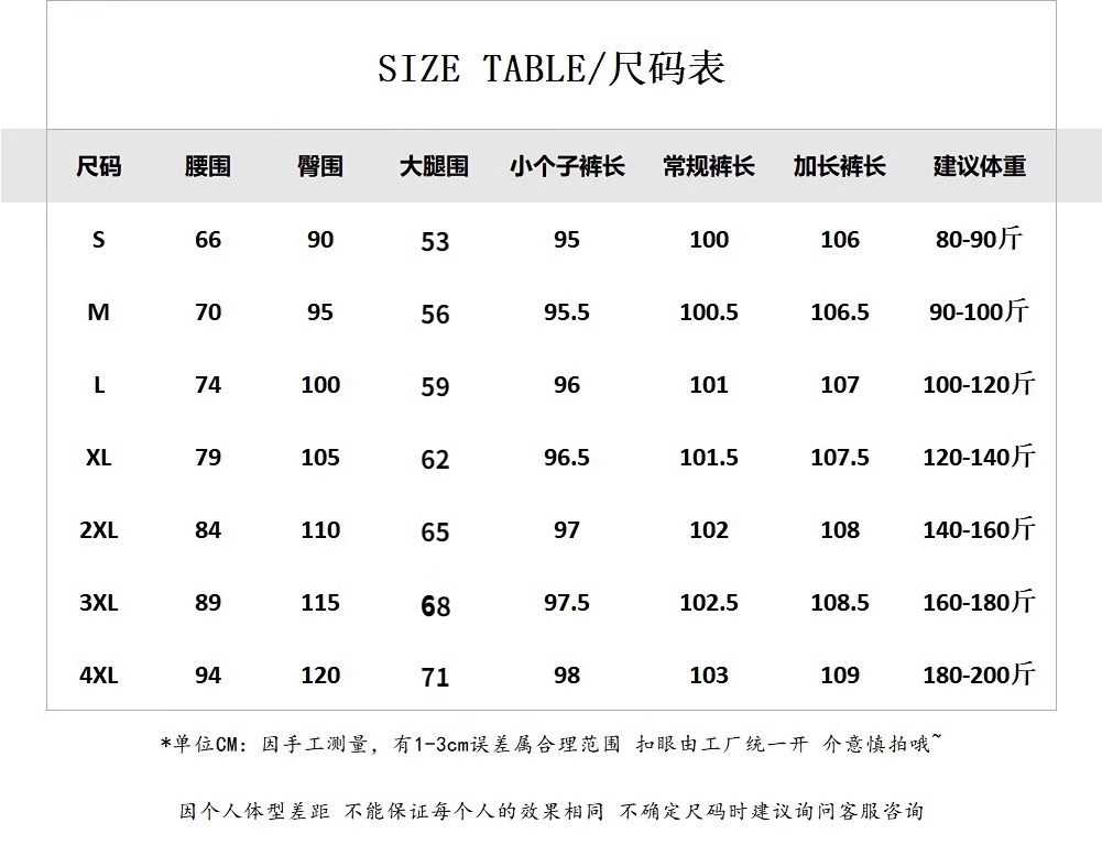 | 颜色 | 藏青色(加绒加厚) 长裤, 藏青色加绒加厚(小个子版), 藏青色加绒加厚(高个子版), 藏青色 长裤 | 尺码 | S 建议80-95斤, M 建议96-105斤, L 建议106-120斤, XL 建议120-140斤, 2XL 建议140-160斤, 3XL 建议160-180斤, 4XL 建议180-200斤 |