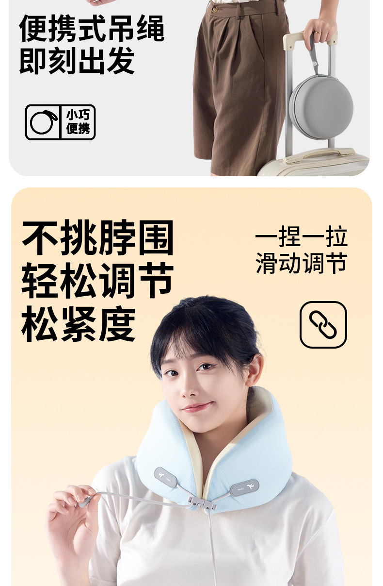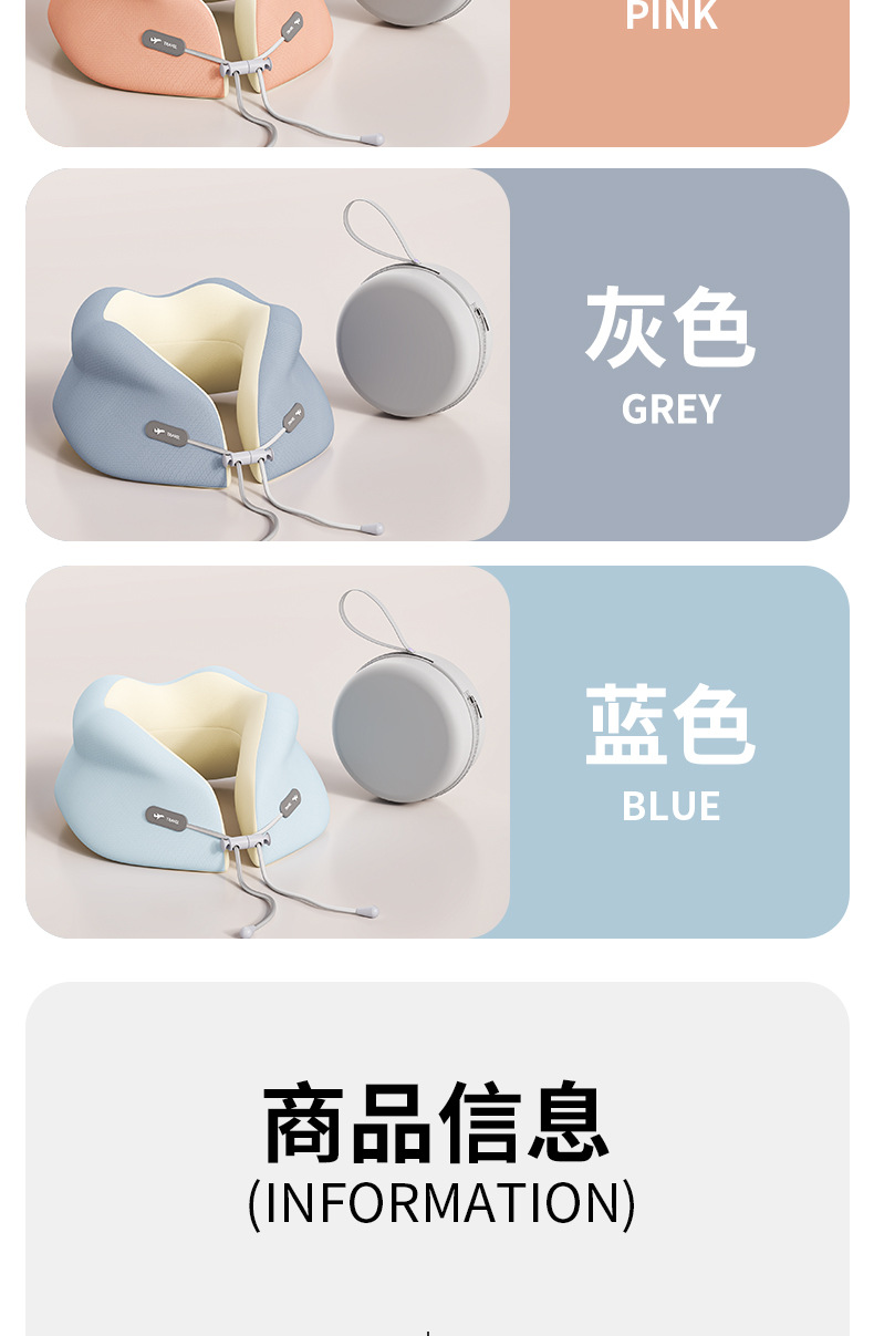 | 颜色 | 雾霾蓝, 天蓝色, 草绿色, 橘色 | 尺寸规格 | 单个颈枕, 颈枕+布圆盒, 颈枕+eva圆盒 |