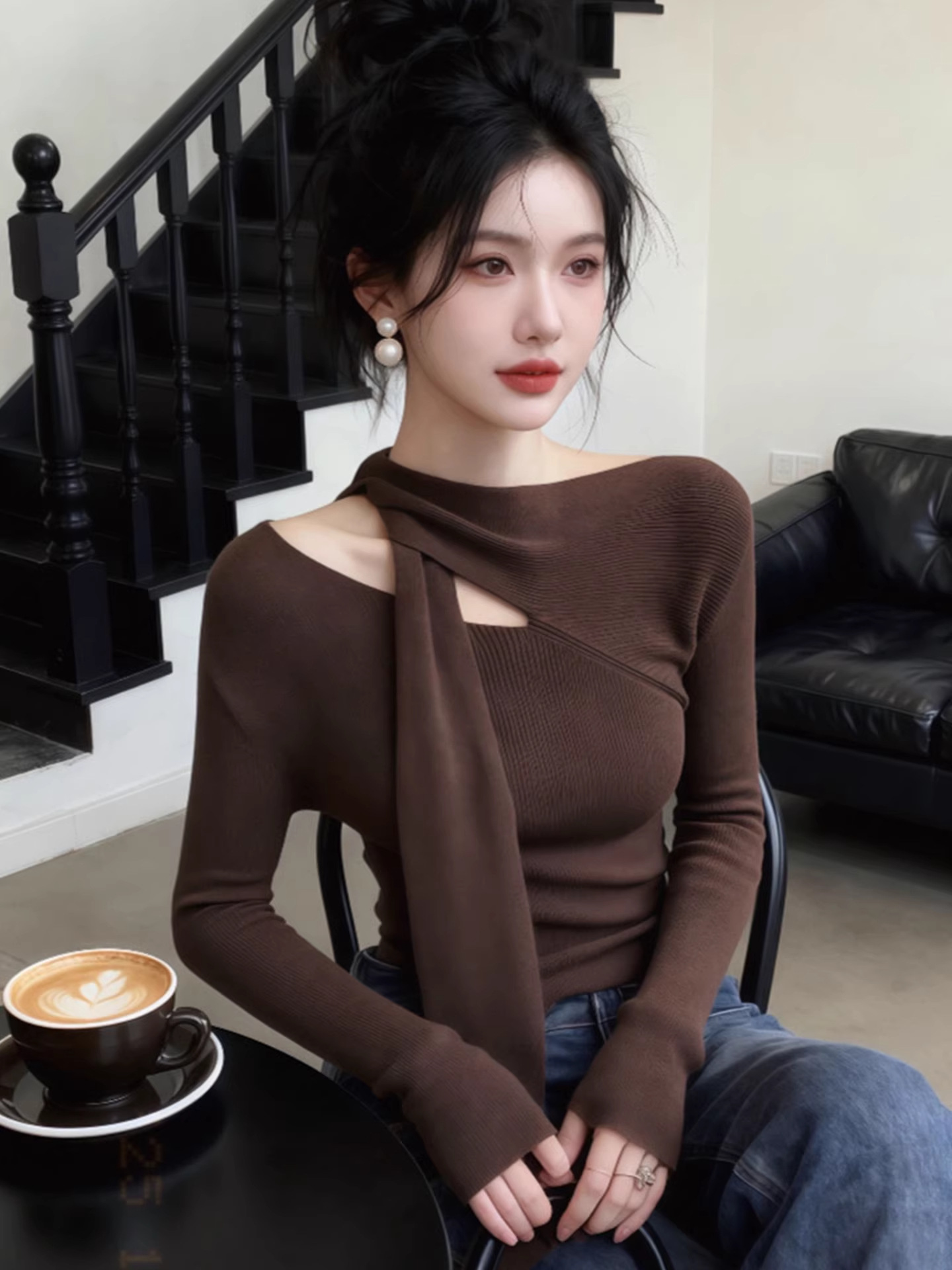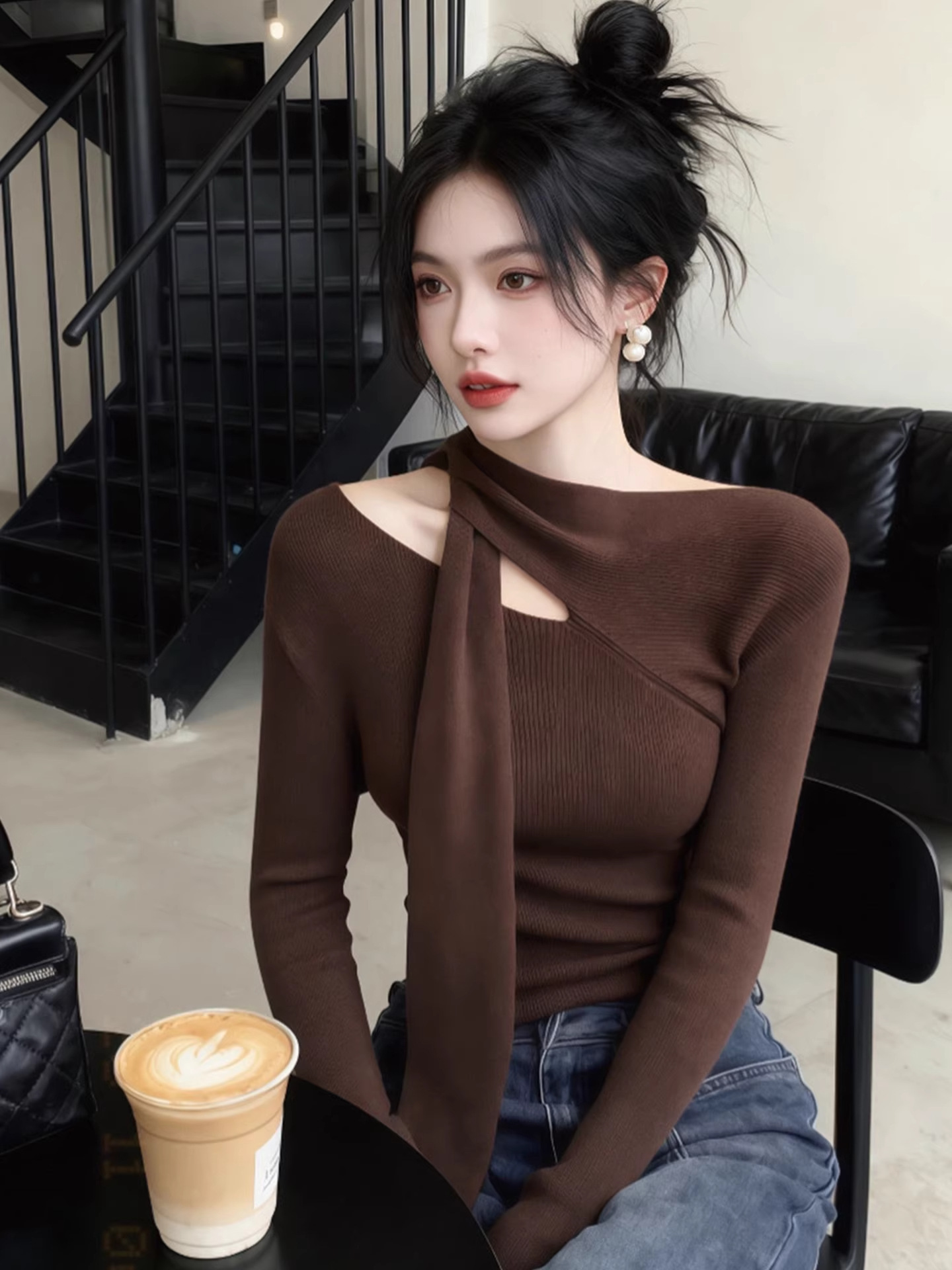 초가을에 매우 아름다운 슬림핏 긴팔 셔츠 탑 2025 가을 겨울 여성용 뉴 커피 컬러 탑