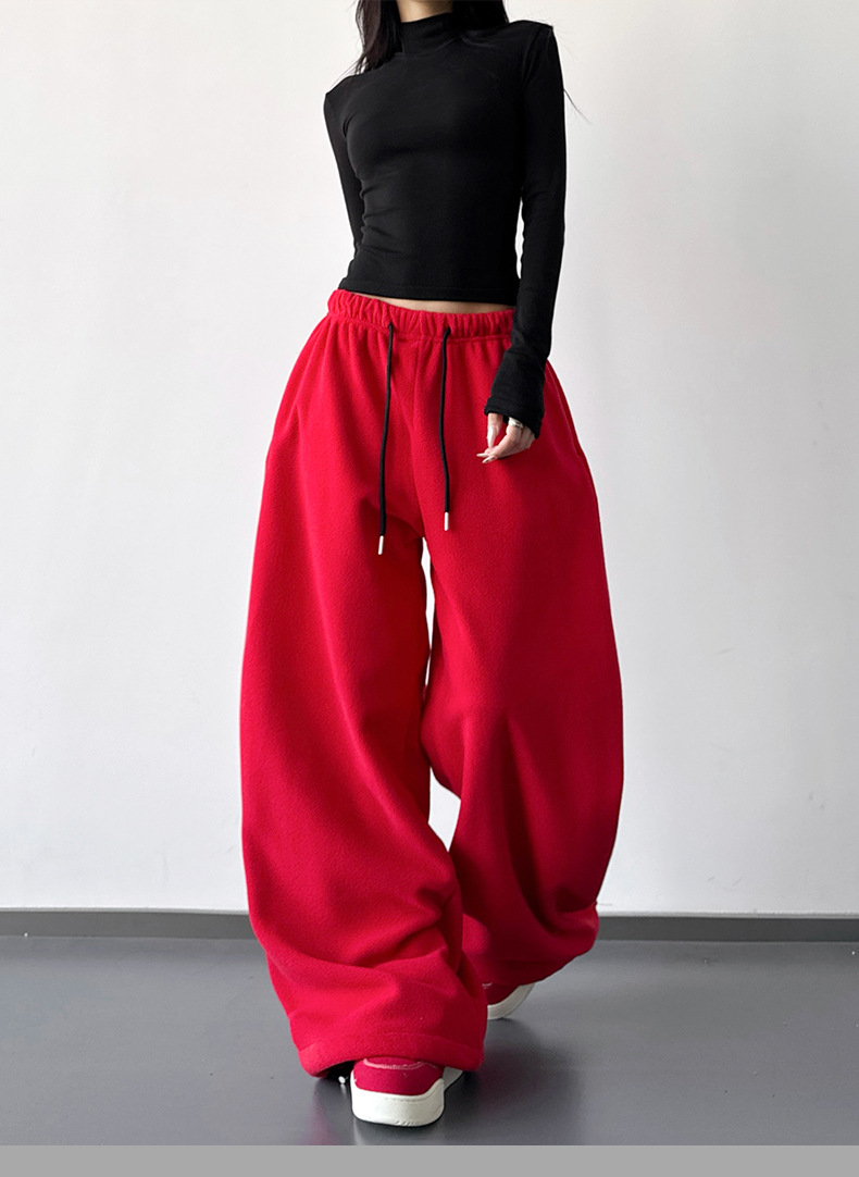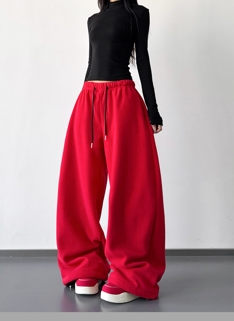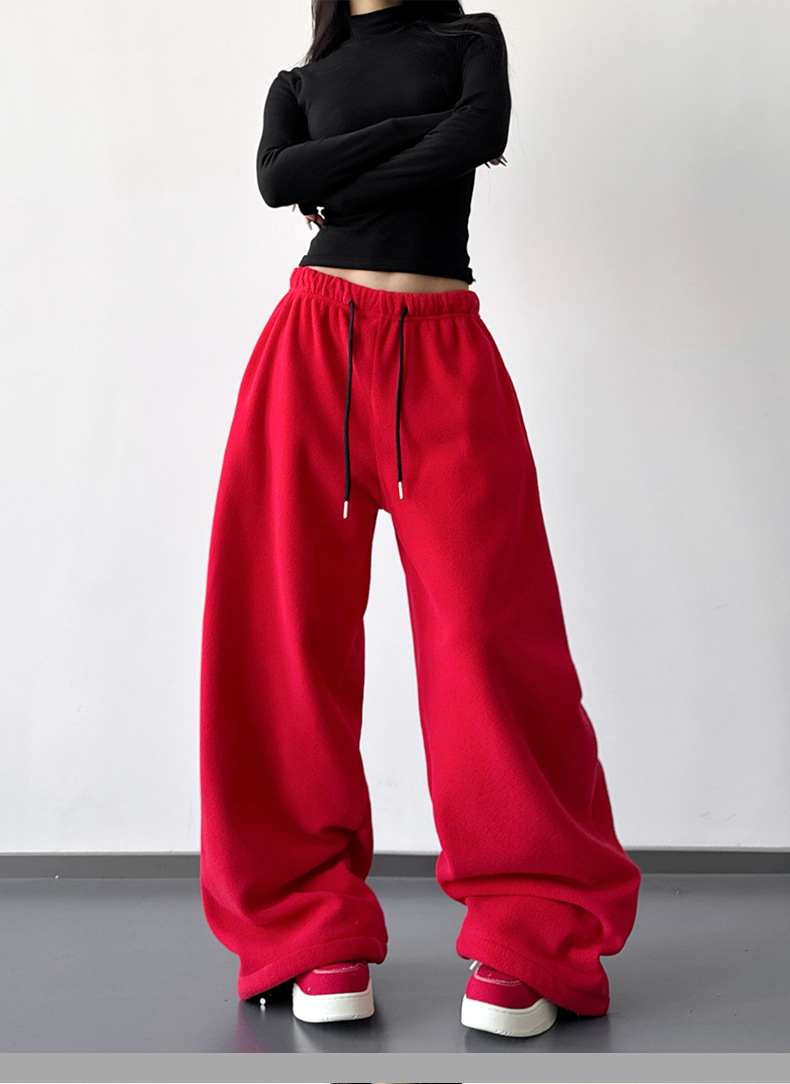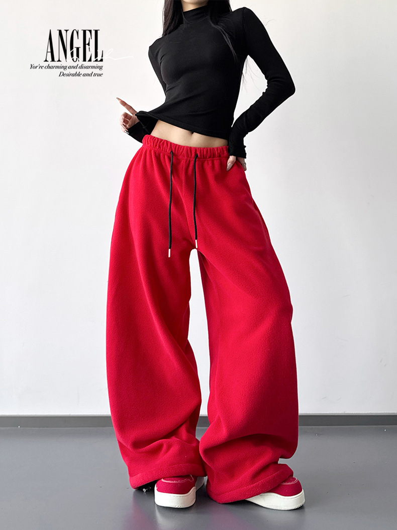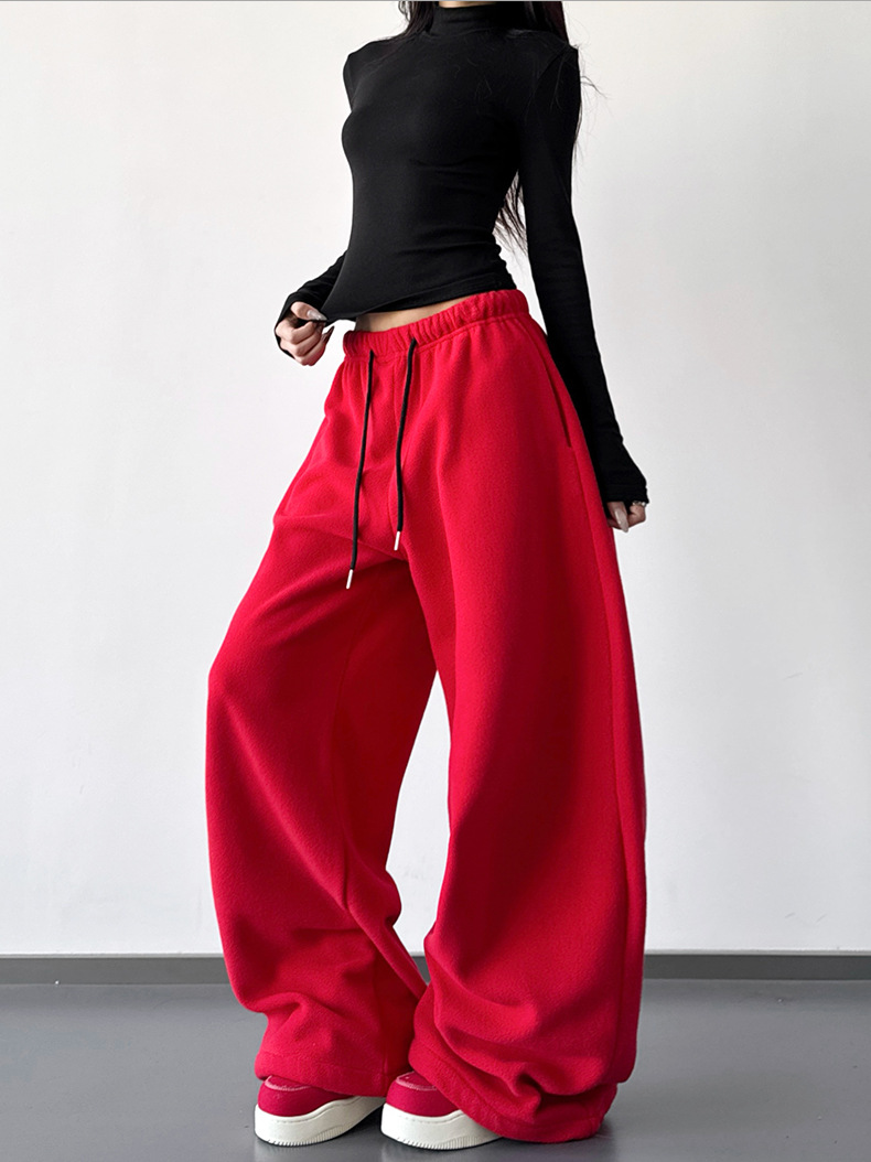 여성을위한 레드 하이 엔드 클린 피트 와이드 레그 팬츠 2025 겨울 신작 캐주얼 바지 루즈 드레이프 스트레이트 스웨트 팬츠