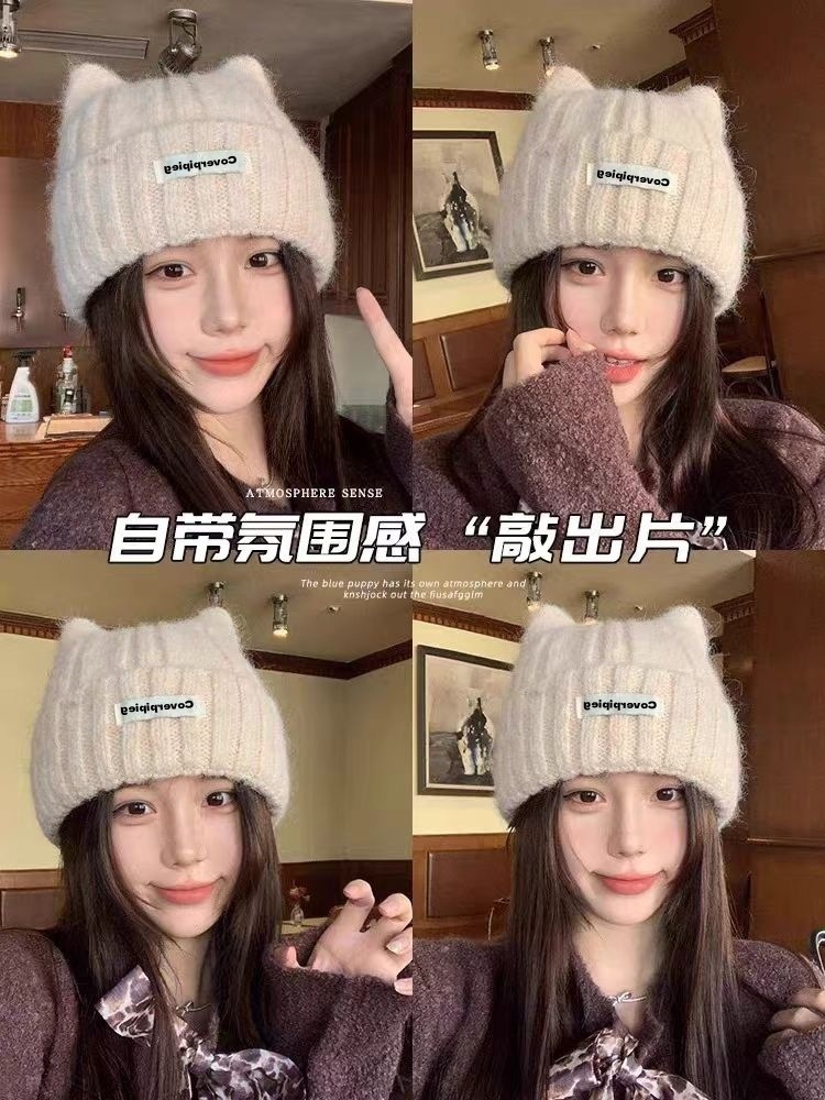 머리 둘레가 큰 여성용 한국 고양이 귀 모직 모자, 가을 겨울 두꺼운 방한 및 따뜻한 니트 플러시 모자