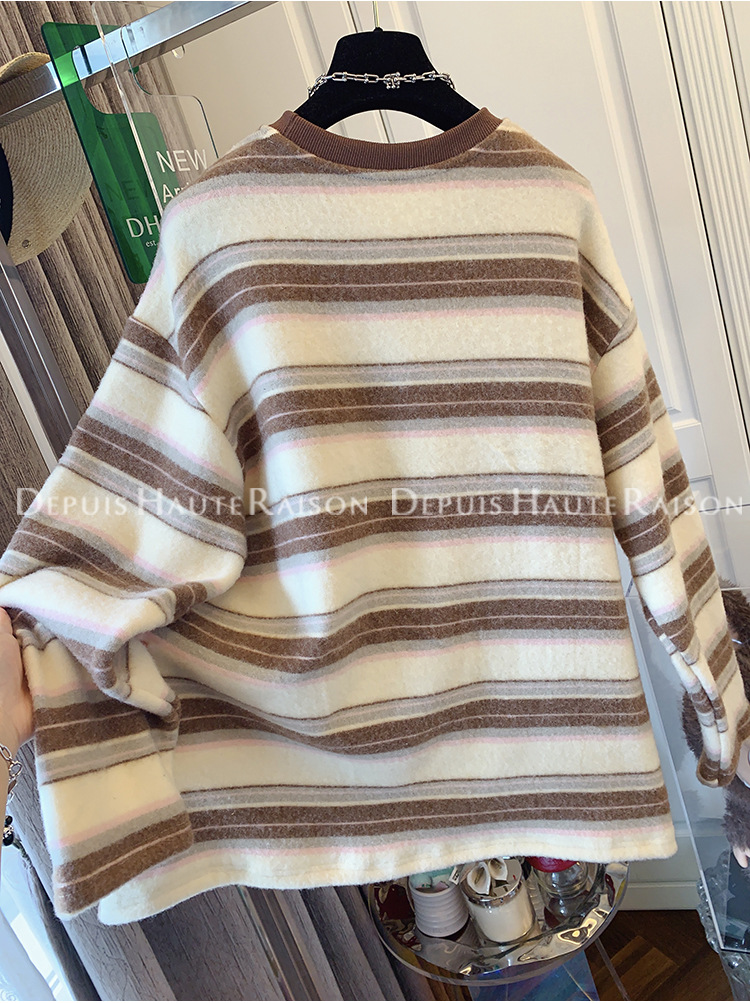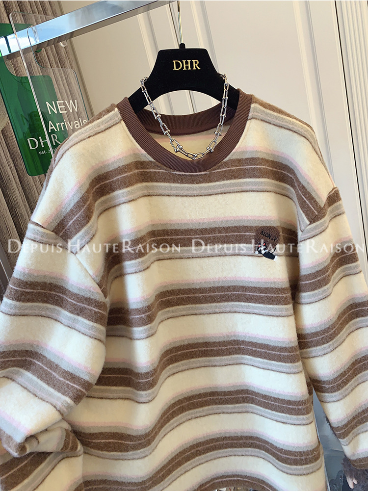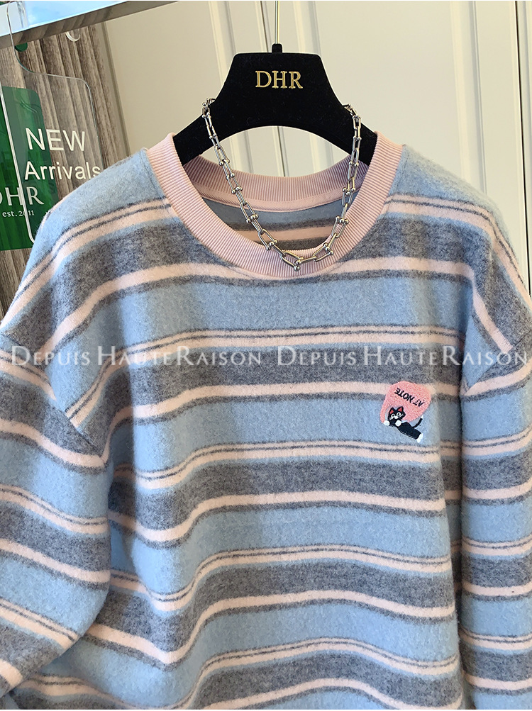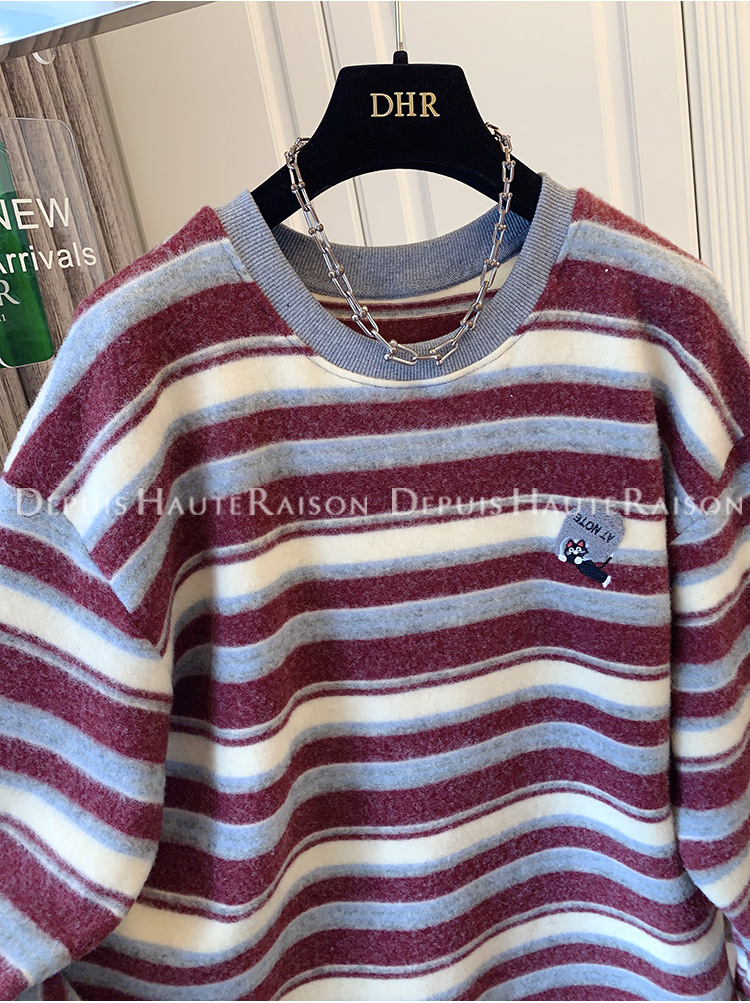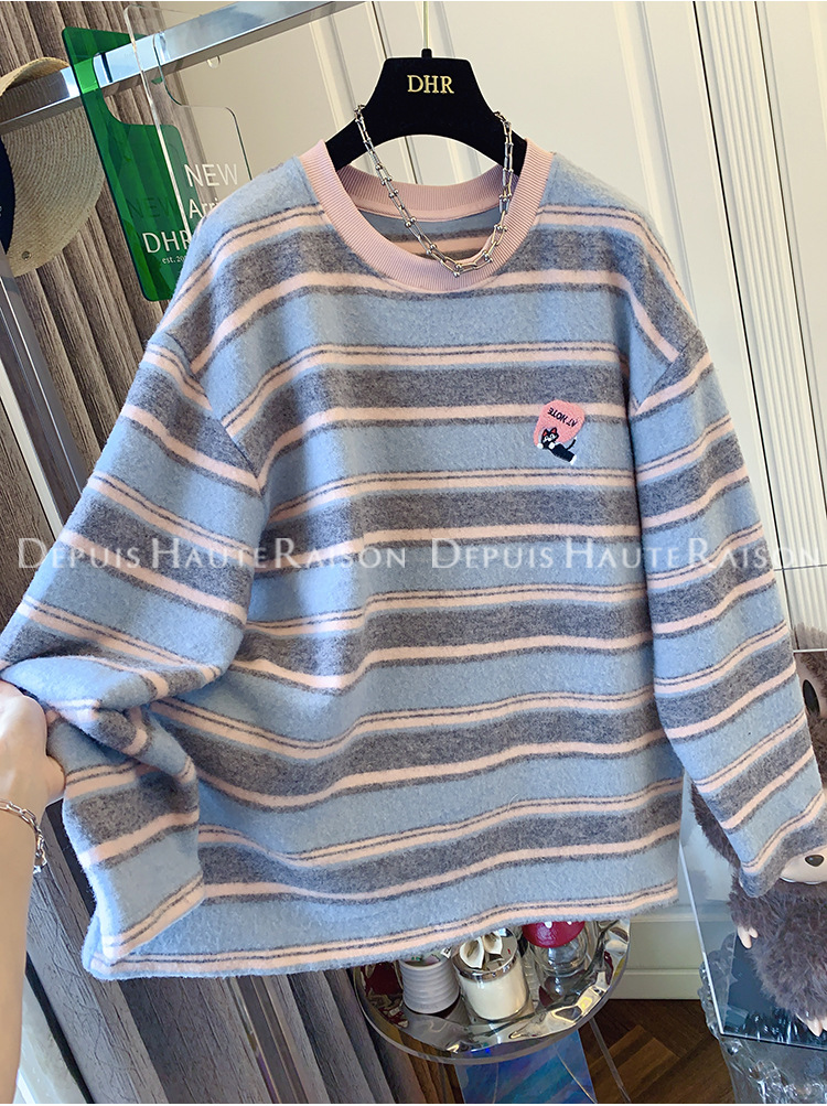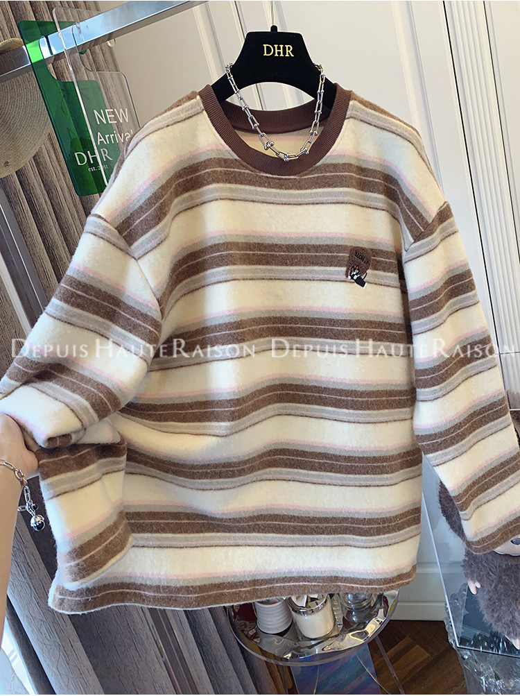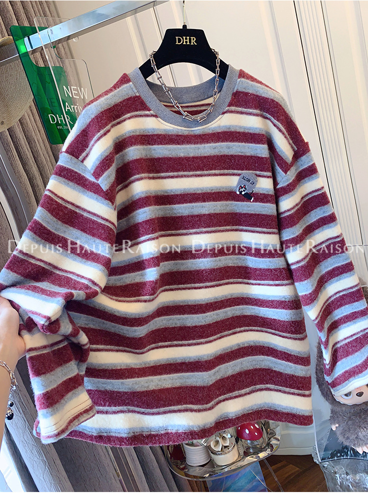 가을 겨울 플러스 사이즈 100kg 다목적 캐주얼 스트라이프 벨벳 긴 소매 만화 자수 티셔츠 루즈 스웨트 여성