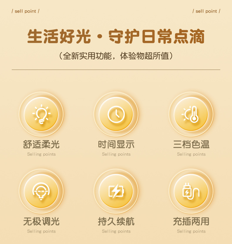 | 适用送礼场合 | 生日, 小礼品, 节日, 乔迁, 展销会, 广告促销, 员工福利, 周年庆典, 商务馈赠, 开业典礼, 颁奖纪念, 公关策划, 其他 | 灯光颜色 | 充插两用/无显示屏【触摸开关+三色温+无极调光】, 充插两用/无显示屏【遥控+触摸开关+三色温+无极调光】, 充插两用/带显示屏【触摸开关+三色温+无极调光】, 充插两用/带显示屏【遥控+触摸开关+三色温+无极调光】 |