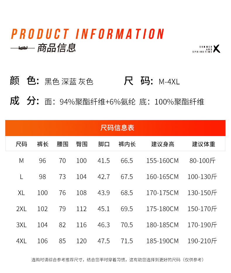 | 颜色 | 黑色, 灰色, 深蓝色 | 尺码 | M, L, XL, 2XL, 3XL, 4XL |