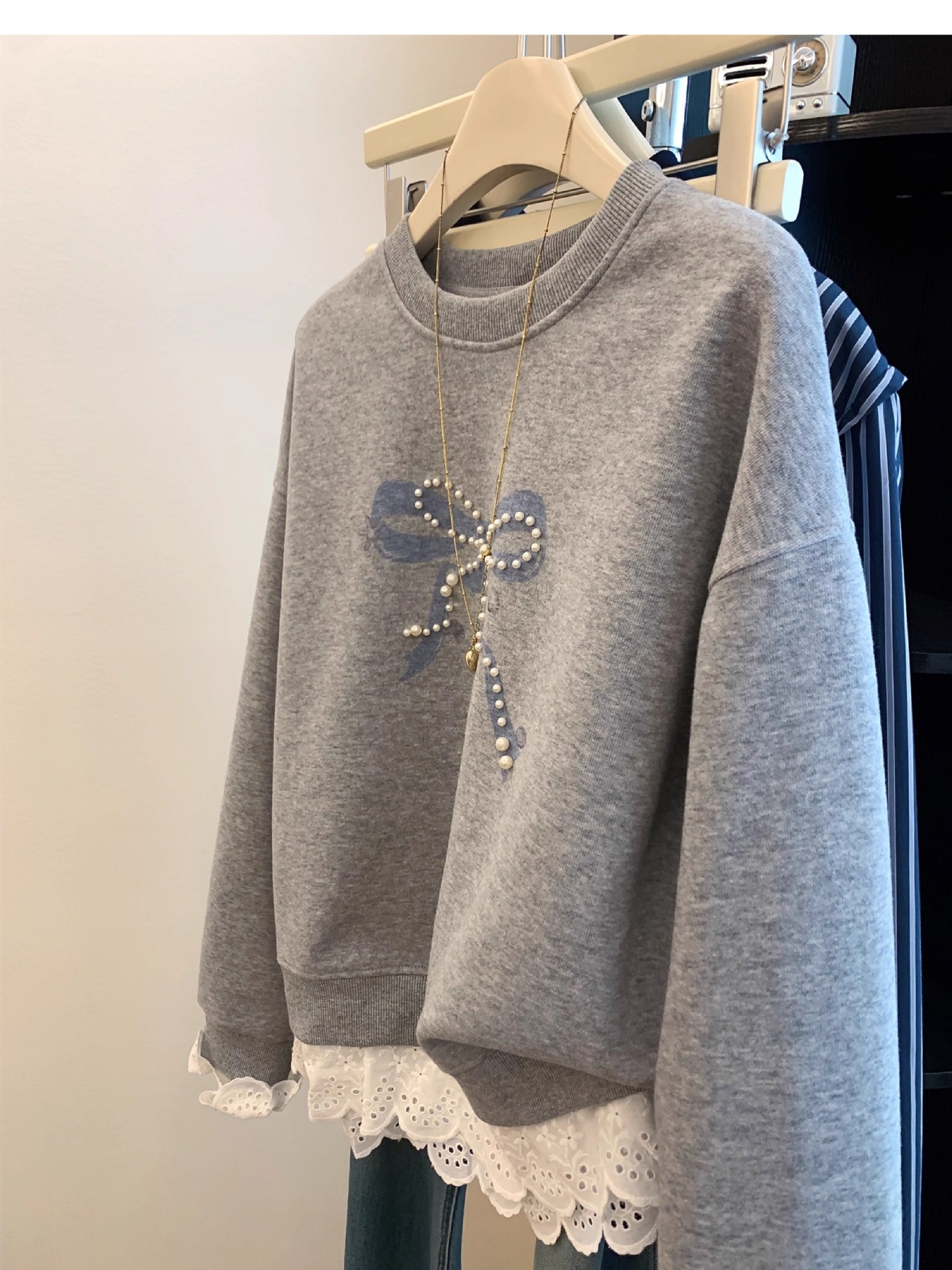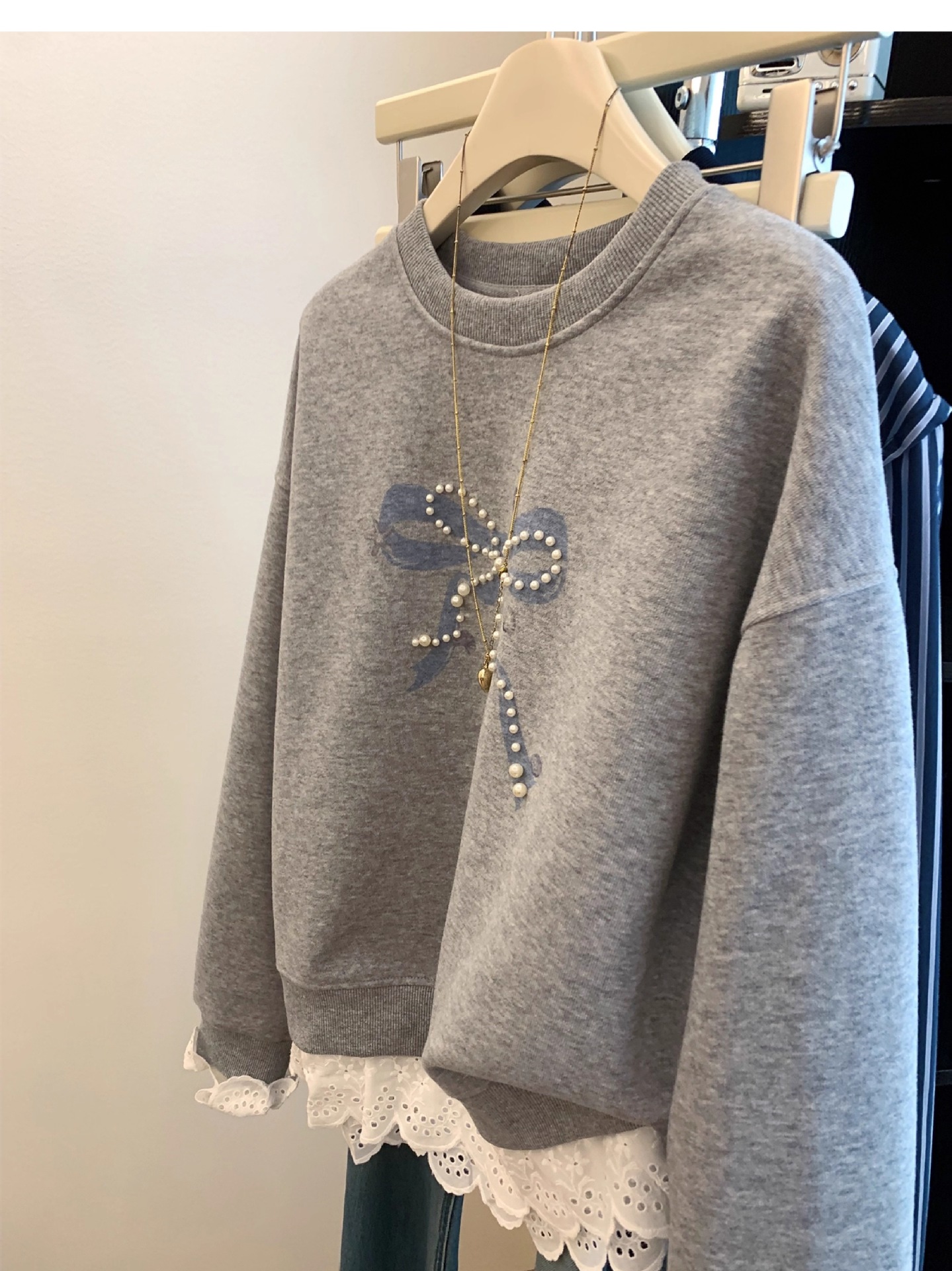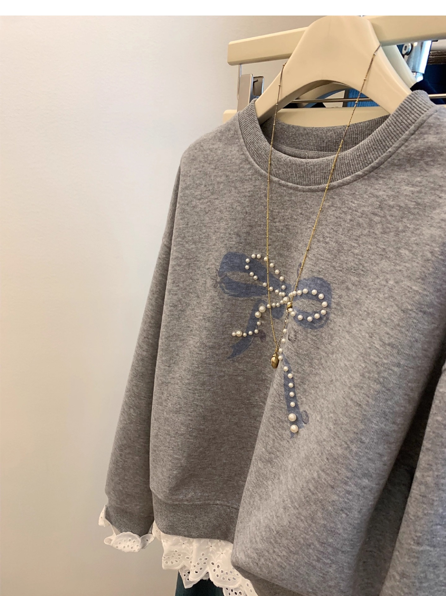 Hua Cotton + Real Super Plus Size 120kg 헤비 비즈 보우 연령 감소 다용도 플러스 벨벳과 레이스 스웨트셔츠