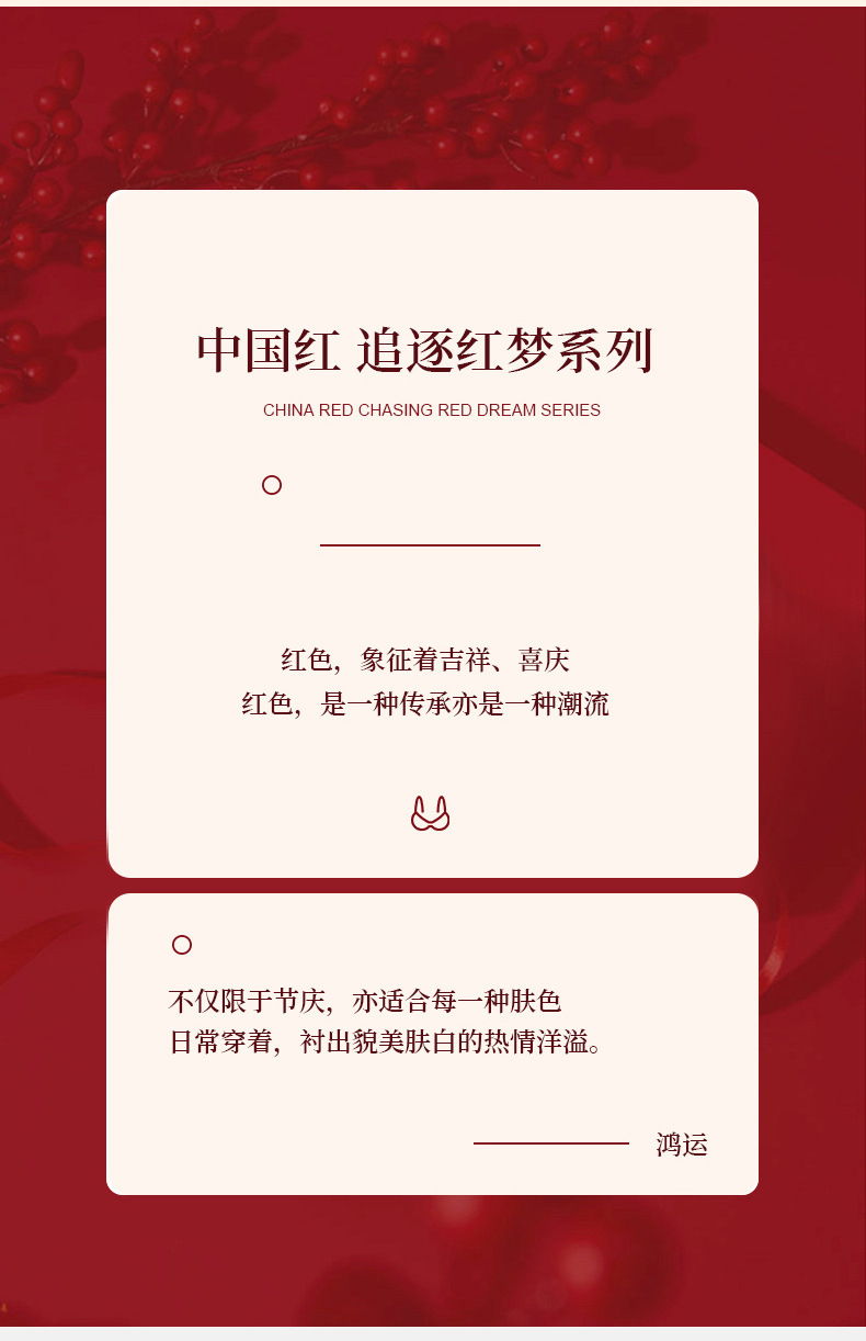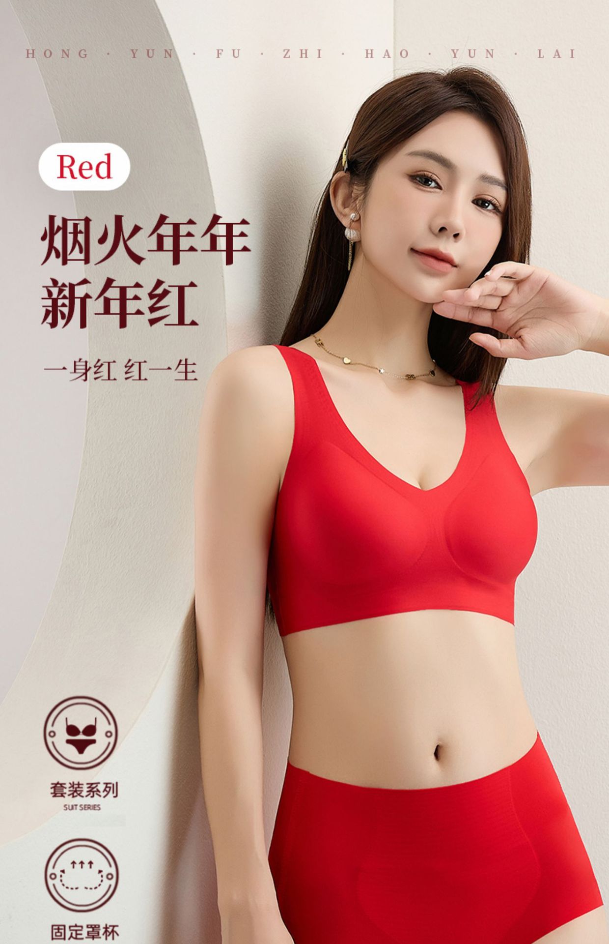 | 主要销售渠道 | 淘宝, 超市, 商场, 品牌店, 天猫, 个体实体 | 颜色 | 大红圆领内衣 (全固定不跑杯 裸感舒适), 大红圆领套装 (全固定不跑杯 裸感舒适), 大红圆领套装礼盒装【内衣+内裤+礼盒】, 大红圆领套装礼盒装【内衣+内裤+礼盒+红袜】 |