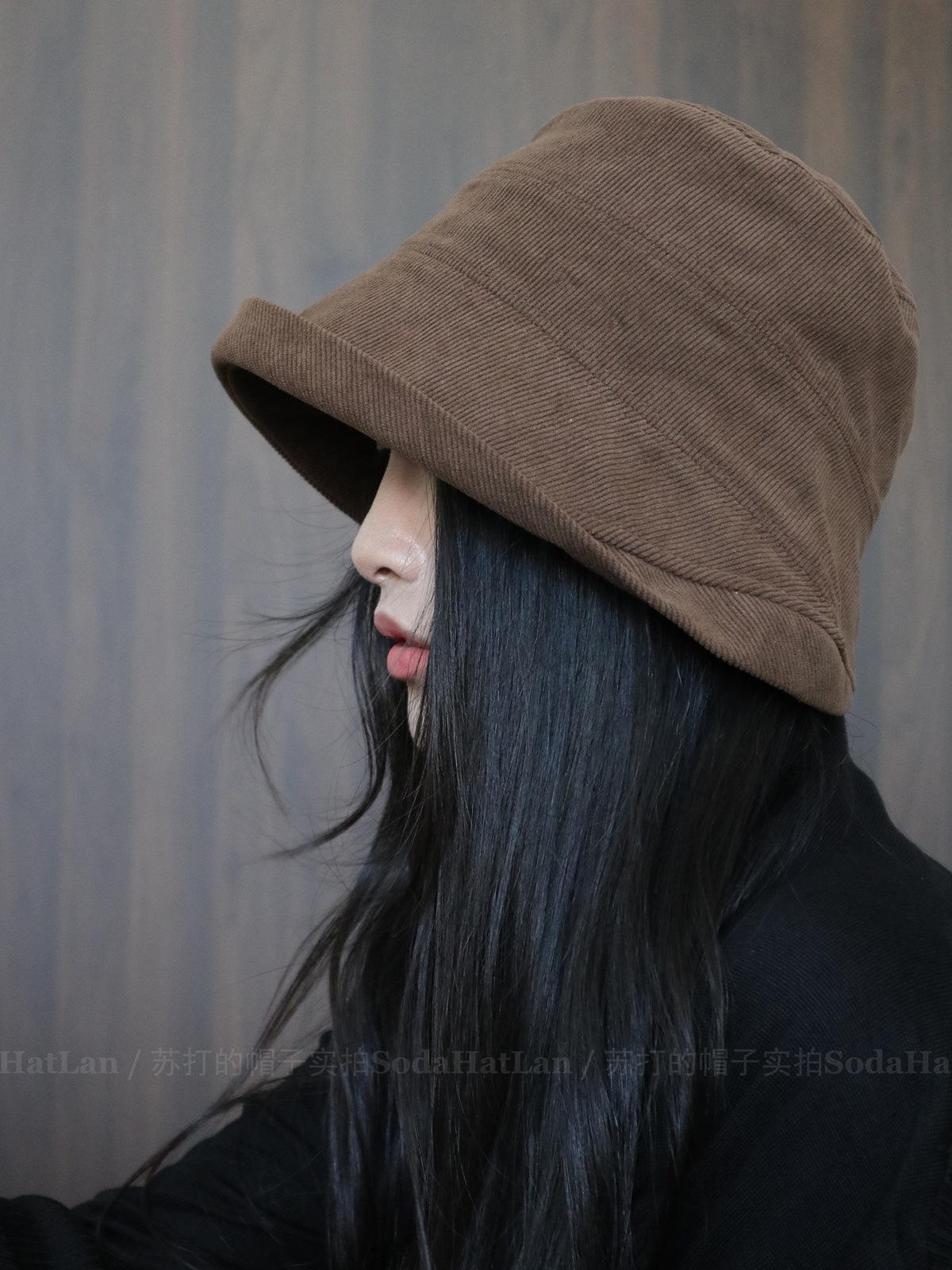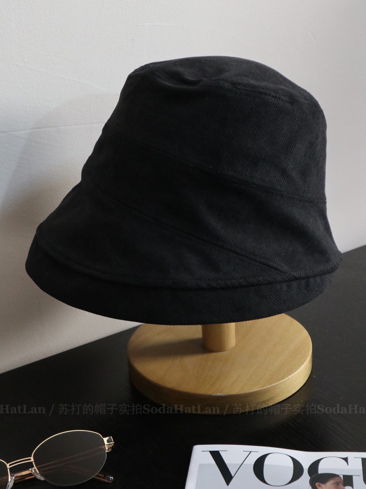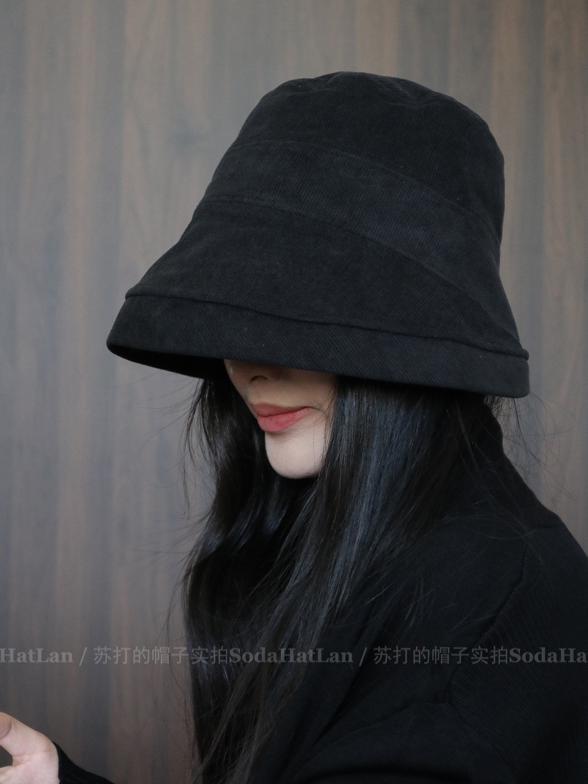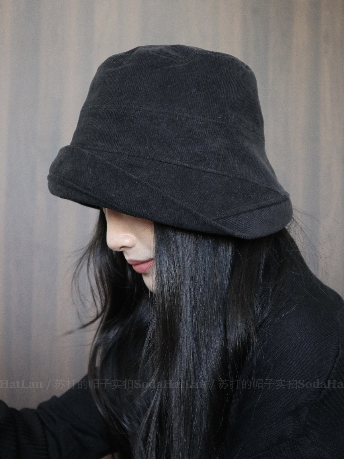 가을 겨울 여성용 블랙 워리어 스타일 고급 코듀로이 버킷햇, 머리둘레가 크고 얼굴이 작아 메이크업을 하지 않은 얼굴을 가리는 캡, 램프갓캡