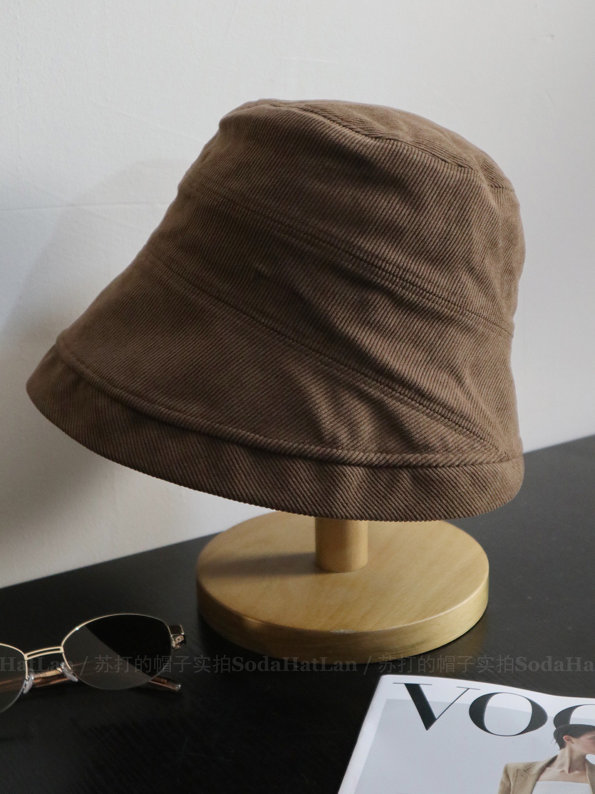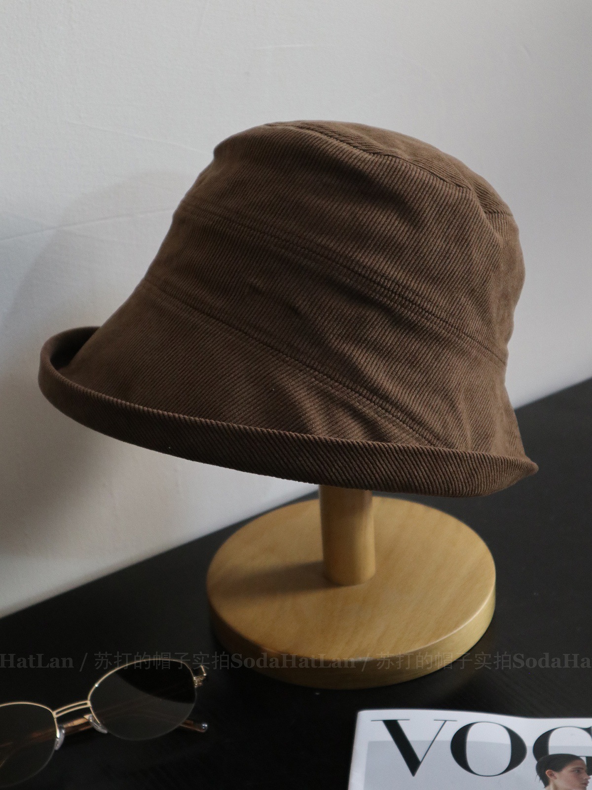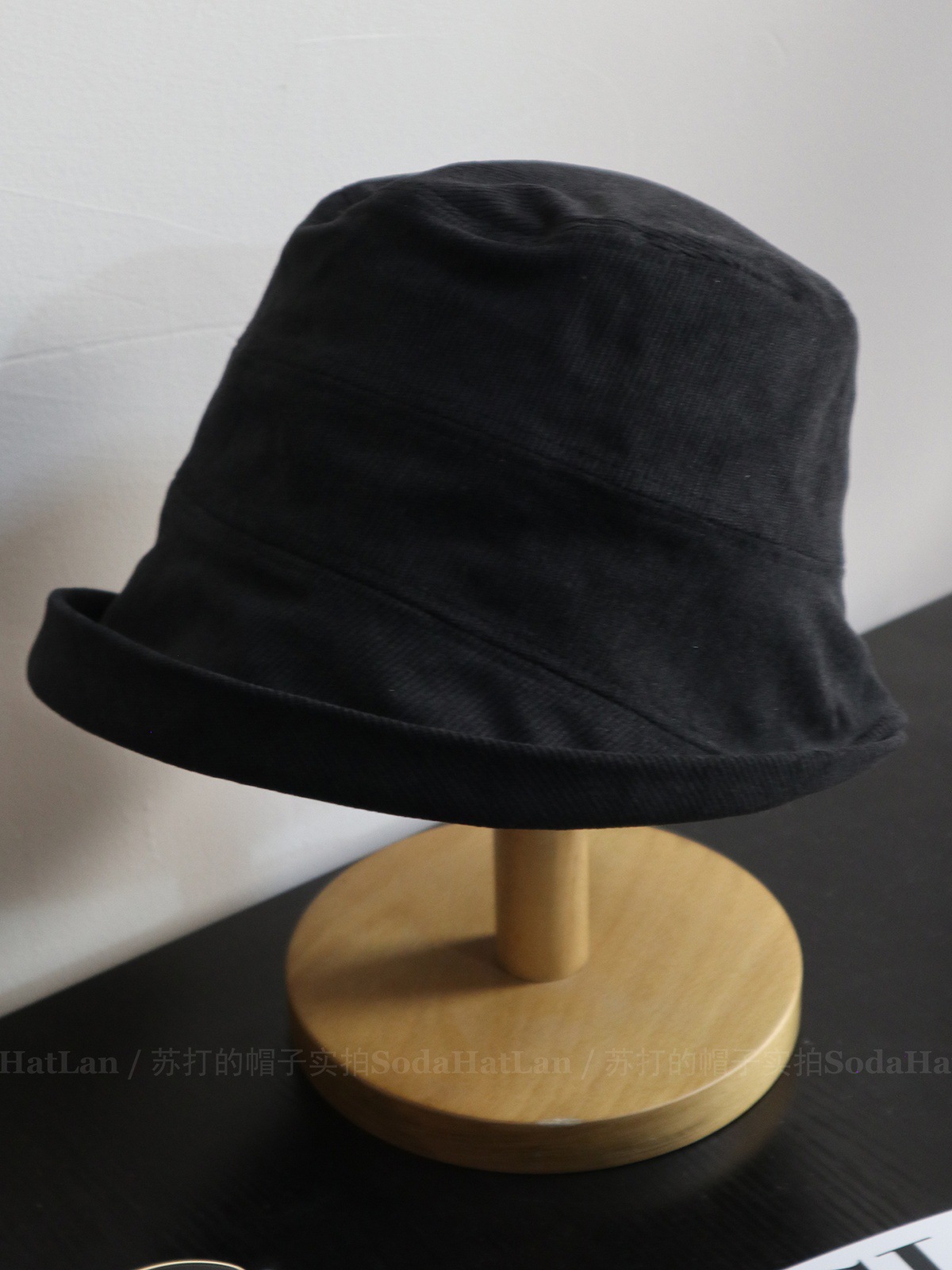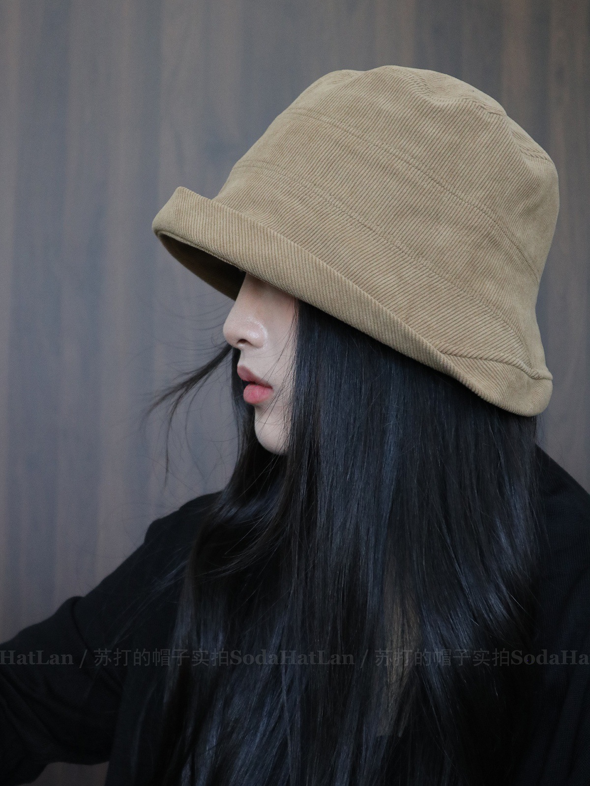 가을 겨울 여성용 블랙 워리어 스타일 고급 코듀로이 버킷햇, 머리둘레가 크고 얼굴이 작아 메이크업을 하지 않은 얼굴을 가리는 캡, 램프갓캡