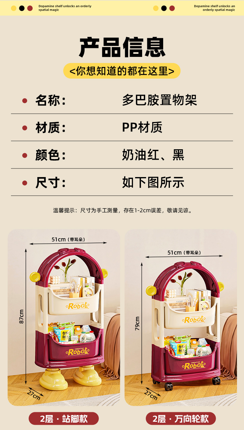 | 颜色 | 二层-轮子款-红黑, 二层-轮子款-红白, 三层-轮子款-红黑, 三层-轮子款-红白, 二层-带脚款-红黑, 二层-带脚款-红白, 三层-带脚款-红黑, 三层-带脚款--红白 | 规格 | 无规格 |