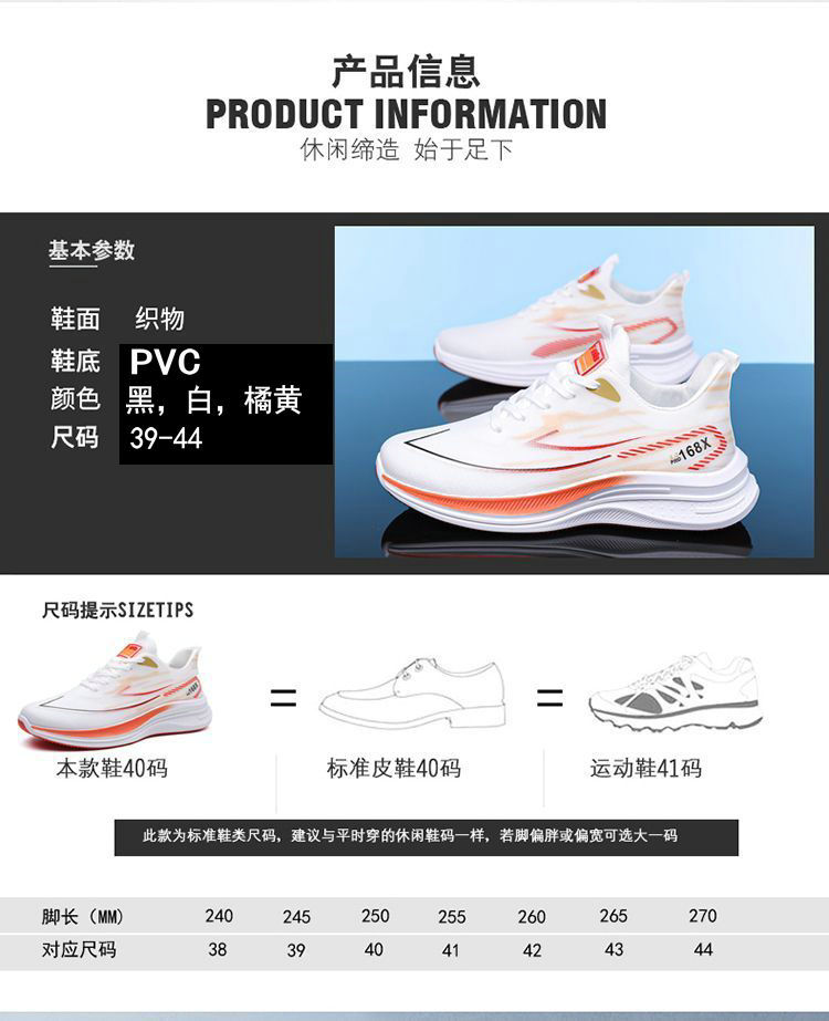 | 颜色 | 白色, 黑色, 橘色 | 尺码 | 39, 40, 41, 42, 43, 44 |